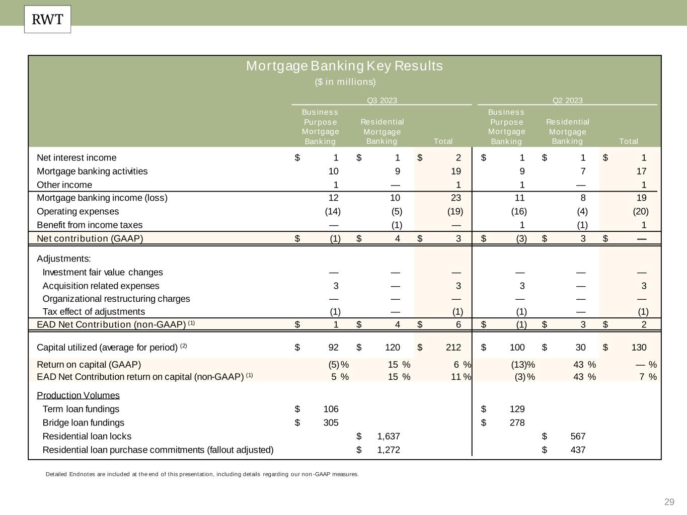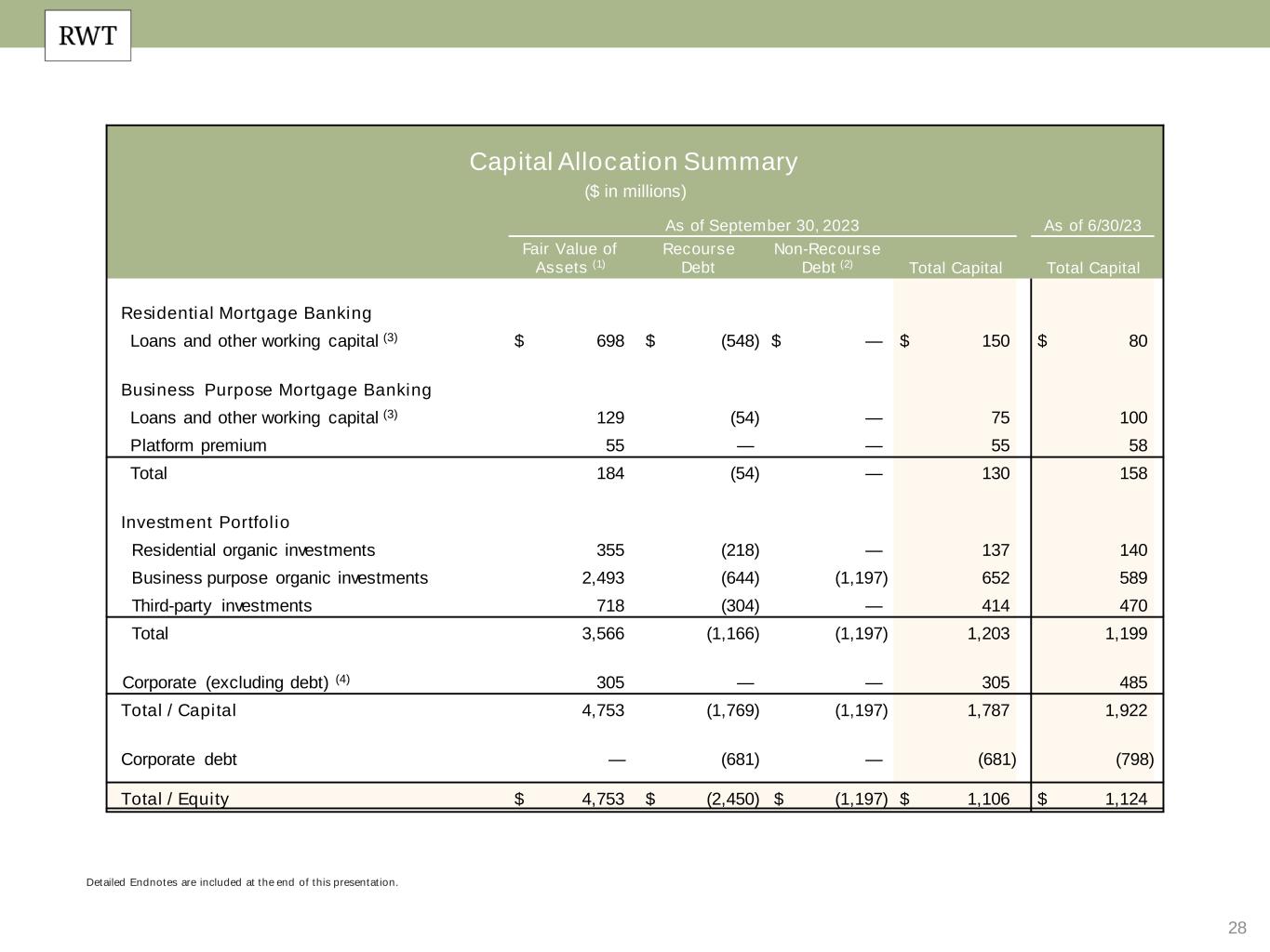 28 Detailed Endnotes are included at the end of this presentation. Capital Allocation Summary ($ in millions) As of September 30, 2023 As of 6/30/23 Fair Value of Assets (1) Recourse Debt Non-Recourse Debt (2) Total Capital Total Capital Residential Mortgage Banking Loans and other working capital (3) $ 698 $ (548) $ — $ 150 $ 80 Business Purpose Mortgage Banking Loans and other working capital (3) 129 (54) — 75 100 Platform premium 55 — — 55 58 Total 184 (54) — 130 158 Investment Portfolio Residential organic investments 355 (218) — 137 140 Business purpose organic investments 2,493 (644) (1,197) 652 589 Third-party investments 718 (304) — 414 470 Total 3,566 (1,166) (1,197) 1,203 1,199 Corporate (excluding debt) (4) 305 — — 305 485 Total / Capital 4,753 (1,769) (1,197) 1,787 1,922 Corporate debt — (681) — (681) (798) Total / Equity $ 4,753 $ (2,450) $ (1,197) $ 1,106 $ 1,124