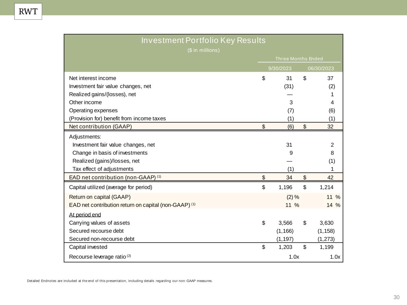 29 Detailed Endnotes are included at the end of this presentation, including details regarding our non-GAAP measures. Mortgage Banking Key Results ($ in millions) Q3 2023 Q2 2023 Business Purpose Mortgage Banking Residential Mortgage Banking Total Business Purpose Mortgage Banking Residential Mortgage Banking Total Net interest income $ 1 $ 1 $ 2 $ 1 $ 1 $ 1 Mortgage banking activities 10 9 19 9 7 17 Other income 1 — 1 1 — 1 Mortgage banking income (loss) 12 10 23 11 8 19 Operating expenses (14) (5) (19) (16) (4) (20) Benefit from income taxes — (1) — 1 (1) 1 Net contribution (GAAP) $ (1) $ 4 $ 3 $ (3) $ 3 $ — Adjustments: Investment fair value changes — — — — — — Acquisition related expenses 3 — 3 3 — 3 Organizational restructuring charges — — — — — — Tax effect of adjustments (1) — (1) (1) — (1) EAD Net Contribution (non-GAAP) (1) $ 1 $ 4 $ 6 $ (1) $ 3 $ 2 Capital utilized (average for period) (2) $ 92 $ 120 $ 212 $ 100 $ 30 $ 130 Return on capital (GAAP) (5)% 15 % 6 % (13)% 43 % — % EAD Net Contribution return on capital (non-GAAP) (1) 5 % 15 % 11 % (3)% 43 % 7 % Production Volumes Term loan fundings $ 106 $ 129 Bridge loan fundings $ 305 $ 278 Residential loan locks $ 1,637 $ 567 Residential loan purchase commitments (fallout adjusted) $ 1,272 $ 437
