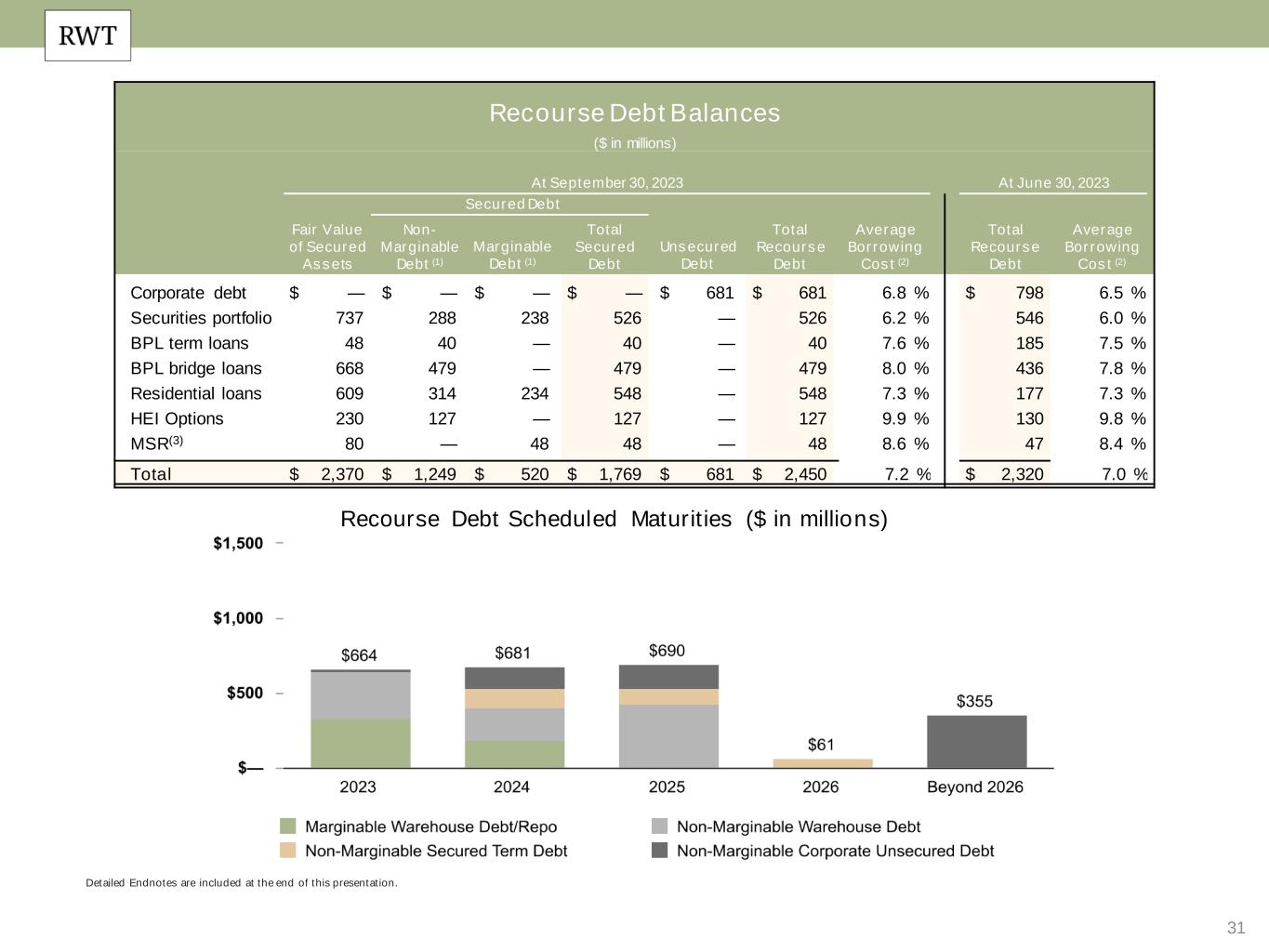 30 Detailed Endnotes are included at the end of this presentation, including details regarding our non-GAAP measures. Investment Portfolio Key Results ($ in millions) Three Months Ended 9/30/2023 06/30/2023 Net interest income $ 31 $ 37 Investment fair value changes, net (31) (2) Realized gains/(losses), net — 1 Other income 3 4 Operating expenses (7) (6) (Provision for) benefit from income taxes (1) (1) Net contribution (GAAP) $ (6) $ 32 Adjustments: Investment fair value changes, net 31 2 Change in basis of investments 9 8 Realized (gains)/losses, net — (1) Tax effect of adjustments (1) 1 EAD net contribution (non-GAAP) (1) $ 34 $ 42 Capital utilized (average for period) $ 1,196 $ 1,214 Return on capital (GAAP) (2) % 11 % EAD net contribution return on capital (non-GAAP) (1) 11 % 14 % At period end Carrying values of assets $ 3,566 $ 3,630 Secured recourse debt (1,166) (1,158) Secured non-recourse debt (1,197) (1,273) Capital invested $ 1,203 $ 1,199 Recourse leverage ratio (2) 1.0x 1.0x