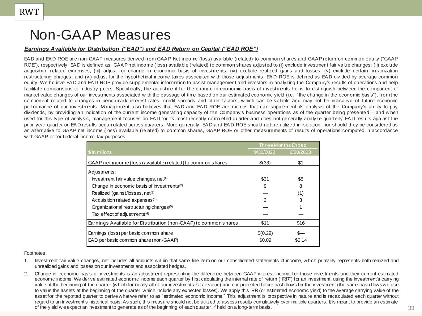33 Non-GAAP Measures Earnings Available for Distribution (“EAD”) and EAD Return on Capital (“EAD ROE”) EA D and EA D ROE are non-GAAP measures derived from GAA P Net income (loss) available (related) to common shares and GAA P return on common equity (“GAA P ROE”), respectively. EA D is defined as: GAA P net income ( loss) available (related) to common shares adjusted to ( i) exclude investment fair value changes; (ii) exclude acquisit ion related expenses; (iii) adjust for change in economic basis of investments; (iv) exclude realized gains and losses; (v) exclude certain organization restructuring charges; and (vi) adjust for the hypothetical income taxes associated w ith those adjustments. EA D ROE is defined as EA D div ided by average common equity. We believe EA D and EA D ROE provide supplemental information to assist management and investors in analyzing the Company’s results of operations and help facilitate compar isons to industry peers. Specif ically, the adjustment for the change in economic basis of investments helps to distinguish betw een the component of market value changes of our investments associated w ith the passage of time based on our estimated economic yield (i.e., “the change in the economic basis”), from the component related to changes in benchmark interest rates, credit spreads and other factors, w hich can be volatile and may not be indicative of future economic performance of our investments. Management also believes that EA D and EA D ROE are metrics that can supplement its analysis of the Company’s ability to pay dividends, by providing an indication of the current income generating capacity of the Company's bus iness operations as of the quarter being presented – and w hen used for this type of analysis, management focuses on EA D for its most recently completed quarter and does not generally analyze quarterly EA D results against the prior-year quarter or EA D results accumulated across quarters. More generally, EA D and EA D ROE should not be utilized in isolation, nor should they be considered as an alternative to GAAP net income ( loss) available (related) to common shares, GAAP ROE or other measurements of results of operations computed in accordance w ith GAAP or for federal income tax purposes. $ in millions Three Months Ended $ in millions 9/30/2023 6/30/2023 GAAP net income (loss) available (related) to common shares $(33) $1 Adjustments: Investment fair value changes, net(1) $31 $5 Change in economic basis of investments(2) 9 8 Realized (gains)/losses, net(3) — (1) Acquisition related expenses (4) 3 3 Organizational restructuring charges(5) — 1 Tax effect of adjustments (6) — — Earnings Available for Distribution (non-GAAP) to common shares $11 $16 Earnings (loss) per basic common share $(0.29) $— EAD per basic common share (non-GAAP) $0.09 $0.14 Footnotes: 1. Investment fair value changes, net includes all amounts w ithin that same line item on our consolidated statements of income, w hich primarily represents both realized and unrealized gains and losses on our investments and associated hedges. 2. Change in economic basis of investments is an adjustment representing the difference between GAAP interest income for those investments and their current estimated economic income. We derive estimated economic income each quarter by f irst calculating the internal rate of return (“IRR”) for an investment, using the investment’s carrying value at the beginning of the quarter (which for nearly all of our investments is fair value) and our projected future cash flows for the investment (the same cash flows we use to value the assets at the beginning of the quarter, which include any expected losses). We apply this IRR (or estimated economic yield) to the average carrying value of the asset for the reported quarter to derive what we refer to as “estimated economic income.” This adjustment is prospective in nature and is recalculated each quarter without regard to an investment’s historical basis. As such, this measure should not be utilized to assess results cumulatively over multiple quarters. It is meant to provide an estimate of the yield w e expect an investment to generate as of the beginning of each quarter, if held on a long-term basis.
