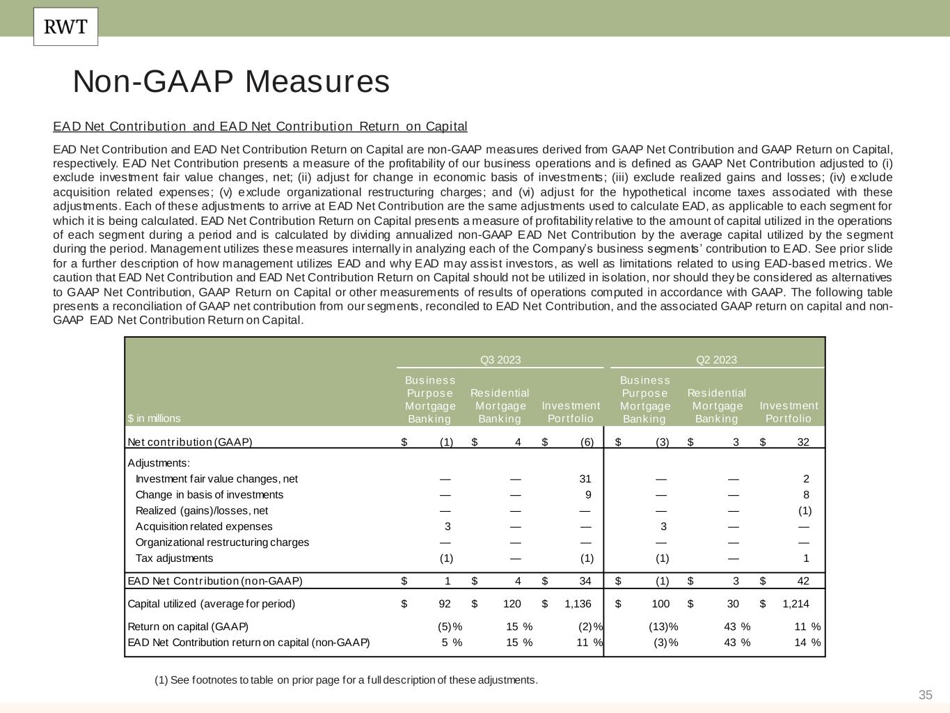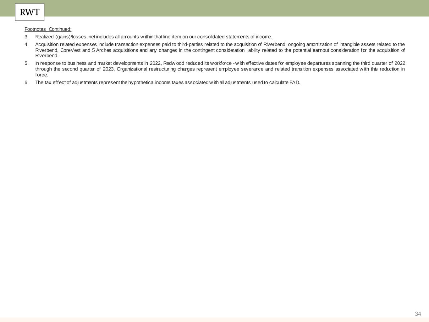 34 Footnotes Continued: 3. Realized (gains)/losses, net includes all amounts w ithin that line item on our consolidated statements of income. 4. Acquisition related expenses include transaction expenses paid to third-parties related to the acquisition of Riverbend, ongoing amortization of intangible assets related to the Riverbend, CoreVest and 5 Arches acquisitions and any changes in the contingent consideration liability related to the potential earnout consideration for the acquisition of Riverbend. 5. In response to business and market developments in 2022, Redw ood reduced its workforce - w ith effective dates for employee departures spanning the third quarter of 2022 through the second quarter of 2023. Organizational restructuring charges represent employee severance and related transition expenses associated w ith this reduction in force. 6. The tax effect of adjustments represent the hypothetical income taxes associated w ith all adjustments used to calculate EAD.
