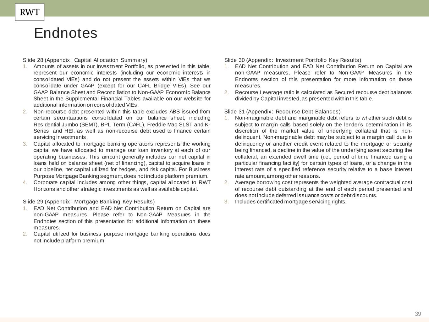 39 Endnotes Slide 28 (Appendix: Capital Allocation Summary) 1. Amounts of assets in our Investment Portfolio, as presented in this table, represent our economic interests (including our economic interests in consolidated VIEs) and do not present the assets within VIEs that we consolidate under GAAP (except for our CAFL Bridge VIEs). See our GAAP Balance Sheet and Reconciliation to Non-GAAP Economic Balance Sheet in the Supplemental Financial Tables available on our website for additional information on consolidated VIEs. 2. Non-recourse debt presented within this table excludes ABS issued from certain securitizations consolidated on our balance sheet, including Residential Jumbo (SEMT), BPL Term (CAFL), Freddie Mac SLST and K- Series, and HEI, as well as non-recourse debt used to finance certain servicing investments. 3. Capital allocated to mortgage banking operations represents the working capital we have allocated to manage our loan inventory at each of our operating businesses. This amount generally includes our net capital in loans held on balance sheet (net of financing), capital to acquire loans in our pipeline, net capital utilized for hedges, and risk capital. For Business Purpose Mortgage Banking segment, does not include platform premium. 4. Corporate capital includes among other things, capital allocated to RWT Horizons and other strategic investments as well as available capital. Slide 29 (Appendix: Mortgage Banking Key Results) 1. EAD Net Contribution and EAD Net Contribution Return on Capital are non-GAAP measures. Please refer to Non-GAAP Measures in the Endnotes section of this presentation for additional information on these measures. 2. Capital utilized for business purpose mortgage banking operations does not include platform premium. Slide 30 (Appendix: Investment Portfolio Key Results) 1. EAD Net Contribution and EAD Net Contribution Return on Capital are non-GAAP measures. Please refer to Non-GAAP Measures in the Endnotes section of this presentation for more information on these measures. 2. Recourse Leverage ratio is calculated as Secured recourse debt balances divided by Capital invested, as presented within this table. Slide 31 (Appendix: Recourse Debt Balances) 1. Non-marginable debt and marginable debt refers to whether such debt is subject to margin calls based solely on the lender’s determination in its discretion of the market value of underlying collateral that is non- delinquent. Non-marginable debt may be subject to a margin call due to delinquency or another credit event related to the mortgage or security being financed, a decline in the value of the underlying asset securing the collateral, an extended dwell time (i.e., period of time financed using a particular financing facility) for certain types of loans, or a change in the interest rate of a specified reference security relative to a base interest rate amount, among other reasons. 2. Average borrowing cost represents the weighted average contractual cost of recourse debt outstanding at the end of each period presented and does not include deferred issuance costs or debt discounts. 3. Includes certificated mortgage servicing rights.