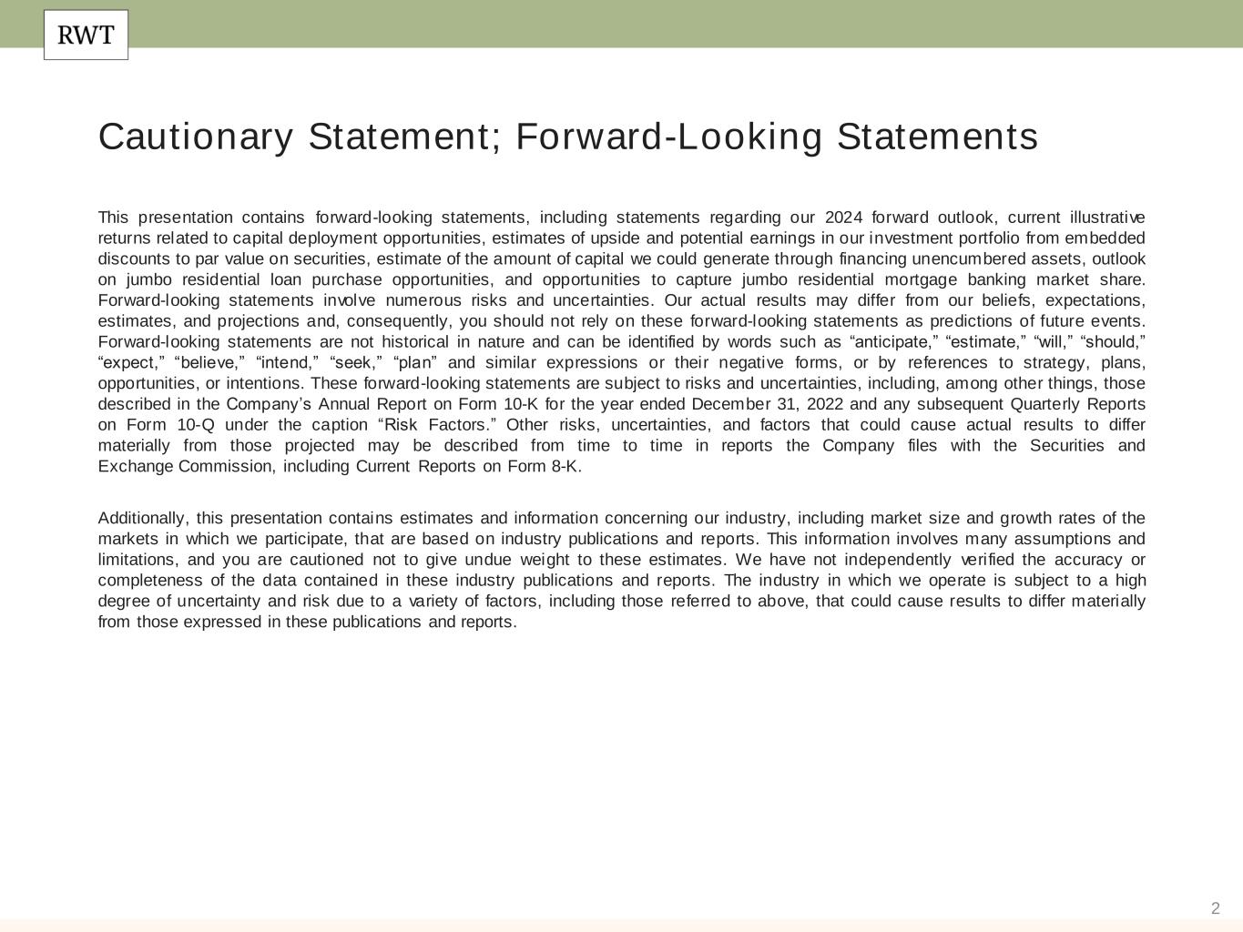 2 Cautionary Statement; Forward-Looking Statements This presentation contains forward-looking statements, including statements regarding our 2024 forward outlook, current illustrative returns related to capital deployment opportunities, estimates of upside and potential earnings in our investment portfolio from embedded discounts to par value on securities, estimate of the amount of capital we could generate through financing unencumbered assets, outlook on jumbo residential loan purchase opportunities, and opportunities to capture jumbo residential mortgage banking market share. Forward-looking statements involve numerous risks and uncertainties. Our actual results may differ from our beliefs, expectations, estimates, and projections and, consequently, you should not rely on these forward-looking statements as predictions of future events. Forward-looking statements are not historical in nature and can be identified by words such as “anticipate,” “estimate,” “will,” “should,” “expect,” “believe,” “intend,” “seek,” “plan” and similar expressions or their negative forms, or by references to strategy, plans, opportunities, or intentions. These forward-looking statements are subject to risks and uncertainties, including, among other things, those described in the Company’s Annual Report on Form 10-K for the year ended December 31, 2022 and any subsequent Quarterly Reports on Form 10-Q under the caption “Risk Factors.” Other risks, uncertainties, and factors that could cause actual results to differ materially from those projected may be described from time to time in reports the Company files with the Securities and Exchange Commission, including Current Reports on Form 8-K. Additionally, this presentation contains estimates and information concerning our industry, including market size and growth rates of the markets in which we participate, that are based on industry publications and reports. This information involves many assumptions and limitations, and you are cautioned not to give undue weight to these estimates. We have not independently verified the accuracy or completeness of the data contained in these industry publications and reports. The industry in which we operate is subject to a high degree of uncertainty and risk due to a variety of factors, including those referred to above, that could cause results to differ materially from those expressed in these publications and reports.