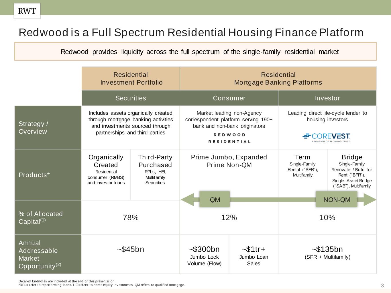 3 Redwood is a Full Spectrum Residential Housing Finance Platform Residential Investment Portfolio Residential Mortgage Banking Platforms Securities Consumer Investor Strategy / Overview Includes assets organically created through mortgage banking activities and investments sourced through partnerships and third parties Market leading non-Agency correspondent platform serving 190+ bank and non-bank originators Leading direct life-cycle lender to housing investors Products* Organically Created Residential consumer (RMBS) and investor loans Third-Party Purchased RPLs, HEI, Multifamily Securities Prime Jumbo, Expanded Prime Non-QM Term Single-Family Rental (“SFR”), Multifamily Bridge Single-Family Renovate / Build for Rent (“BFR”), Single Asset Bridge (“SAB”), Multifamily % of Allocated Capital(1) 78% 12% 10% Annual Addressable Market Opportunity(2) ~$45bn ~$300bn Jumbo Lock Volume (Flow) ~$1tr+ Jumbo Loan Sales ~$135bn (SFR + Multifamily) Redwood provides liquidity across the full spectrum of the single-family residential market Detailed Endnotes are included at the end of this presentation. *RPLs refer to reperforming loans. HEI refers to home equity investments. QM refers to qualified mortgage. QM NON-QM