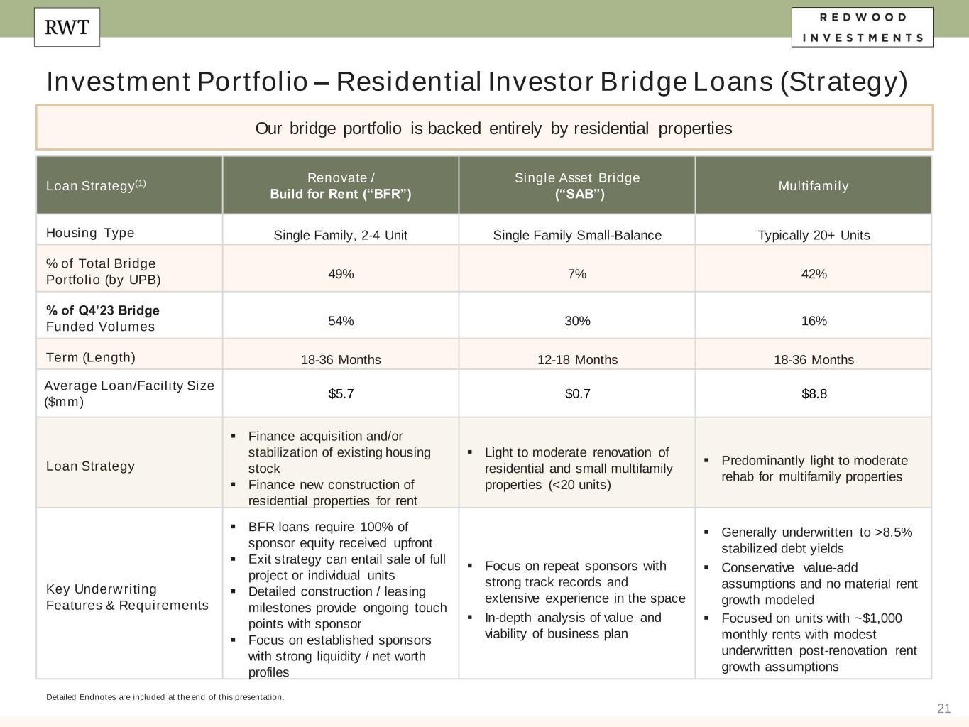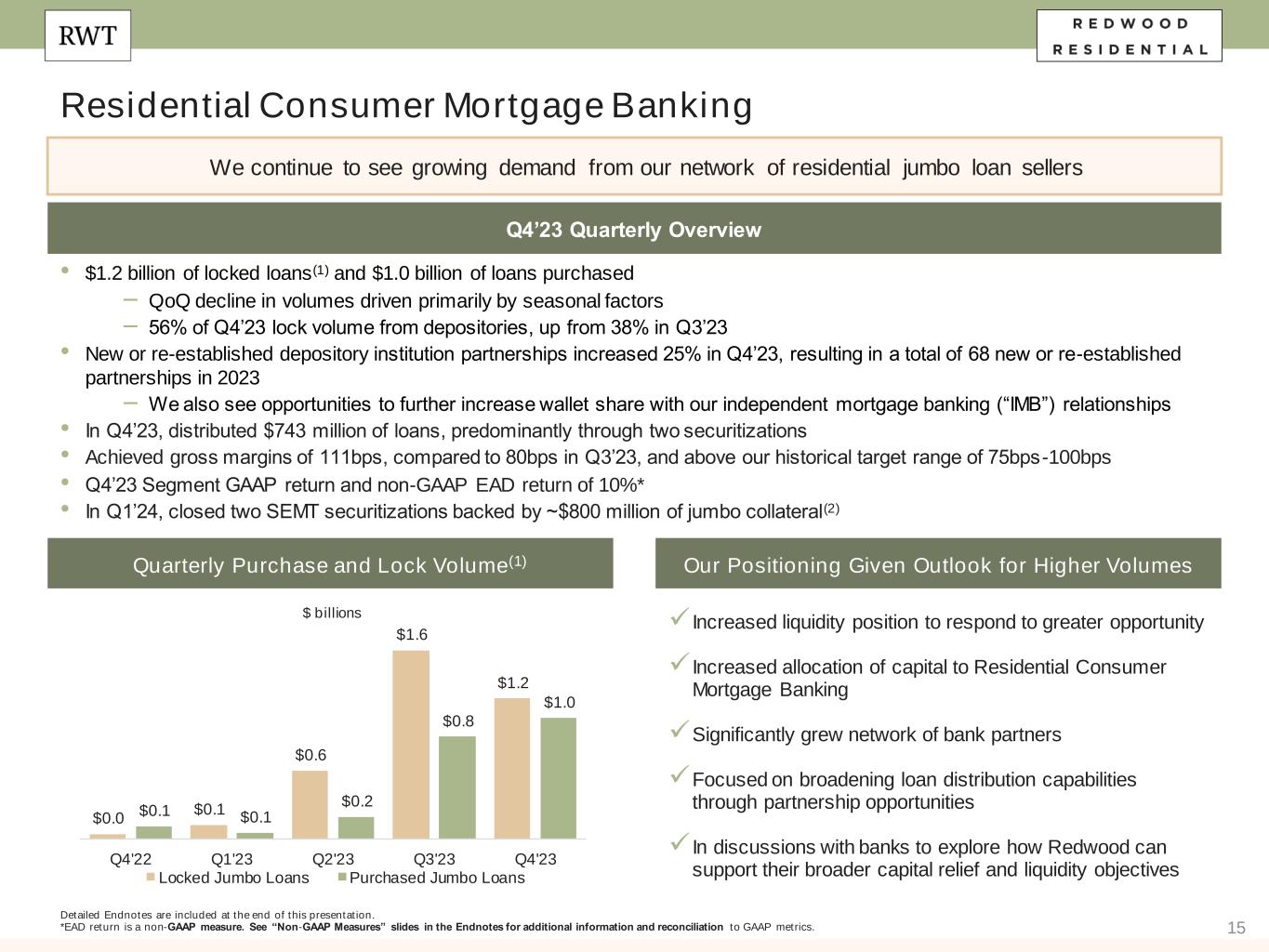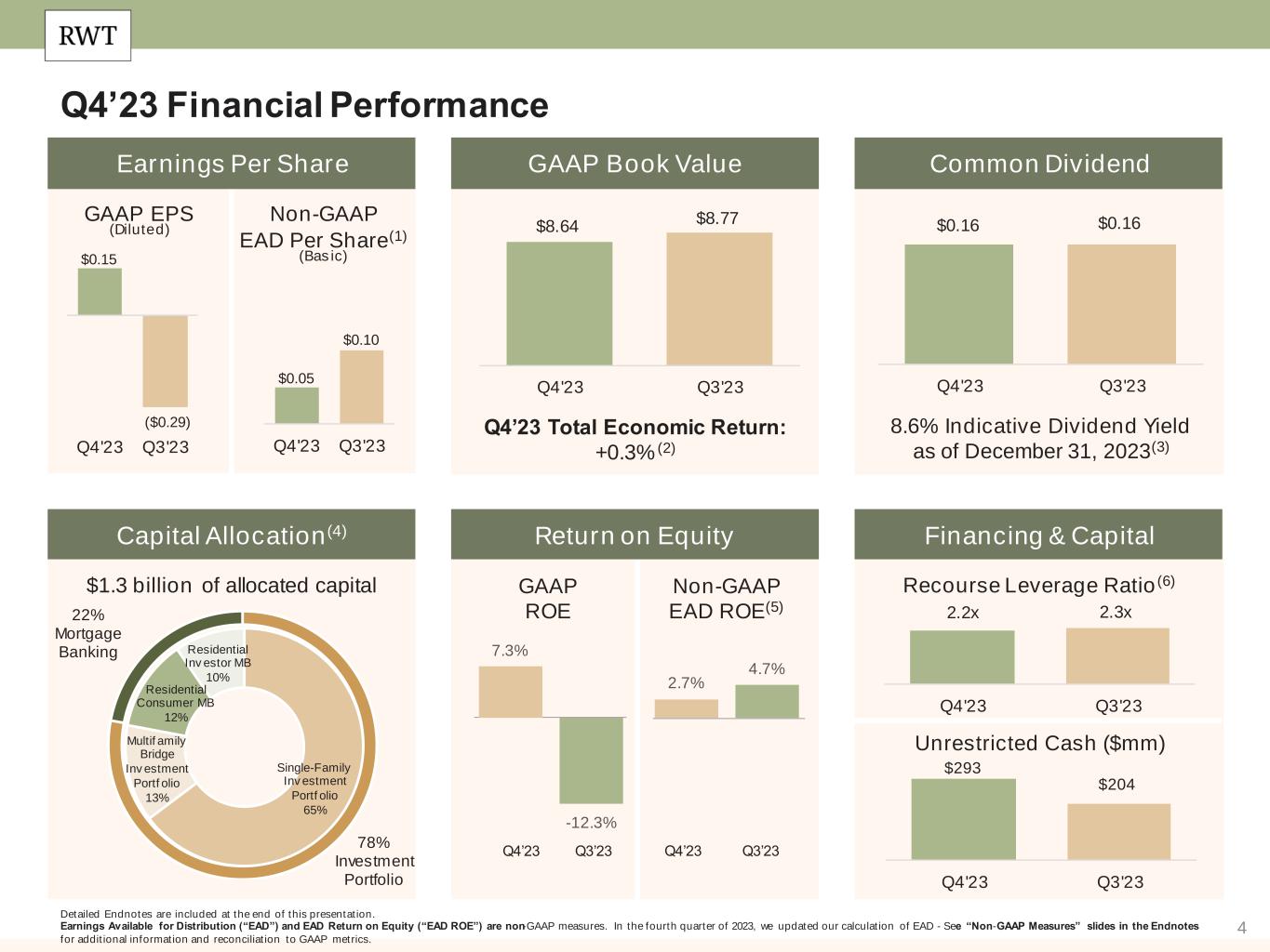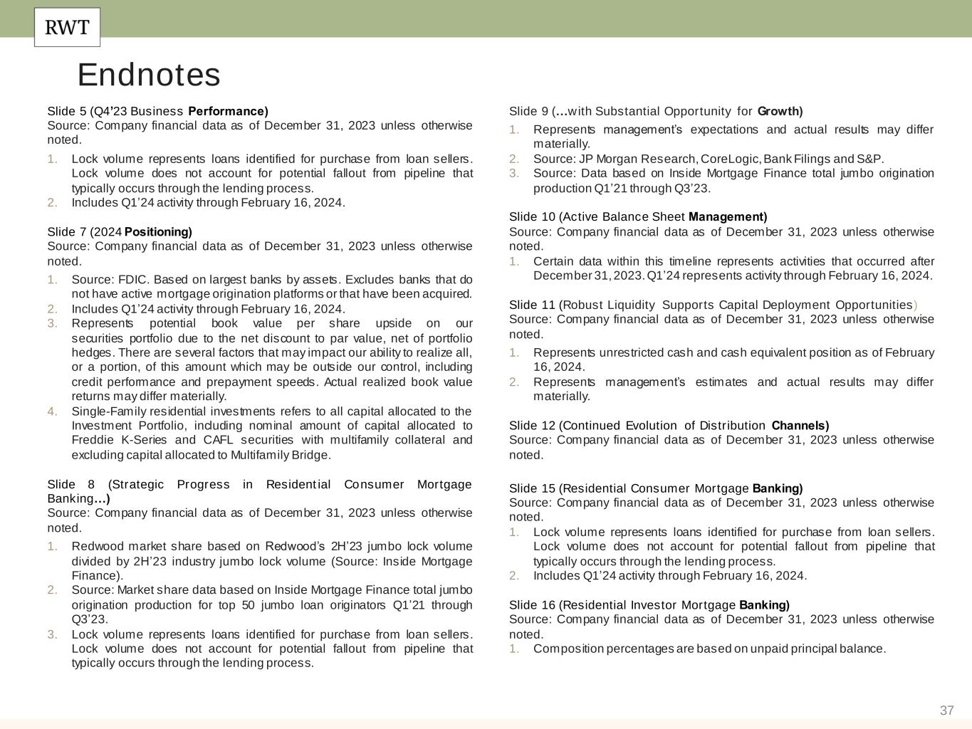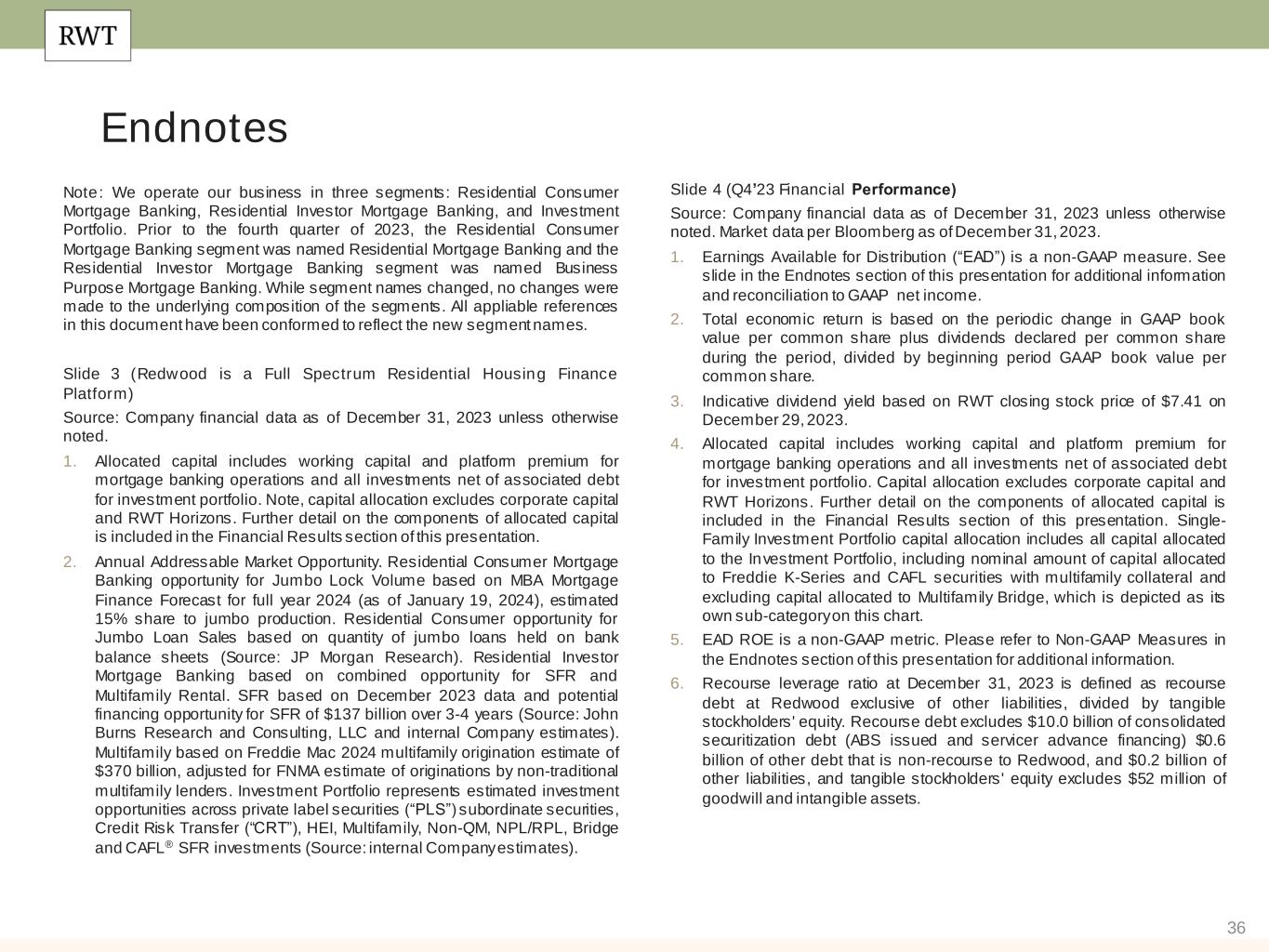 36 Note: We operate our business in three segments: Residential Consumer Mortgage Banking, Residential Investor Mortgage Banking, and Investment Portfolio. Prior to the fourth quarter of 2023, the Residential Consumer Mortgage Banking segment was named Residential Mortgage Banking and the Residential Investor Mortgage Banking segment was named Business Purpose Mortgage Banking. While segment names changed, no changes were made to the underlying composition of the segments. All appliable references in this document have been conformed to reflect the new segment names. Slide 3 (Redwood is a Full Spectrum Residential Housing Finance Platform) Source: Company financial data as of December 31, 2023 unless otherwise noted. 1. Allocated capital includes working capital and platform premium for mortgage banking operations and all investments net of associated debt for investment portfolio. Note, capital allocation excludes corporate capital and RWT Horizons. Further detail on the components of allocated capital is included in the Financial Results section of this presentation. 2. Annual Addressable Market Opportunity. Residential Consumer Mortgage Banking opportunity for Jumbo Lock Volume based on MBA Mortgage Finance Forecast for full year 2024 (as of January 19, 2024), estimated 15% share to jumbo production. Residential Consumer opportunity for Jumbo Loan Sales based on quantity of jumbo loans held on bank balance sheets (Source: JP Morgan Research). Residential Investor Mortgage Banking based on combined opportunity for SFR and Multifamily Rental. SFR based on December 2023 data and potential financing opportunity for SFR of $137 billion over 3-4 years (Source: John Burns Research and Consulting, LLC and internal Company estimates). Multifamily based on Freddie Mac 2024 multifamily origination estimate of $370 billion, adjusted for FNMA estimate of originations by non-traditional multifamily lenders. Investment Portfolio represents estimated investment opportunities across private label securities (“PLS”) subordinate securities, Credit Risk Transfer (“CRT”), HEI, Multifamily, Non-QM, NPL/RPL, Bridge and CAFL® SFR investments (Source: internal Company estimates). Endnotes Slide 4 (Q4’23 Financial Performance)​ Source: Company financial data as of December 31, 2023 unless otherwise noted. Market data per Bloomberg as of December 31, 2023. 1. Earnings Available for Distribution (“EAD”) is a non-GAAP measure. See slide in the Endnotes section of this presentation for additional information and reconciliation to GAAP net income. 2. Total economic return is based on the periodic change in GAAP book value per common share plus dividends declared per common share during the period, divided by beginning period GAAP book value per common share. 3. Indicative dividend yield based on RWT closing stock price of $7.41 on December 29, 2023. 4. Allocated capital includes working capital and platform premium for mortgage banking operations and all investments net of associated debt for investment portfolio. Capital allocation excludes corporate capital and RWT Horizons. Further detail on the components of allocated capital is included in the Financial Results section of this presentation. Single- Family Investment Portfolio capital allocation includes all capital allocated to the Investment Portfolio, including nominal amount of capital allocated to Freddie K-Series and CAFL securities with multifamily collateral and excluding capital allocated to Multifamily Bridge, which is depicted as its own sub-category on this chart. 5. EAD ROE is a non-GAAP metric. Please refer to Non-GAAP Measures in the Endnotes section of this presentation for additional information. 6. Recourse leverage ratio at December 31, 2023 is defined as recourse debt at Redwood exclusive of other liabilities, divided by tangible stockholders' equity. Recourse debt excludes $10.0 billion of consolidated securitization debt (ABS issued and servicer advance financing) $0.6 billion of other debt that is non-recourse to Redwood, and $0.2 billion of other liabilities, and tangible stockholders' equity excludes $52 million of goodwill and intangible assets.