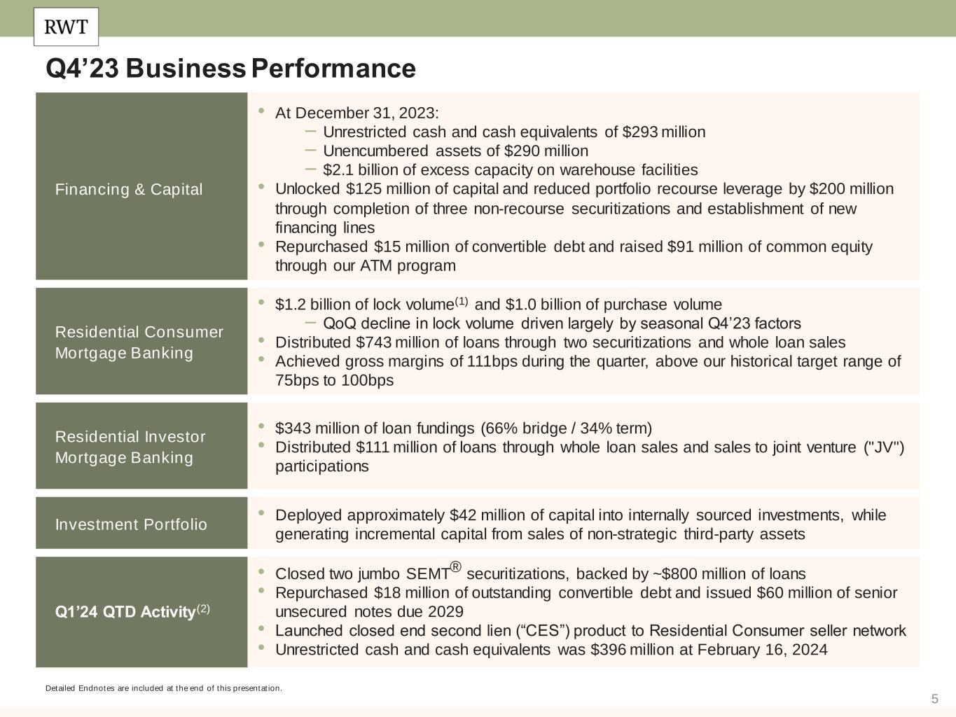 4 Q4’23 Financial Performance Detailed Endnotes are included at the end of this presentation. Earnings Available for Distribution (“EAD”) and EAD Return on Equity (“EAD ROE”) are non-GAAP measures. In the fourth quarter of 2023, we updated our calculation of EAD - See “Non-GAAP Measures” slides in the Endnotes for additional information and reconciliation to GAAP metrics. Recourse Leverage Ratio(6) Unrestricted Cash ($mm) Q4’23 Total Economic Return: +0.3% (2) 8.6% Indicative Dividend Yield as of December 31, 2023(3) GAAP ROE Non-GAAP EAD ROE(5) GAAP EPS (Diluted) Non-GAAP EAD Per Share(1) (Basic) Q4’23 Q3’23 Q4’23 Q3’23 $8.64 $8.77 Q4'23 Q3'23 $0.05 $0.10 Q4'23 Q3'23 $0.15 ($0.29) Q4'23 Q3'23 2.2x 2.3x Q4'23 Q3'23 $0.16 $0.16 Q4'23 Q3'23 $293 $204 Q4'23 Q3'23 7.3% 2.7% -12.3% 4.7% Earnings Per Share GAAP Book Value Common Dividend Capital Allocation(4) Return on Equity Financing & Capital $1.3 billion of allocated capital 78% Investment Portfolio 22% Mortgage Banking Single-Family Inv estment Portf olio 65% Multif amily Bridge Inv estment Portf olio 13% Residential Consumer MB 12% Residential Inv estor MB 10%