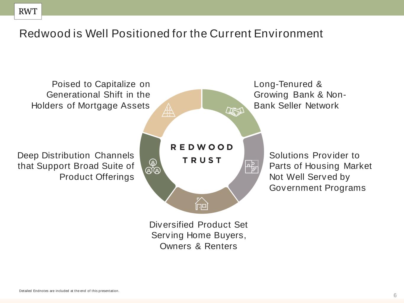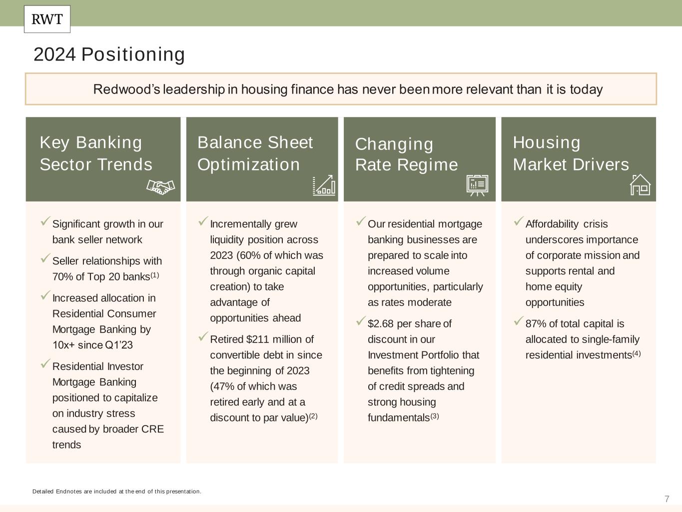 6 Redwood is Well Positioned for the Current Environment Detailed Endnotes are included at the end of this presentation. Poised to Capitalize on Generational Shift in the Holders of Mortgage Assets Deep Distribution Channels that Support Broad Suite of Product Offerings Diversified Product Set Serving Home Buyers, Owners & Renters Long-Tenured & Growing Bank & Non- Bank Seller Network Solutions Provider to Parts of Housing Market Not Well Served by Government Programs