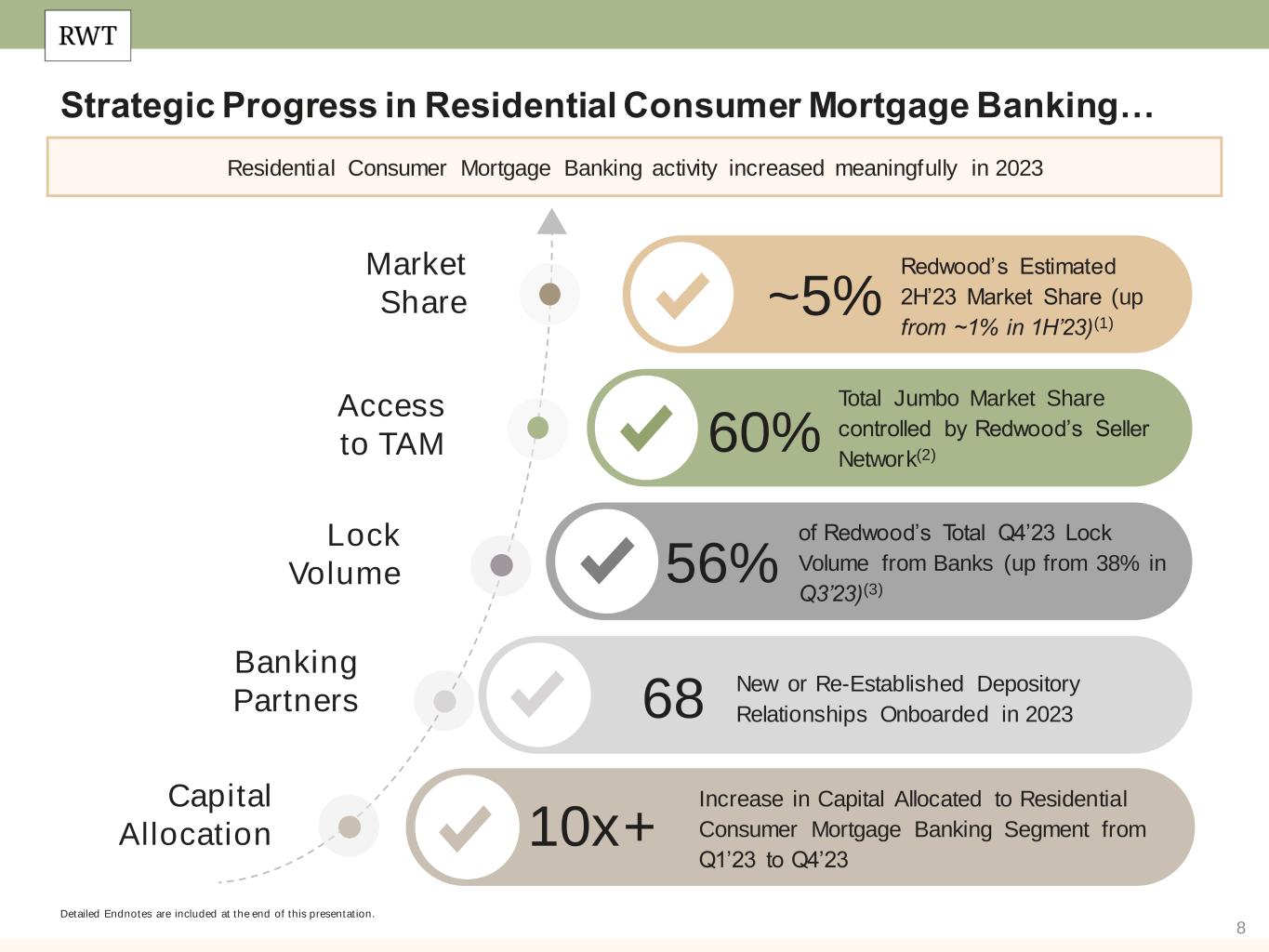 7 2024 Positioning Redwood’s leadership in housing finance has never been more relevant than it is today Our investment portfolio is well positioned for the current environment with $2.68 of discount in our investment portfolio that benefits from tightening of credit spreads and strong housing fundamentals Housing Credit Key Banking Sector Trends Balance Sheet Optimization Changing Rate Regime Housing Market Drivers ✓Significant growth in our bank seller network ✓Seller relationships with 70% of Top 20 banks(1) ✓ Increased allocation in Residential Consumer Mortgage Banking by 10x+ since Q1’23 ✓Residential Investor Mortgage Banking positioned to capitalize on industry stress caused by broader CRE trends ✓ Incrementally grew liquidity position across 2023 (60% of which was through organic capital creation) to take advantage of opportunities ahead ✓Retired $211 million of convertible debt in since the beginning of 2023 (47% of which was retired early and at a discount to par value)(2) ✓Our residential mortgage banking businesses are prepared to scale into increased volume opportunities, particularly as rates moderate ✓$2.68 per share of discount in our Investment Portfolio that benefits from tightening of credit spreads and strong housing fundamentals(3) ✓Affordability crisis underscores importance of corporate mission and supports rental and home equity opportunities ✓87% of total capital is allocated to single-family residential investments(4) Detailed Endnotes are included at the end of this presentation.