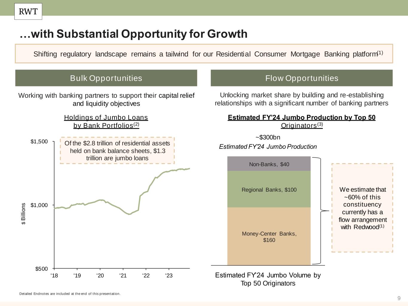 8 Strategic Progress in Residential Consumer Mortgage Banking… Detailed Endnotes are included at the end of this presentation. Residential Consumer Mortgage Banking activity increased meaningfully in 2023 Market Share Access to TAM Lock Volume Banking Partners 68 56% 60% ~5% Redwood’s Estimated 2H’23 Market Share (up from ~1% in 1H’23)(1) of Redwood’s Total Q4’23 Lock Volume from Banks (up from 38% in Q3’23)(3) New or Re-Established Depository Relationships Onboarded in 2023 Total Jumbo Market Share controlled by Redwood’s Seller Network(2) Capital Allocation 10x+ Increase in Capital Allocated to Residential Consumer Mortgage Banking Segment from Q1’23 to Q4’23