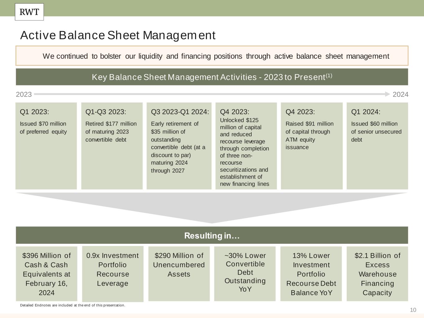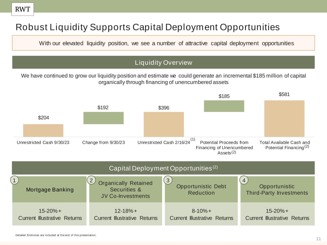 10 Active Balance Sheet Management Detailed Endnotes are included at the end of this presentation. We continued to bolster our liquidity and financing positions through active balance sheet management 2023 Key Balance Sheet Management Activities - 2023 to Present(1) Q1 2023: Issued $70 million of preferred equity Q1 2024: Issued $60 million of senior unsecured debt Q1-Q3 2023: Retired $177 million of maturing 2023 convertible debt Q3 2023-Q1 2024: Early retirement of $35 million of outstanding convertible debt (at a discount to par) maturing 2024 through 2027 Q4 2023: Unlocked $125 million of capital and reduced recourse leverage through completion of three non- recourse securitizations and establishment of new financing lines Q4 2023: Raised $91 million of capital through ATM equity issuance Resulting in… $396 Million of Cash & Cash Equivalents at February 16, 2024 $2.1 Billion of Excess Warehouse Financing Capacity 0.9x Investment Portfolio Recourse Leverage $290 Million of Unencumbered Assets ~30% Lower Convertible Debt Outstanding YoY 13% Lower Investment Portfolio Recourse Debt Balance YoY 2023 2024