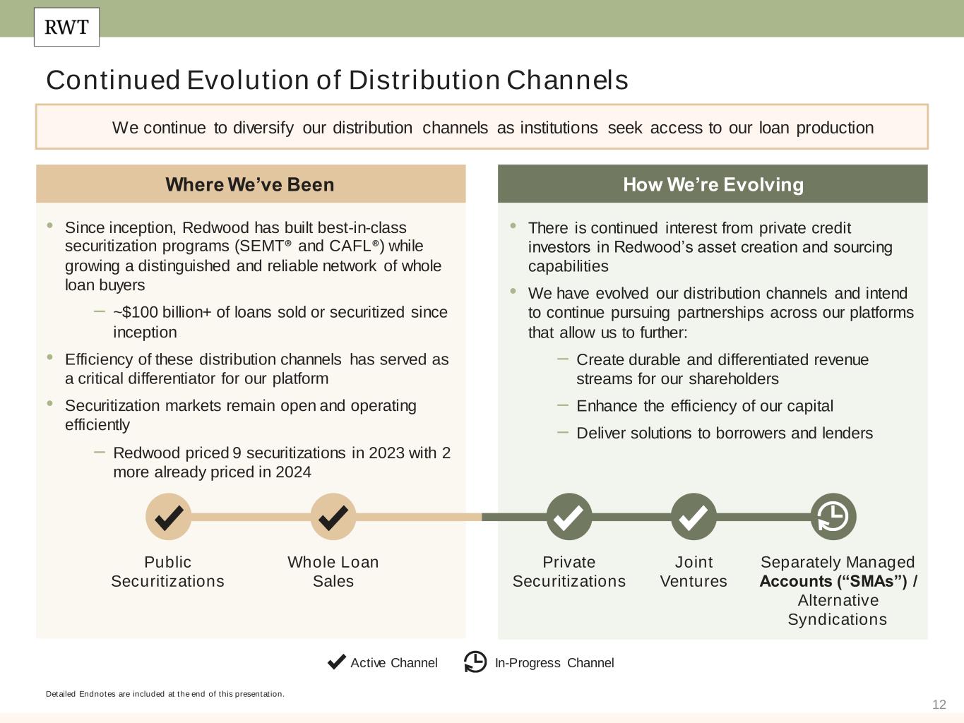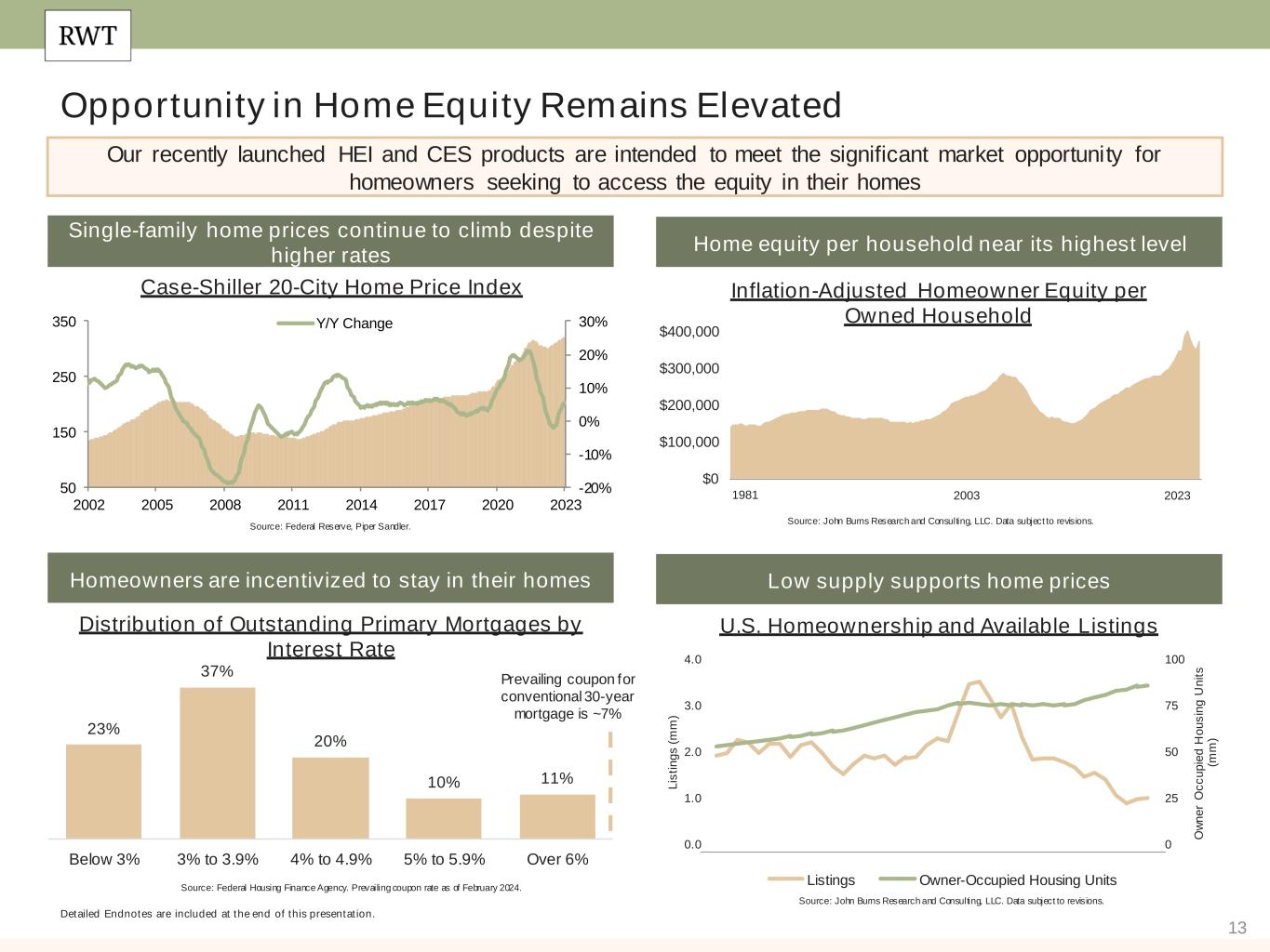12 Continued Evolution of Distribution Channels Detailed Endnotes are included at the end of this presentation. We continue to diversify our distribution channels as institutions seek access to our loan production • Since inception, Redwood has built best-in-class securitization programs (SEMT® and CAFL®) while growing a distinguished and reliable network of whole loan buyers – ~$100 billion+ of loans sold or securitized since inception • Efficiency of these distribution channels has served as a critical differentiator for our platform • Securitization markets remain open and operating efficiently – Redwood priced 9 securitizations in 2023 with 2 more already priced in 2024 Where We’ve Been How We’re Evolving • There is continued interest from private credit investors in Redwood’s asset creation and sourcing capabilities • We have evolved our distribution channels and intend to continue pursuing partnerships across our platforms that allow us to further: – Create durable and differentiated revenue streams for our shareholders – Enhance the efficiency of our capital – Deliver solutions to borrowers and lenders Active Channel In-Progress Channel Public Securitizations Whole Loan Sales Private Securitizations Joint Ventures Separately Managed Accounts (“SMAs”) / Alternative Syndications