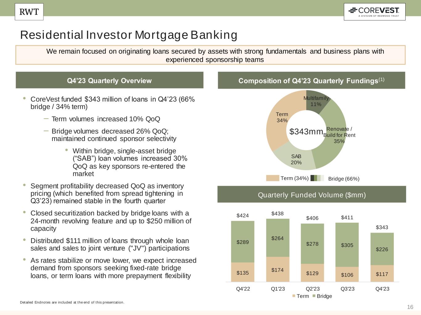 15 • $1.2 billion of locked loans(1) and $1.0 billion of loans purchased – QoQ decline in volumes driven primarily by seasonal factors – 56% of Q4’23 lock volume from depositories, up from 38% in Q3’23 • New or re-established depository institution partnerships increased 25% in Q4’23, resulting in a total of 68 new or re-established partnerships in 2023 – We also see opportunities to further increase wallet share with our independent mortgage banking (“IMB”) relationships • In Q4’23, distributed $743 million of loans, predominantly through two securitizations • Achieved gross margins of 111bps, compared to 80bps in Q3’23, and above our historical target range of 75bps-100bps • Q4’23 Segment GAAP return and non-GAAP EAD return of 10%* • In Q1’24, closed two SEMT securitizations backed by ~$800 million of jumbo collateral(2) Residential Consumer Mortgage Banking Q4’23 Quarterly Overview We continue to see growing demand from our network of residential jumbo loan sellers Detailed Endnotes are included at the end of this presentation. *EAD return is a non-GAAP measure. See “Non-GAAP Measures” slides in the Endnotes for additional information and reconciliation to GAAP metrics. $0.0 $0.1 $0.6 $1.6 $1.2 $0.1 $0.1 $0.2 $0.8 $1.0 Q4'22 Q1'23 Q2'23 Q3'23 Q4'23 Locked Jumbo Loans Purchased Jumbo Loans $ billions Quarterly Purchase and Lock Volume(1) Our Positioning Given Outlook for Higher Volumes ✓ Increased liquidity position to respond to greater opportunity ✓ Increased allocation of capital to Residential Consumer Mortgage Banking ✓Significantly grew network of bank partners ✓Focused on broadening loan distribution capabilities through partnership opportunities ✓ In discussions with banks to explore how Redwood can support their broader capital relief and liquidity objectives