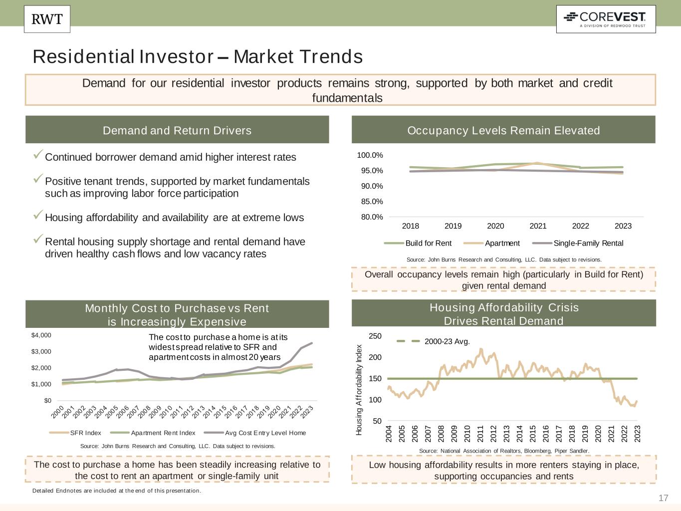 17 Residential Investor – Market Trends Detailed Endnotes are included at the end of this presentation. Demand for our residential investor products remains strong, supported by both market and credit fundamentals Demand and Return Drivers Housing Affordability Crisis Drives Rental Demand Occupancy Levels Remain Elevated Monthly Cost to Purchase vs Rent is Increasingly Expensive Overall occupancy levels remain high (particularly in Build for Rent) given rental demand Low housing affordability results in more renters staying in place, supporting occupancies and rents The cost to purchase a home has been steadily increasing relative to the cost to rent an apartment or single-family unit H o u s in g A ff o rd a b ili ty In d e x The cost to purchase a home is at its widest spread relative to SFR and apartment costs in almost 20 years Source: John Burns Research and Consulting, LLC. Data subject to revisions. Source: John Burns Research and Consulting, LLC. Data subject to revisions. Source: National Association of Realtors, Bloomberg, Piper Sandler. 50 100 150 200 250 2 0 0 4 2 0 0 5 2 0 0 6 2 0 0 7 2 0 0 8 2 0 0 9 2 0 1 0 2 0 1 1 2 0 1 2 2 0 1 3 2 0 1 4 2 0 1 5 2 0 1 6 2 0 1 7 2 0 1 8 2 0 1 9 2 0 2 0 2 0 2 1 2 0 2 2 2 0 2 3 2000-23 Avg. ✓Continued borrower demand amid higher interest rates ✓Positive tenant trends, supported by market fundamentals such as improving labor force participation ✓Housing affordability and availability are at extreme lows ✓Rental housing supply shortage and rental demand have driven healthy cash flows and low vacancy rates 80.0% 85.0% 90.0% 95.0% 100.0% 2018 2019 2020 2021 2022 2023 Build for Rent Apartment Single-Family Rental $0 $1,000 $2,000 $3,000 $4,000 SFR Index Apartment Rent Index Avg Cost Entry Level Home
