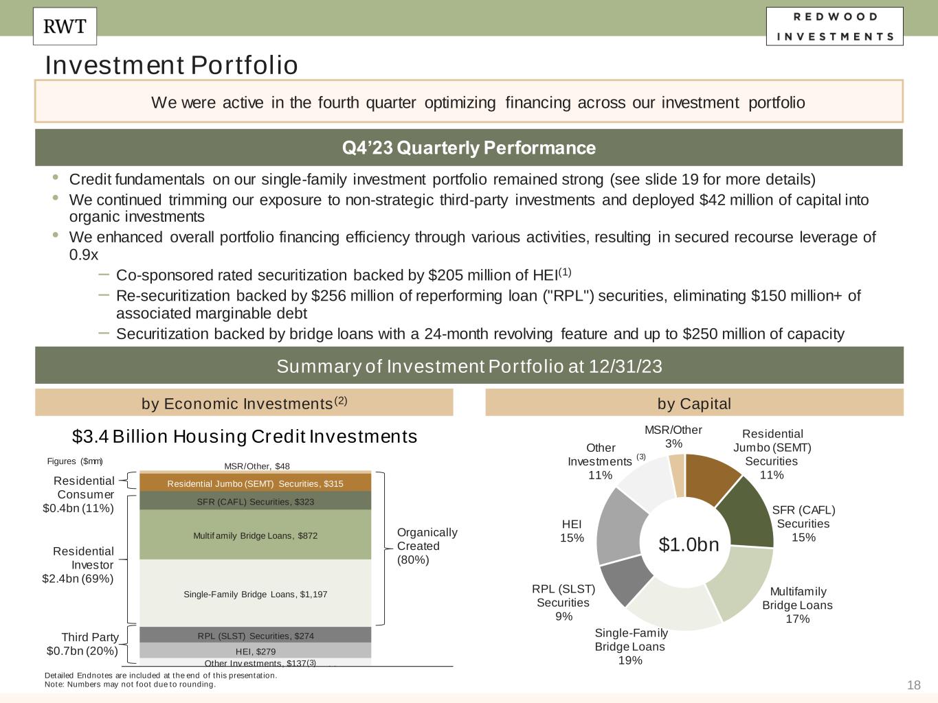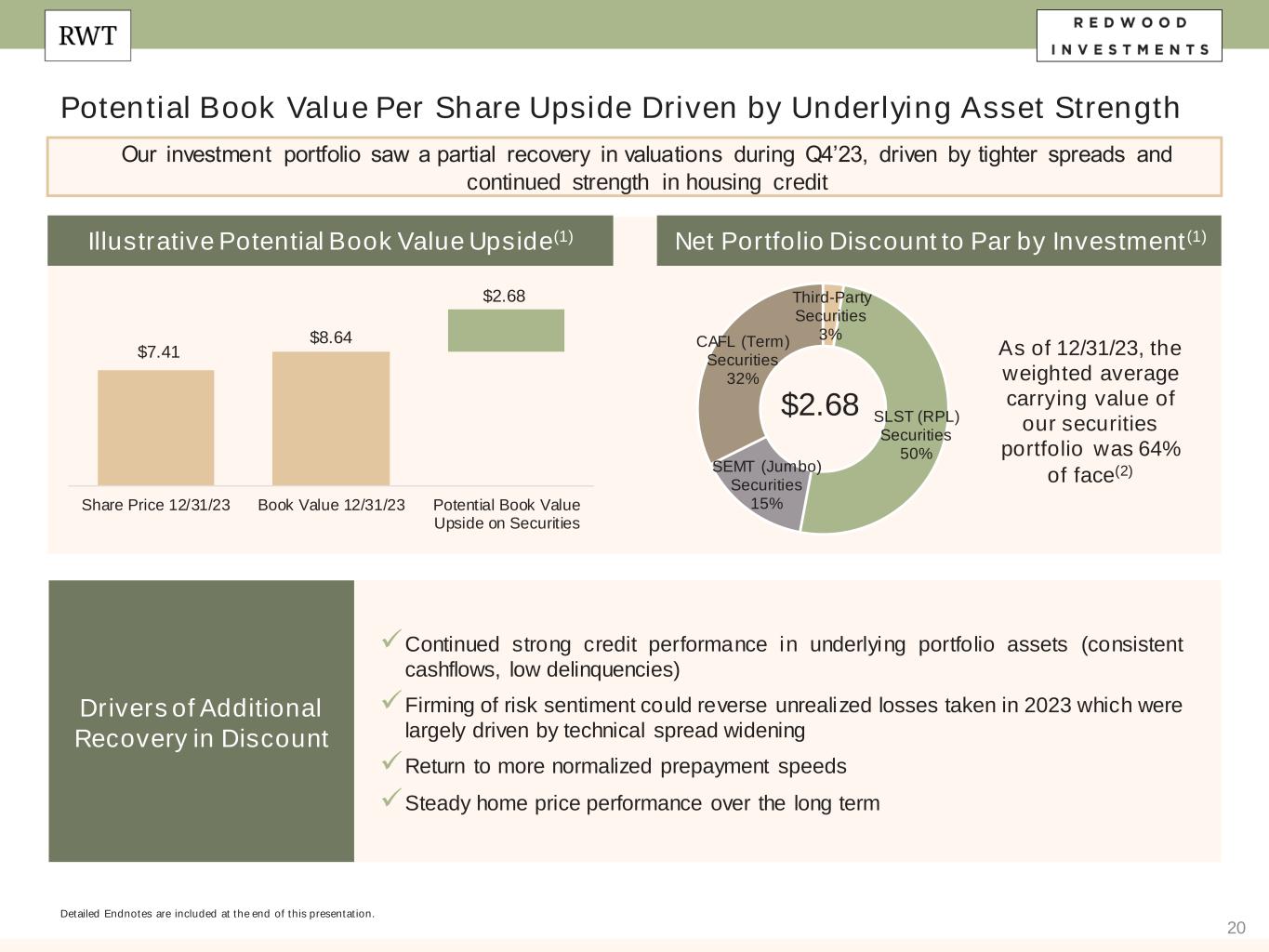 38 Endnotes Slide 18 (Investment Portfolio)​ Source: Company financial data as of December 31, 2023 unless otherwise noted. 1. Represents intrinsic value of total HEI collateralizing securitization, of which Redwood contributed approximately $75 million. Redwood retained approximately 40% of the total residual interests in the securitization. 2. Figures reflect our investments held in our Investment Portfolio on balance sheet and our economic interests in securities we own in securitizations we consolidate in accordance with GAAP (and excludes the assets within these consolidated securitizations that appear on our balance sheet) as of December 31, 2023. 3. $137 million of “Multifamily, CRT, and Other” includes $40 million net investment of multifamily securities, $6 million of third-party securities, and $91 million of other investments. Slide 19 (Single Family Residential Credit Fundamentals Remain Strong)​ Source: Company financial data as of December 31, 2023 unless otherwise noted. 1. Source: Bloomberg (HPI LTV (Amort) %), Home Price Indexed Amortized Loan to Value. 2. In the fourth quarter of 2023, the methodology for calculating delinquencies for RPL, Jumbo, CAFL, and Third-Party securities was updated to weight by notional balances of loans collateralizing each of our securities investments. All prior periods presented have been conformed to this updated methodology. Slide 20 (Potential Book Value Per Share Upside Driven by Underlying Asset Strength)​ Source: Company financial data as of December 31, 2023 unless otherwise noted. 1. Represents potential book value per share upside on our securities portfolio due to the net discount to par value, net of portfolio hedges. There are several factors that may impact our ability to realize all, or a portion, of this amount which may be outside our control, including credit performance and prepayment speeds. Actual realized book value returns may differ materially. 2. Represents the market value of subordinate securities at December 31, 2023 divided by the outstanding principal balance at December 31, 2023 as a dollar price per $100 par value. Slide 21 (Investment Portfolio – Residential Investor Bridge Loans Strategy)​ Source: Company financial data as of December 31, 2023 unless otherwise noted. 1. Table and total exclude Third Party Originated loans which represent only 2% of total bridge UPB at December 31, 2023. Slide 22 (Investment Portfolio – Residential Investor Bridge Loans Composition)​ Source: Company financial data as of December 31, 2023 unless otherwise noted. 1. Represents the market value of our bridge loans held for investment and held for sale at the time periods presented. Excludes REO loans. 2. Excludes REO loans. Slide 23 (Investment Portfolio – Residential Investor Bridge Loans Credit)​ Source: Company financial data as of December 31, 2023 unless otherwise noted. 1. Table and total exclude Third Party Originated loans which represent only 2% of total bridge UPB at December 31, 2023. Such Third Party Originated loans have average LTV at origination of 69.6%, average LTC at origination of 80.0%, weighted average coupon of 10.1%, average loan/facility size of $2.9mm, 90 day+ delinquency of 40.3% and REO of 22.2%. 2. Renovate / BFR REO comprised primarily of one BFR project which management expects to go under sale contract in Q1’24. Slide 24 (RWT Horizons) Source: Company financial data as of December 31, 2023 unless otherwise noted. Slide 26 (Appendix: Income Statement) 1. Net interest expense from “Corporate (unsecured debt)” consists primarily of interest expense on corporate unsecured debt as well as net interest income from Legacy Sequoia consolidated VIEs.