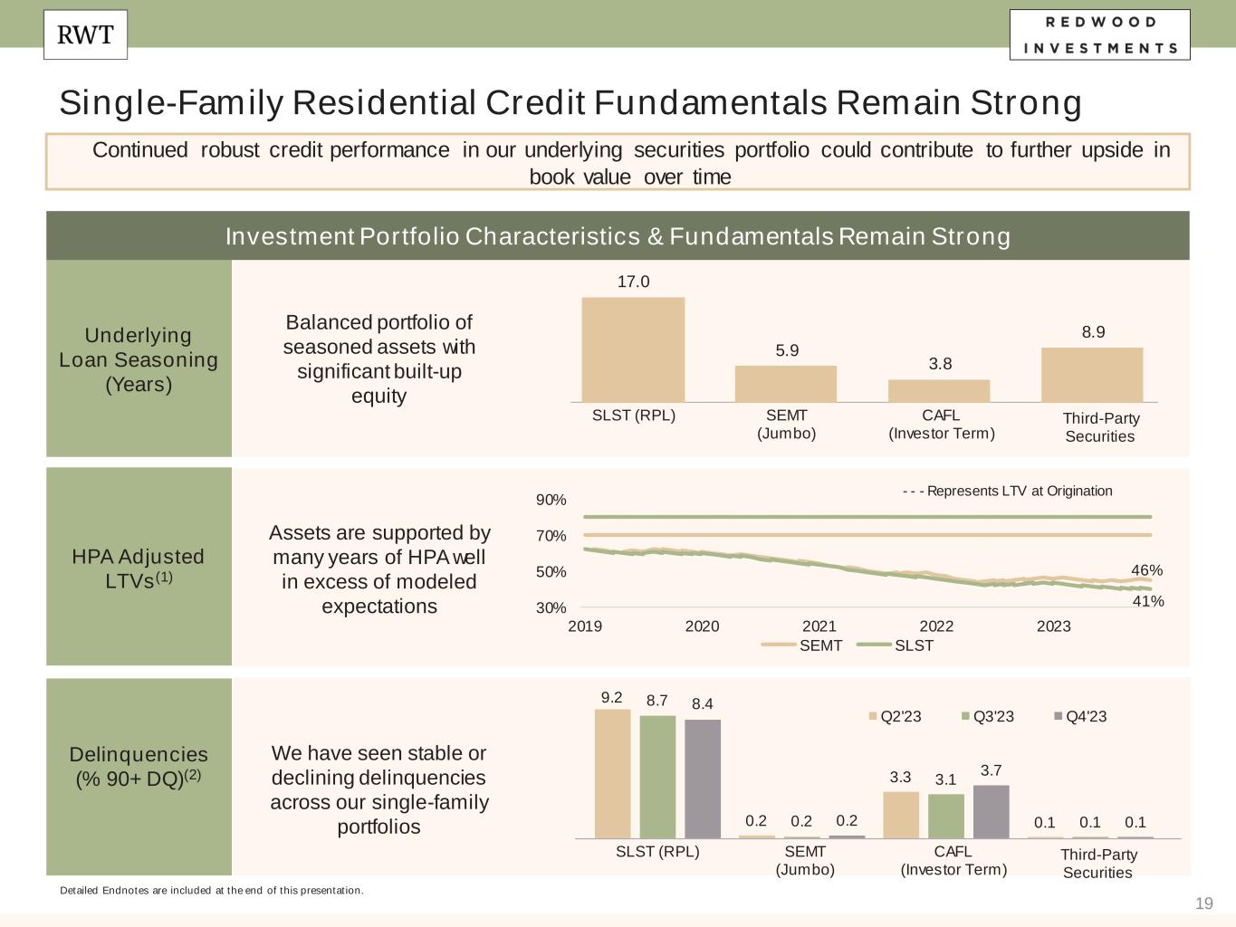 18 Investment Portfolio Q4’23 Quarterly Performance $3.4 Billion Housing Credit Investments Organically Created (80%) Detailed Endnotes are included at the end of this presentation. Note: Numbers may not foot due to rounding. We were active in the fourth quarter optimizing financing across our investment portfolio $1.0bn Third Party $0.7bn (20%) Residential Investor $2.4bn (69%) Residential Consumer $0.4bn (11%) Figures ($mm) Summary of Investment Portfolio at 12/31/23 by Economic Investments(2) by Capital (2) • Credit fundamentals on our single-family investment portfolio remained strong (see slide 19 for more details) • We continued trimming our exposure to non-strategic third-party investments and deployed $42 million of capital into organic investments • We enhanced overall portfolio financing efficiency through various activities, resulting in secured recourse leverage of 0.9x – Co-sponsored rated securitization backed by $205 million of HEI(1) – Re-securitization backed by $256 million of reperforming loan ("RPL") securities, eliminating $150 million+ of associated marginable debt – Securitization backed by bridge loans with a 24-month revolving feature and up to $250 million of capacity Residential Jumbo (SEMT) Securities 11% SFR (CAFL) Securities 15% Multifamily Bridge Loans 17% Single-Family Bridge Loans 19% RPL (SLST) Securities 9% HEI 15% Other Investments 11% MSR/Other 3% (3) (3) Other Inv estments, $137 HEI, $279 RPL (SLST) Securities, $274 Single-Family Bridge Loans, $1,197 Multif amily Bridge Loans, $872 SFR (CAFL) Securities, $323 Residential Jumbo (SEMT) Securities, $315 MSR/Other, $48