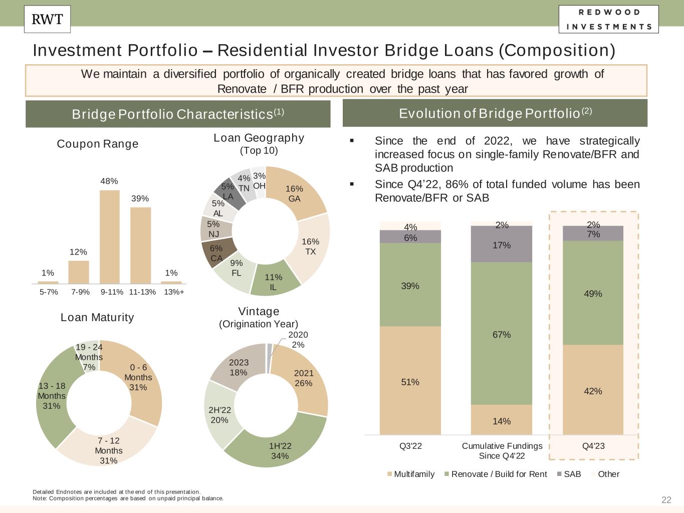 21 Investment Portfolio – Residential Investor Bridge Loans (Strategy) Our bridge portfolio is backed entirely by residential properties Detailed Endnotes are included at the end of this presentation. Loan Strategy(1) Renovate / Build for Rent (“BFR”) Single Asset Bridge (“SAB”) Multifamily Housing Type Single Family, 2-4 Unit Single Family Small-Balance Typically 20+ Units % of Total Bridge Portfolio (by UPB) 49% 7% 42% % of Q4’23 Bridge Funded Volumes 54% 30% 16% Term (Length) 18-36 Months 12-18 Months 18-36 Months Average Loan/Facility Size ($mm) $5.7 $0.7 $8.8 Loan Strategy ▪ Finance acquisition and/or stabilization of existing housing stock ▪ Finance new construction of residential properties for rent ▪ Light to moderate renovation of residential and small multifamily properties (<20 units) ▪ Predominantly light to moderate rehab for multifamily properties Key Underwriting Features & Requirements ▪ BFR loans require 100% of sponsor equity received upfront ▪ Exit strategy can entail sale of full project or individual units ▪ Detailed construction / leasing milestones provide ongoing touch points with sponsor ▪ Focus on established sponsors with strong liquidity / net worth profiles ▪ Focus on repeat sponsors with strong track records and extensive experience in the space ▪ In-depth analysis of value and viability of business plan ▪ Generally underwritten to >8.5% stabilized debt yields ▪ Conservative value-add assumptions and no material rent growth modeled ▪ Focused on units with ~$1,000 monthly rents with modest underwritten post-renovation rent growth assumptions