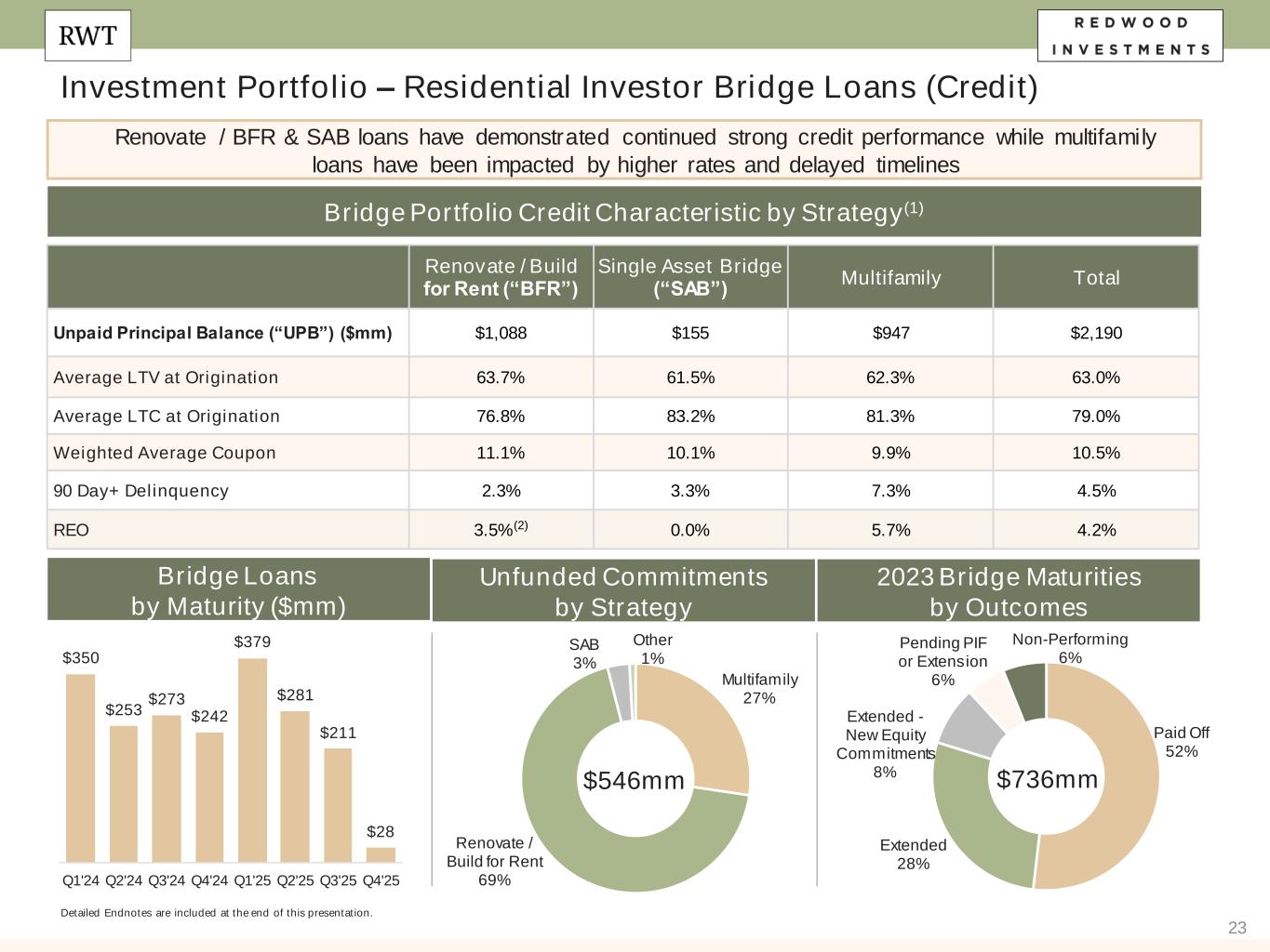 23 Investment Portfolio – Residential Investor Bridge Loans (Credit) Detailed Endnotes are included at the end of this presentation. Renovate / BFR & SAB loans have demonstrated continued strong credit performance while multifamily loans have been impacted by higher rates and delayed timelines Renovate / Build for Rent (“BFR”) Single Asset Bridge (“SAB”) Multifamily Total Unpaid Principal Balance (“UPB”) ($mm) $1,088 $155 $947 $2,190 Average LTV at Origination 63.7% 61.5% 62.3% 63.0% Average LTC at Origination 76.8% 83.2% 81.3% 79.0% Weighted Average Coupon 11.1% 10.1% 9.9% 10.5% 90 Day+ Delinquency 2.3% 3.3% 7.3% 4.5% REO 3.5%(2) 0.0% 5.7% 4.2% Bridge Portfolio Credit Characteristic by Strategy(1) Bridge Loans by Maturity ($mm) $350 $253 $273 $242 $379 $281 $211 $28 Q1'24 Q2'24 Q3'24 Q4'24 Q1'25 Q2'25 Q3'25 Q4'25 Unfunded Commitments by Strategy 2023 Bridge Maturities by Outcomes Paid Off 52% Extended 28% Extended - New Equity Commitments 8% Pending PIF or Extension 6% Non-Performing 6% Multifamily 27% Renovate / Build for Rent 69% SAB 3% Other 1% $546mm $736mm