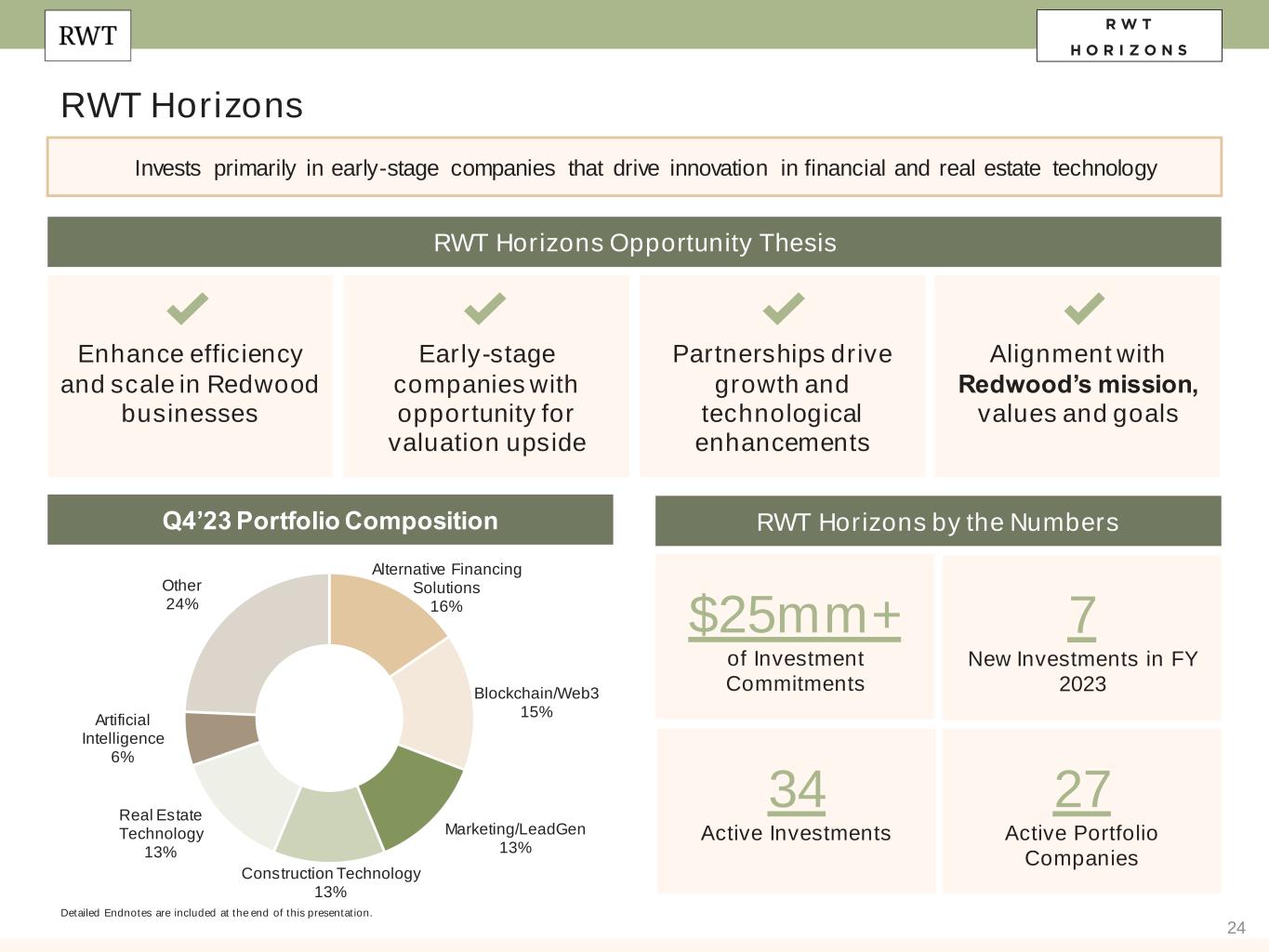 24 RWT Horizons Invests primarily in early-stage companies that drive innovation in financial and real estate technology RWT Horizons by the Numbers RWT Horizons Opportunity Thesis Enhance efficiency and scale in Redwood businesses Early-stage companies with opportunity for valuation upside Partnerships drive growth and technological enhancements Alignment with Redwood’s mission, values and goals 27 Active Portfolio Companies Q4’23 Portfolio Composition 7 New Investments in FY 2023 Alternative Financing Solutions 16% Blockchain/Web3 15% Marketing/LeadGen 13% Construction Technology 13% Real Estate Technology 13% Artificial Intelligence 6% Other 24% $25mm+ of Investment Commitments 34 Active Investments Detailed Endnotes are included at the end of this presentation.