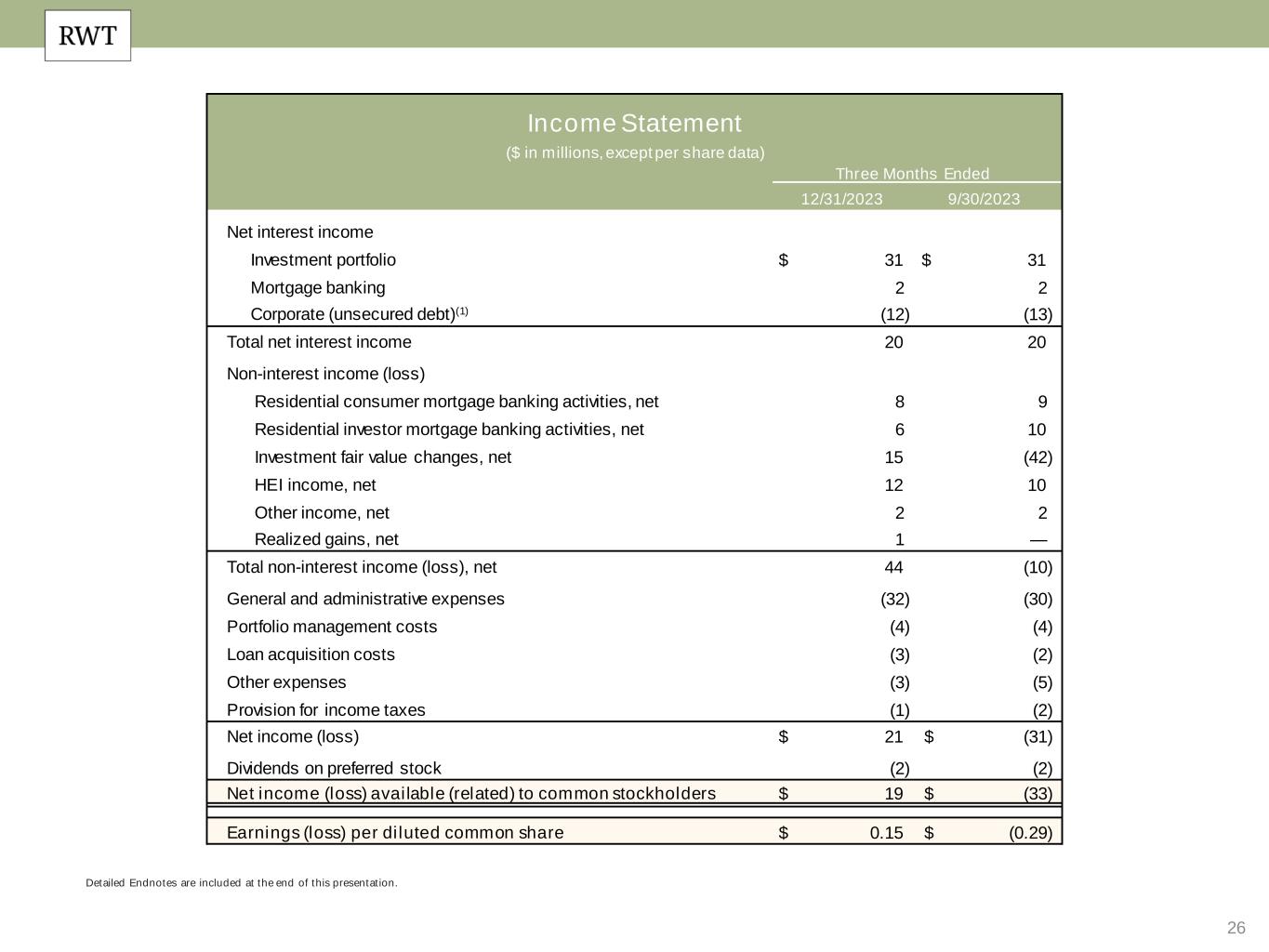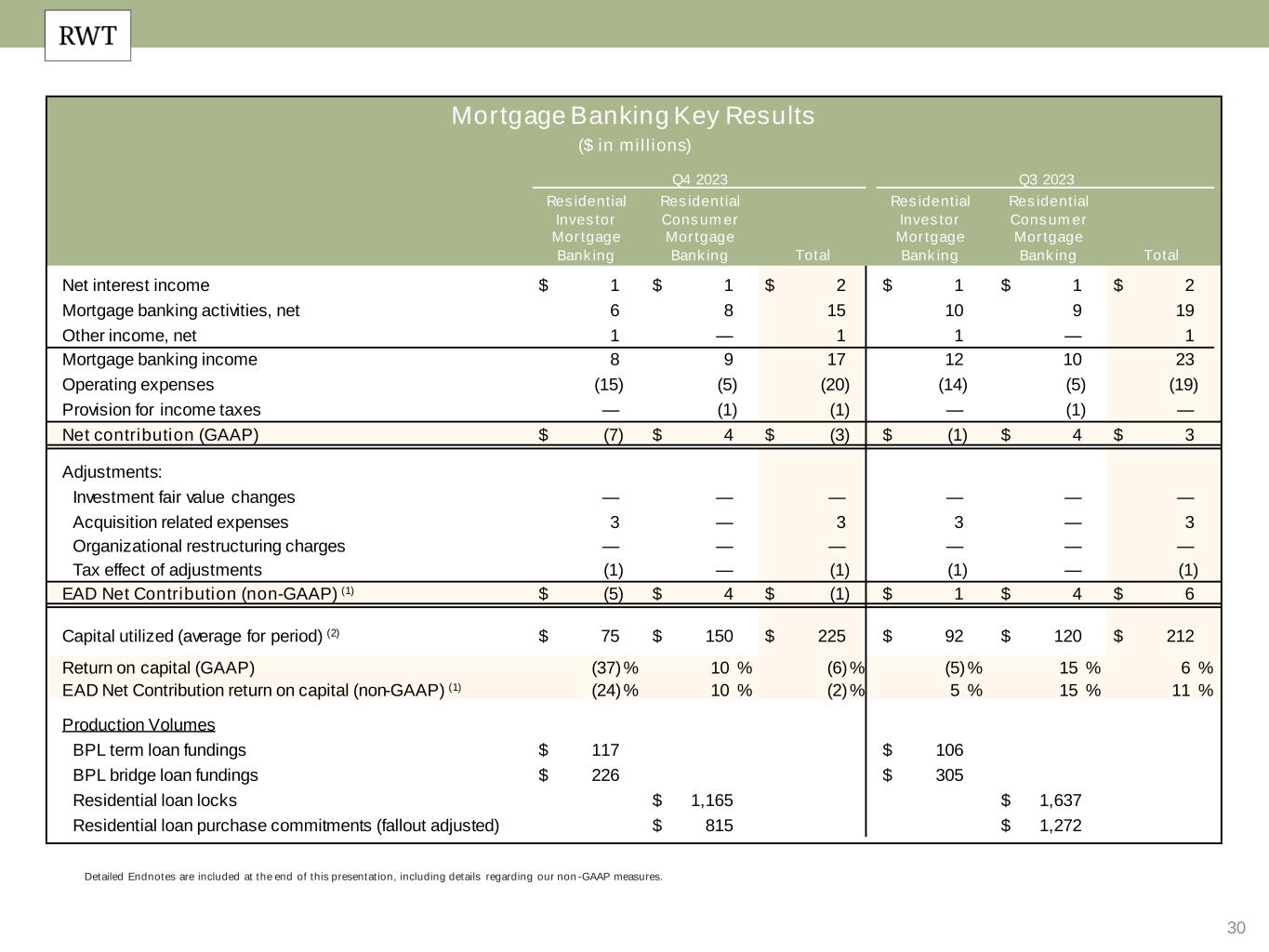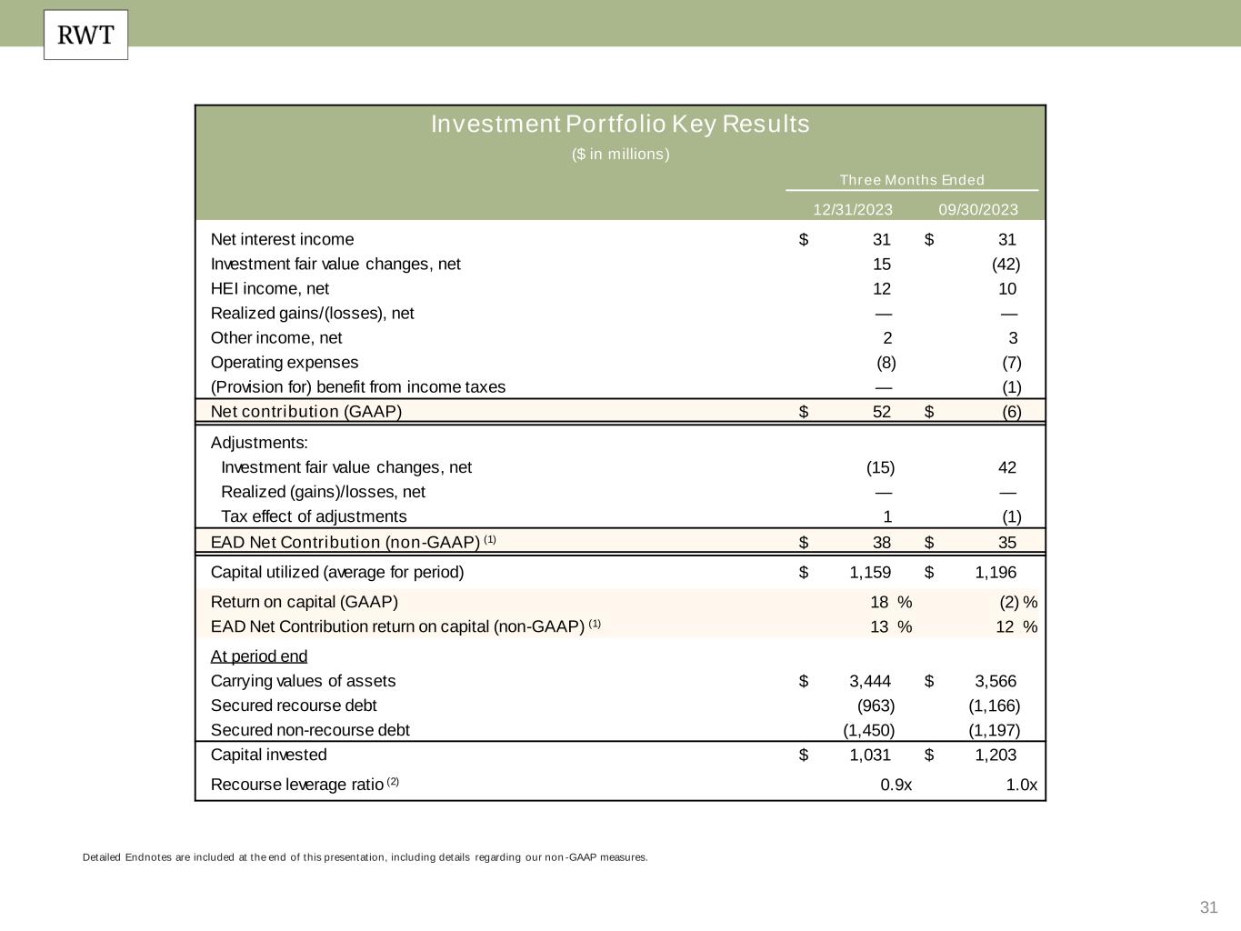 30 Detailed Endnotes are included at the end of this presentation, including details regarding our non-GAAP measures. Mortgage Banking Key Results ($ in millions) Q4 2023 Q3 2023 Residential Investor Mortgage Banking Residential Consumer Mortgage Banking Total Residential Investor Mortgage Banking Residential Consumer Mortgage Banking Total Net interest income $ 1 $ 1 $ 2 $ 1 $ 1 $ 2 Mortgage banking activities, net 6 8 15 10 9 19 Other income, net 1 — 1 1 — 1 Mortgage banking income 8 9 17 12 10 23 Operating expenses (15) (5) (20) (14) (5) (19) Provision for income taxes — (1) (1) — (1) — Net contribution (GAAP) $ (7) $ 4 $ (3) $ (1) $ 4 $ 3 Adjustments: Investment fair value changes — — — — — — Acquisition related expenses 3 — 3 3 — 3 Organizational restructuring charges — — — — — — Tax effect of adjustments (1) — (1) (1) — (1) EAD Net Contribution (non-GAAP) (1) $ (5) $ 4 $ (1) $ 1 $ 4 $ 6 Capital utilized (average for period) (2) $ 75 $ 150 $ 225 $ 92 $ 120 $ 212 Return on capital (GAAP) (37)% 10 % (6)% (5)% 15 % 6 % EAD Net Contribution return on capital (non-GAAP) (1) (24)% 10 % (2)% 5 % 15 % 11 % Production Volumes BPL term loan fundings $ 117 $ 106 BPL bridge loan fundings $ 226 $ 305 Residential loan locks $ 1,165 $ 1,637 Residential loan purchase commitments (fallout adjusted) $ 815 $ 1,272