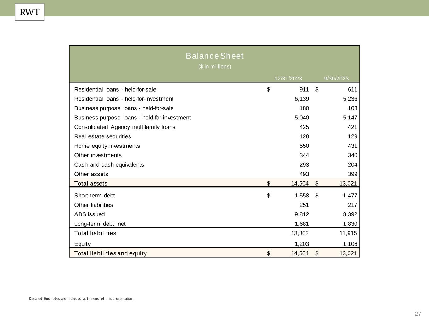 26 Detailed Endnotes are included at the end of this presentation. Income Statement ($ in millions, except per share data) Three Months Ended 12/31/2023 9/30/2023 Net interest income Investment portfolio $ 31 $ 31 Mortgage banking 2 2 Corporate (unsecured debt)(1) (12) (13) Total net interest income 20 20 Non-interest income (loss) Residential consumer mortgage banking activities, net 8 9 Residential investor mortgage banking activities, net 6 10 Investment fair value changes, net 15 (42) HEI income, net 12 10 Other income, net 2 2 Realized gains, net 1 — Total non-interest income (loss), net 44 (10) General and administrative expenses (32) (30) Portfolio management costs (4) (4) Loan acquisition costs (3) (2) Other expenses (3) (5) Provision for income taxes (1) (2) Net income (loss) $ 21 $ (31) Dividends on preferred stock (2) (2) Net income (loss) available (related) to common stockholders $ 19 $ (33) Earnings (loss) per diluted common share $ 0.15 $ (0.29)