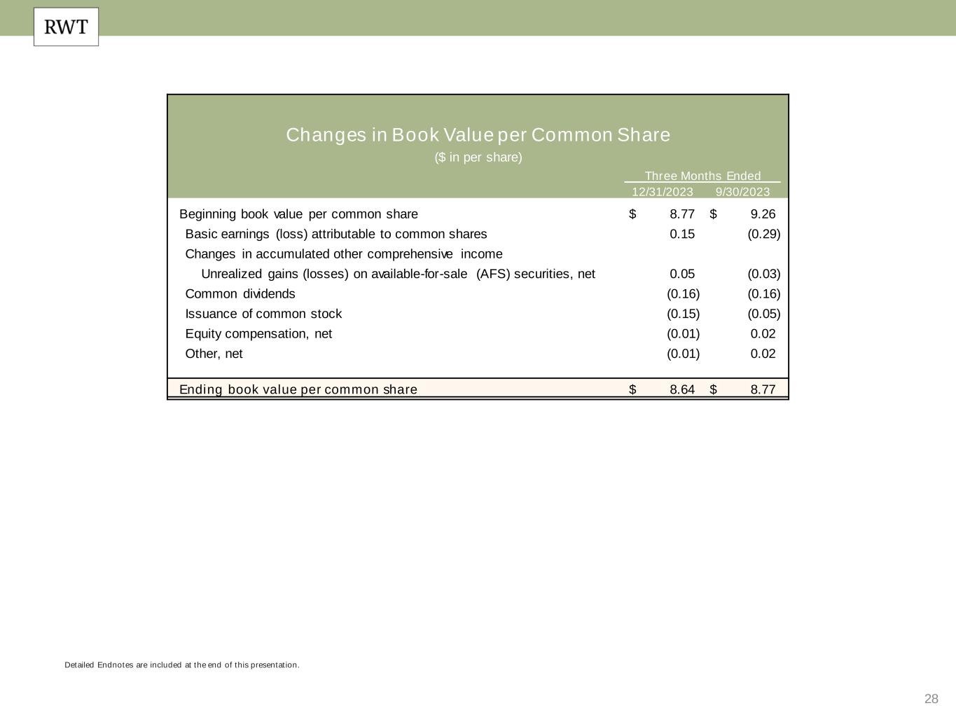 28 Detailed Endnotes are included at the end of this presentation. Changes in Book Value per Common Share ($ in per share) Three Months Ended 12/31/2023 9/30/2023 Beginning book value per common share $ 8.77 $ 9.26 Basic earnings (loss) attributable to common shares 0.15 (0.29) Changes in accumulated other comprehensive income Unrealized gains (losses) on available-for-sale (AFS) securities, net 0.05 (0.03) Common dividends (0.16) (0.16) Issuance of common stock (0.15) (0.05) Equity compensation, net (0.01) 0.02 Other, net (0.01) 0.02 Ending book value per common share $ 8.64 $ 8.77