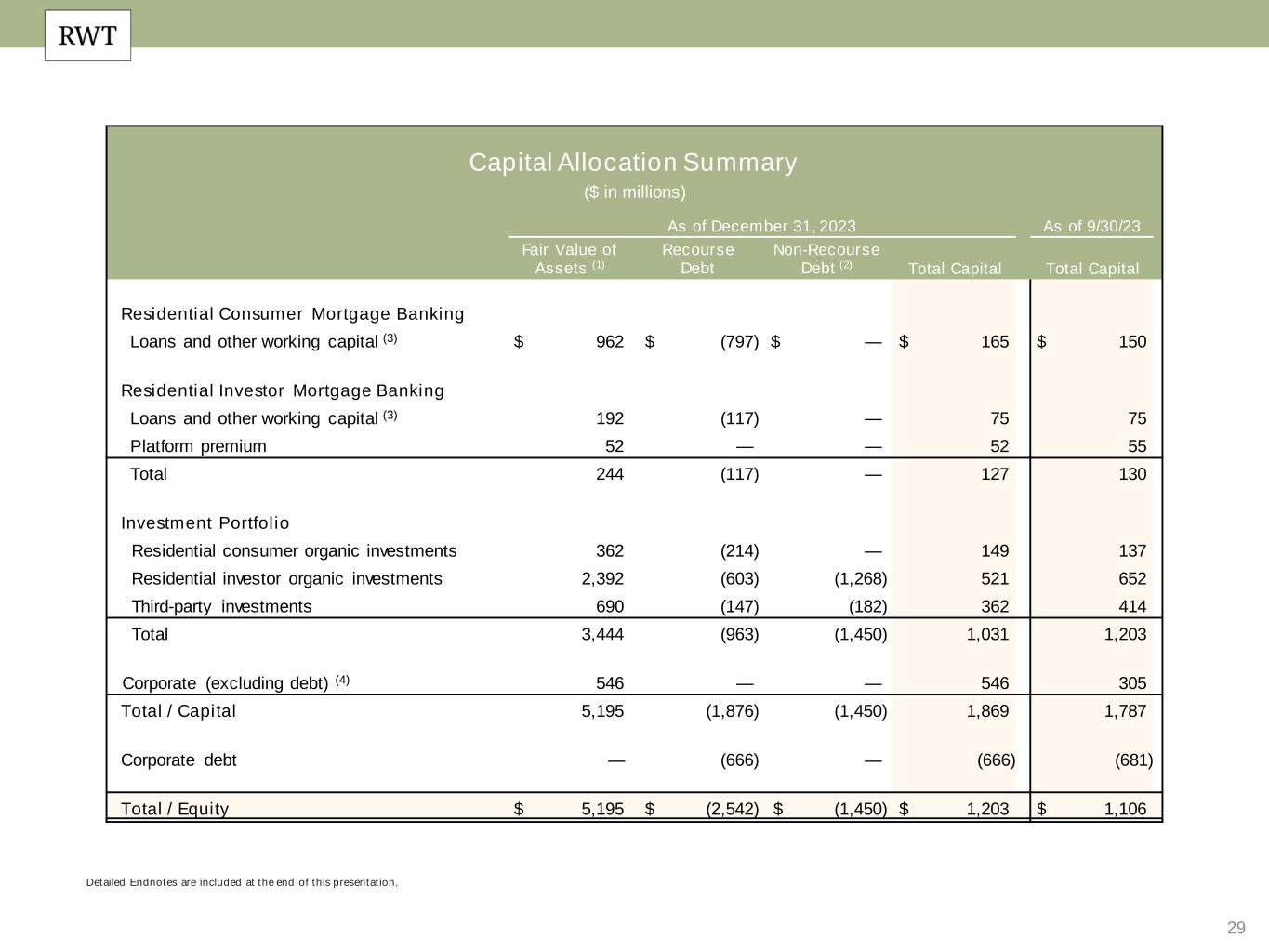 29 Detailed Endnotes are included at the end of this presentation. Capital Allocation Summary ($ in millions) As of December 31, 2023 As of 9/30/23 Fair Value of Assets (1) Recourse Debt Non-Recourse Debt (2) Total Capital Total Capital Residential Consumer Mortgage Banking Loans and other working capital (3) $ 962 $ (797) $ — $ 165 $ 150 Residential Investor Mortgage Banking Loans and other working capital (3) 192 (117) — 75 75 Platform premium 52 — — 52 55 Total 244 (117) — 127 130 Investment Portfolio Residential consumer organic investments 362 (214) — 149 137 Residential investor organic investments 2,392 (603) (1,268) 521 652 Third-party investments 690 (147) (182) 362 414 Total 3,444 (963) (1,450) 1,031 1,203 Corporate (excluding debt) (4) 546 — — 546 305 Total / Capital 5,195 (1,876) (1,450) 1,869 1,787 Corporate debt — (666) — (666) (681) Total / Equity $ 5,195 $ (2,542) $ (1,450) $ 1,203 $ 1,106