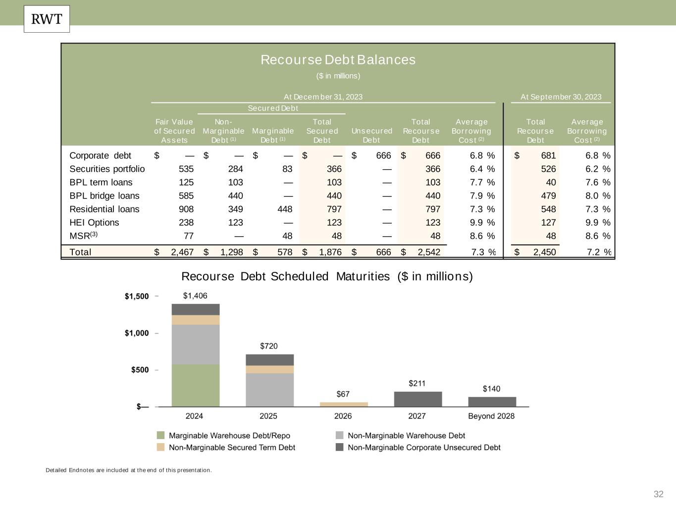 32 Detailed Endnotes are included at the end of this presentation. Recourse Debt Scheduled Maturities ($ in millions) Recourse Debt Balances ($ in millions) At December 31, 2023 At September 30, 2023 Secured Debt Fair Value of Secured Assets Non- Marginable Debt (1) Marginable Debt (1) Total Secured Debt Unsecured Debt Total Recourse Debt Average Borrowing Cost (2) Total Recourse Debt Average Borrowing Cost (2) Corporate debt $ — $ — $ — $ — $ 666 $ 666 6.8 % $ 681 6.8 % Securities portfolio 535 284 83 366 — 366 6.4 % 526 6.2 % BPL term loans 125 103 — 103 — 103 7.7 % 40 7.6 % BPL bridge loans 585 440 — 440 — 440 7.9 % 479 8.0 % Residential loans 908 349 448 797 — 797 7.3 % 548 7.3 % HEI Options 238 123 — 123 — 123 9.9 % 127 9.9 % MSR(3) 77 — 48 48 — 48 8.6 % 48 8.6 % Total $ 2,467 $ 1,298 $ 578 $ 1,876 $ 666 $ 2,542 7.3 % $ 2,450 7.2 %