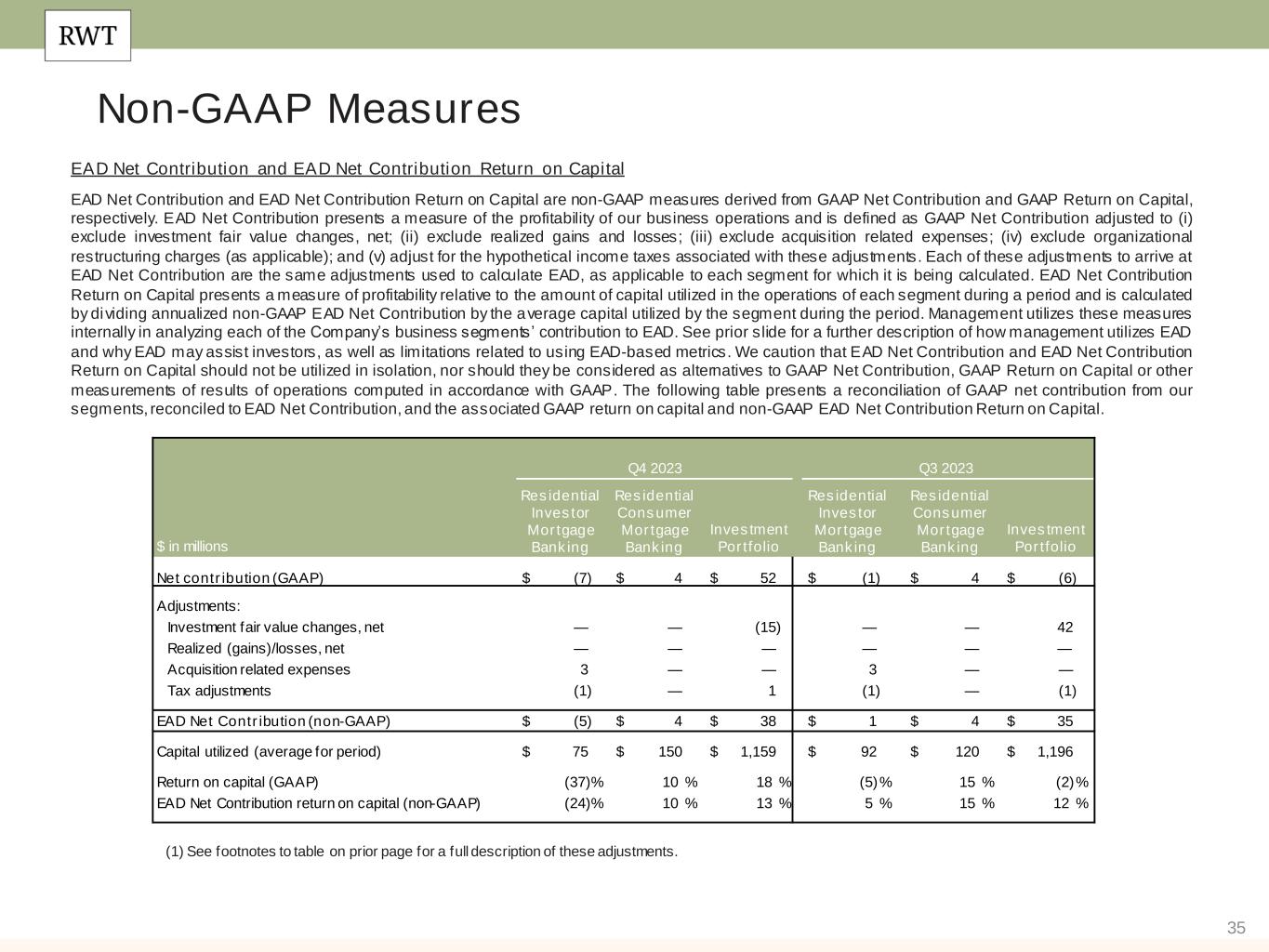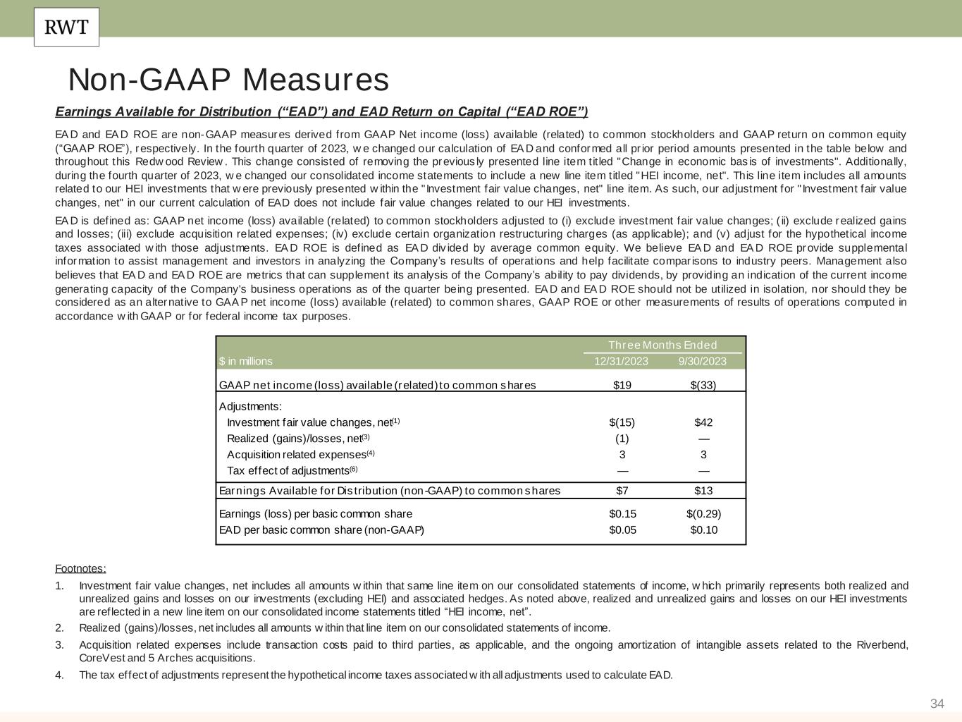 34 Non-GAAP Measures Earnings Available for Distribution (“EAD”) and EAD Return on Capital (“EAD ROE”) EA D and EA D ROE are non-GAAP measures derived from GAAP Net income (loss) available (related) to common stockholders and GAAP return on common equity (“GAAP ROE”), respectively. In the fourth quarter of 2023, w e changed our calculation of EA D and conformed all pr ior period amounts presented in the table below and throughout this Redw ood Review . This change consisted of removing the previous ly presented line item tit led "Change in economic bas is of investments". Additionally, during the fourth quarter of 2023, w e changed our consolidated income statements to include a new line item titled "HEI income, net". This line item includes all amounts related to our HEI investments that w ere previously presented w ithin the " Investment fair value changes, net" line item. As such, our adjustment for " Investment fair value changes, net" in our current calculation of EAD does not include fair value changes related to our HEI investments. EA D is defined as: GAAP net income (loss) available (related) to common stockholders adjusted to (i) exclude investment fair value changes; ( ii) exclude realized gains and losses; (iii) exclude acquisition related expenses; (iv) exclude certain organization restructuring charges (as applicable); and (v) adjust for the hypothetical income taxes associated w ith those adjustments. EA D ROE is defined as EA D div ided by average common equity. We believe EA D and EA D ROE provide supplemental information to assist management and investors in analyzing the Company’s results of operations and help facilitate compar isons to industry peers. Management also believes that EA D and EA D ROE are metrics that can supplement its analysis of the Company’s ability to pay dividends, by providing an indication of the current income generating capacity of the Company's business operations as of the quarter being presented. EA D and EA D ROE should not be utilized in isolation, nor should they be considered as an alternative to GAA P net income (loss) available (related) to common shares, GAAP ROE or other measurements of results of operations computed in accordance w ith GAAP or for federal income tax purposes. $ in millions Footnotes: 1. Investment fair value changes, net includes all amounts w ithin that same line item on our consolidated statements of income, w hich primarily represents both realized and unrealized gains and losses on our investments (excluding HEI) and associated hedges. As noted above, realized and unrealized gains and losses on our HEI investments are reflected in a new line item on our consolidated income statements titled “HEI income, net”. 2. Realized (gains)/losses, net includes all amounts w ithin that line item on our consolidated statements of income. 3. Acquisition related expenses include transaction costs paid to third parties, as applicable, and the ongoing amortization of intangible assets related to the Riverbend, CoreVest and 5 Arches acquisitions. 4. The tax effect of adjustments represent the hypothetical income taxes associated w ith all adjustments used to calculate EAD. Three Months Ended $ in millions 12/31/2023 9/30/2023 GAAP net income (loss) available (related) to common shares $19 $(33) Adjustments: Investment fair value changes, net(1) $(15) $42 Realized (gains)/losses, net(3) (1) — Acquisition related expenses(4) 3 3 Tax effect of adjustments(6) — — Earnings Available for Distribution (non-GAAP) to common shares $7 $13 Earnings (loss) per basic common share $0.15 $(0.29) EAD per basic common share (non-GAAP) $0.05 $0.10