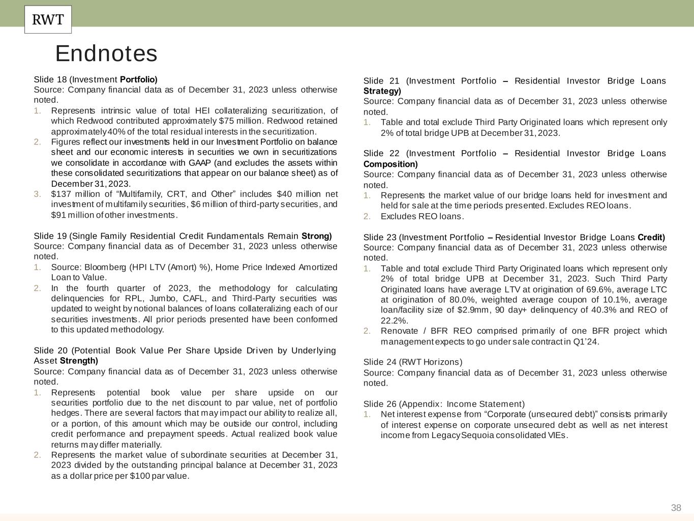 37 Endnotes Slide 5 (Q4’23 Business Performance)​ Source: Company financial data as of December 31, 2023 unless otherwise noted. 1. Lock volume represents loans identified for purchase from loan sellers. Lock volume does not account for potential fallout from pipeline that typically occurs through the lending process. 2. Includes Q1’24 activity through February 16, 2024. Slide 7 (2024 Positioning)​ Source: Company financial data as of December 31, 2023 unless otherwise noted. 1. Source: FDIC. Based on largest banks by assets. Excludes banks that do not have active mortgage origination platforms or that have been acquired. 2. Includes Q1’24 activity through February 16, 2024. 3. Represents potential book value per share upside on our securities portfolio due to the net discount to par value, net of portfolio hedges. There are several factors that may impact our ability to realize all, or a portion, of this amount which may be outside our control, including credit performance and prepayment speeds. Actual realized book value returns may differ materially. 4. Single-Family residential investments refers to all capital allocated to the Investment Portfolio, including nominal amount of capital allocated to Freddie K-Series and CAFL securities with multifamily collateral and excluding capital allocated to Multifamily Bridge. Slide 8 (Strategic Progress in Residential Consumer Mortgage Banking…)​ Source: Company financial data as of December 31, 2023 unless otherwise noted. 1. Redwood market share based on Redwood’s 2H’23 jumbo lock volume divided by 2H’23 industry jumbo lock volume (Source: Inside Mortgage Finance). 2. Source: Market share data based on Inside Mortgage Finance total jumbo origination production for top 50 jumbo loan originators Q1’21 through Q3’23. 3. Lock volume represents loans identified for purchase from loan sellers. Lock volume does not account for potential fallout from pipeline that typically occurs through the lending process. Slide 9 (…with Substantial Opportunity for Growth​) 1. Represents management’s expectations and actual results may differ materially. 2. Source: JP Morgan Research, CoreLogic, Bank Filings and S&P. 3. Source: Data based on Inside Mortgage Finance total jumbo origination production Q1’21 through Q3’23. Slide 10 (Active Balance Sheet Management)​ Source: Company financial data as of December 31, 2023 unless otherwise noted. 1. Certain data within this timeline represents activities that occurred after December 31, 2023. Q1’24 represents activity through February 16, 2024. Slide 11 (Robust Liquidity Supports Capital Deployment Opportunities) Source: Company financial data as of December 31, 2023 unless otherwise noted. 1. Represents unrestricted cash and cash equivalent position as of February 16, 2024. 2. Represents management’s estimates and actual results may differ materially. Slide 12 (Continued Evolution of Distribution Channels)​ Source: Company financial data as of December 31, 2023 unless otherwise noted. Slide 15 (Residential Consumer Mortgage Banking)​ Source: Company financial data as of December 31, 2023 unless otherwise noted. 1. Lock volume represents loans identified for purchase from loan sellers. Lock volume does not account for potential fallout from pipeline that typically occurs through the lending process. 2. Includes Q1’24 activity through February 16, 2024. Slide 16 (Residential Investor Mortgage Banking)​ Source: Company financial data as of December 31, 2023 unless otherwise noted. 1. Composition percentages are based on unpaid principal balance.