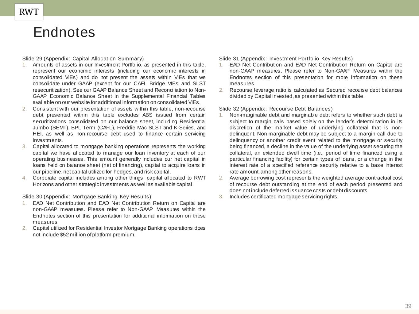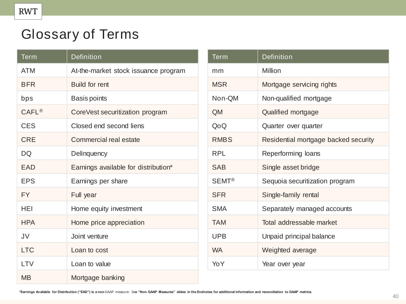 39 Endnotes Slide 29 (Appendix: Capital Allocation Summary) 1. Amounts of assets in our Investment Portfolio, as presented in this table, represent our economic interests (including our economic interests in consolidated VIEs) and do not present the assets within VIEs that we consolidate under GAAP (except for our CAFL Bridge VIEs and SLST resecuritization). See our GAAP Balance Sheet and Reconciliation to Non- GAAP Economic Balance Sheet in the Supplemental Financial Tables available on our website for additional information on consolidated VIEs. 2. Consistent with our presentation of assets within this table, non-recourse debt presented within this table excludes ABS issued from certain securitizations consolidated on our balance sheet, including Residential Jumbo (SEMT), BPL Term (CAFL), Freddie Mac SLST and K-Series, and HEI, as well as non-recourse debt used to finance certain servicing investments. 3. Capital allocated to mortgage banking operations represents the working capital we have allocated to manage our loan inventory at each of our operating businesses. This amount generally includes our net capital in loans held on balance sheet (net of financing), capital to acquire loans in our pipeline, net capital utilized for hedges, and risk capital. 4. Corporate capital includes among other things, capital allocated to RWT Horizons and other strategic investments as well as available capital. Slide 30 (Appendix: Mortgage Banking Key Results) 1. EAD Net Contribution and EAD Net Contribution Return on Capital are non-GAAP measures. Please refer to Non-GAAP Measures within the Endnotes section of this presentation for additional information on these measures. 2. Capital utilized for Residential Investor Mortgage Banking operations does not include $52 million of platform premium. Slide 31 (Appendix: Investment Portfolio Key Results) 1. EAD Net Contribution and EAD Net Contribution Return on Capital are non-GAAP measures. Please refer to Non-GAAP Measures within the Endnotes section of this presentation for more information on these measures. 2. Recourse leverage ratio is calculated as Secured recourse debt balances divided by Capital invested, as presented within this table. Slide 32 (Appendix: Recourse Debt Balances) 1. Non-marginable debt and marginable debt refers to whether such debt is subject to margin calls based solely on the lender’s determination in its discretion of the market value of underlying collateral that is non- delinquent. Non-marginable debt may be subject to a margin call due to delinquency or another credit event related to the mortgage or security being financed, a decline in the value of the underlying asset securing the collateral, an extended dwell time (i.e., period of time financed using a particular financing facility) for certain types of loans, or a change in the interest rate of a specified reference security relative to a base interest rate amount, among other reasons. 2. Average borrowing cost represents the weighted average contractual cost of recourse debt outstanding at the end of each period presented and does not include deferred issuance costs or debt discounts. 3. Includes certificated mortgage servicing rights.