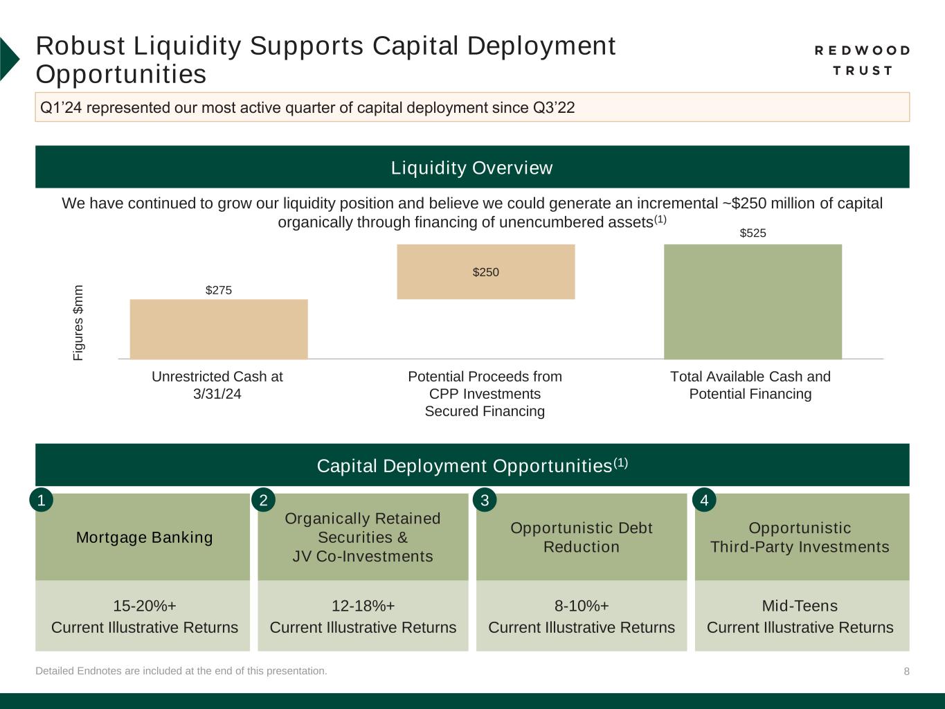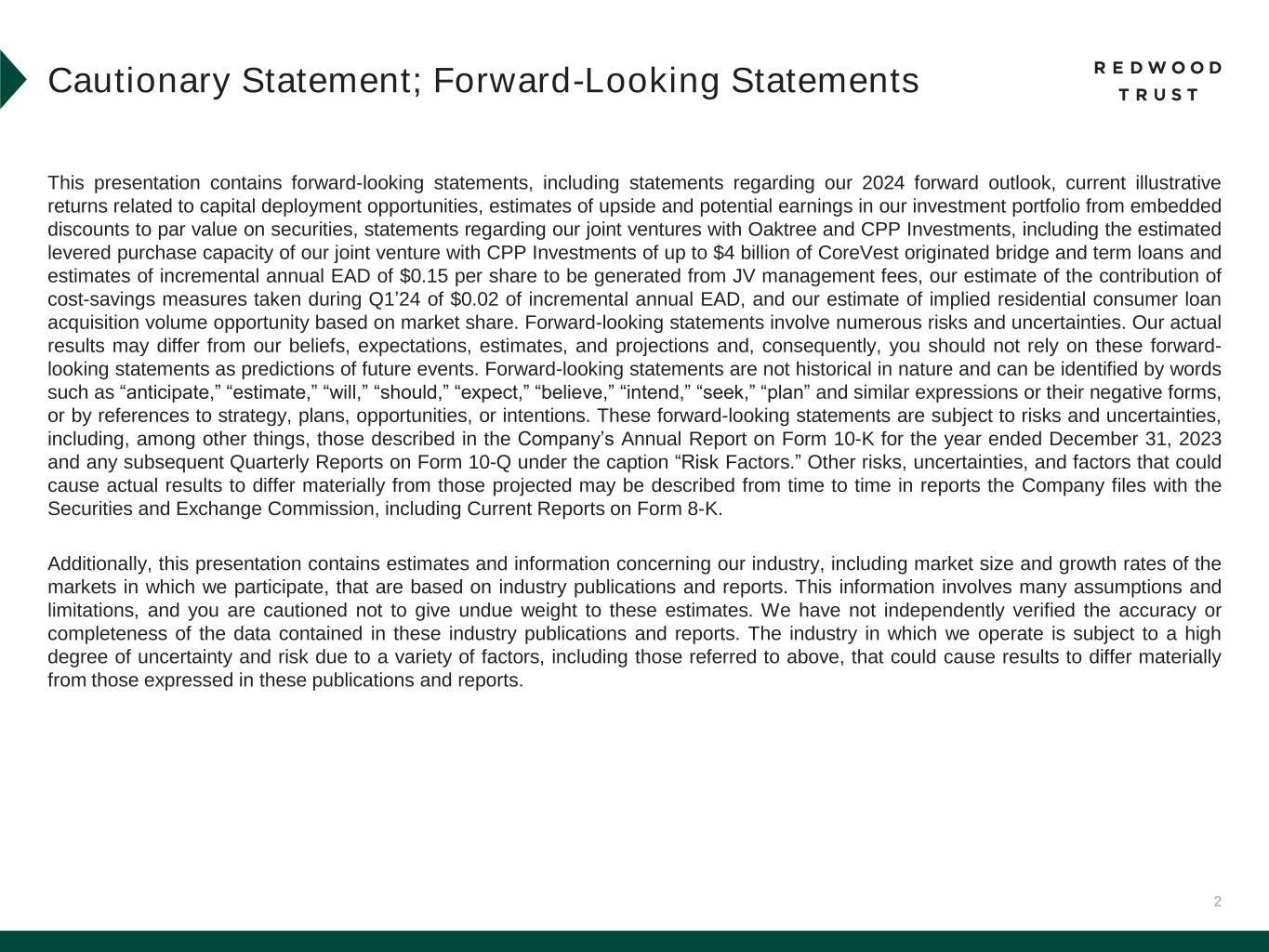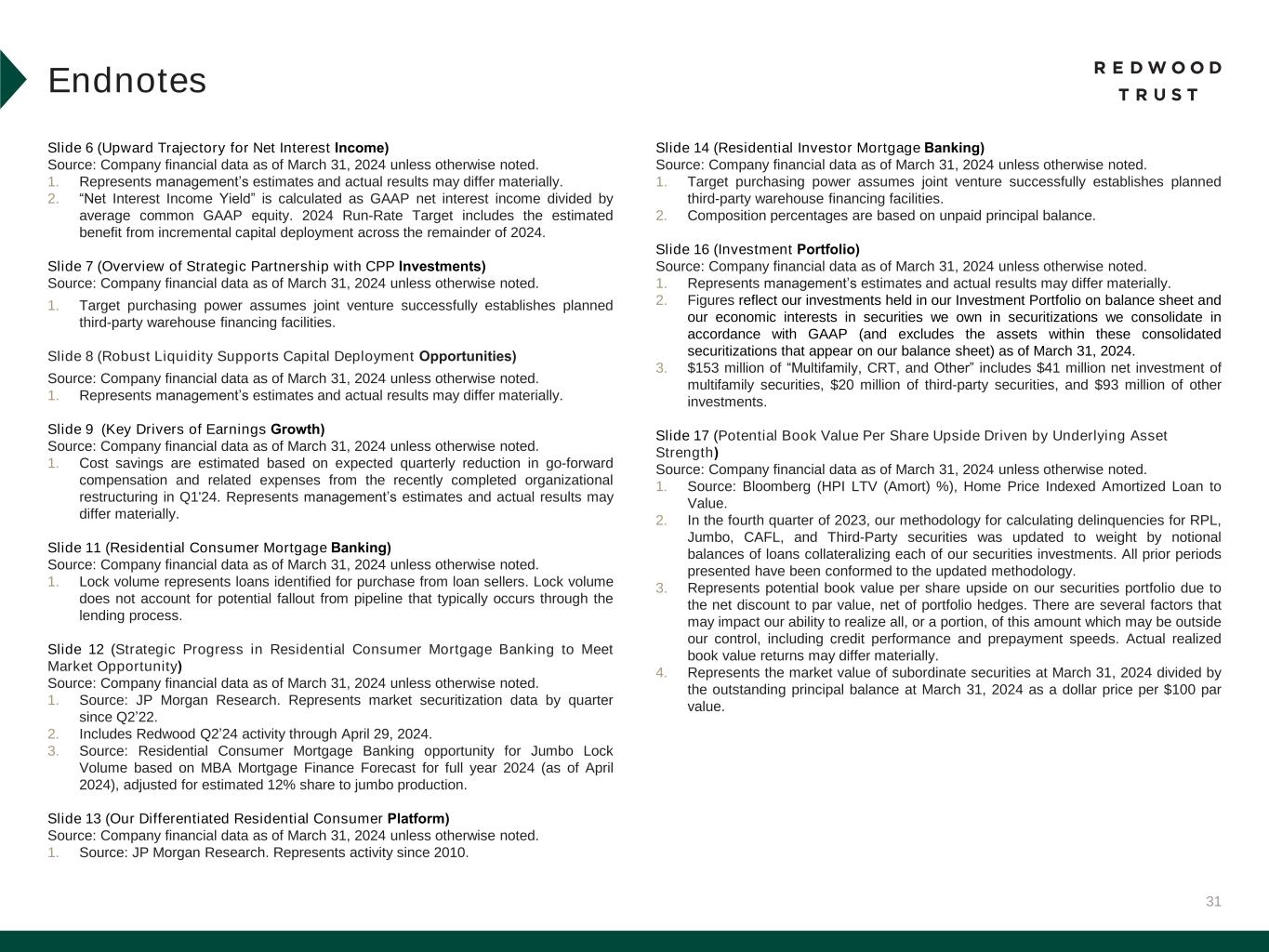 31 Slide 6 (Upward Trajectory for Net Interest Income)​ Source: Company financial data as of March 31, 2024 unless otherwise noted. 1. Represents management’s estimates and actual results may differ materially. 2. “Net Interest Income Yield” is calculated as GAAP net interest income divided by average common GAAP equity. 2024 Run-Rate Target includes the estimated benefit from incremental capital deployment across the remainder of 2024. Slide 7 (Overview of Strategic Partnership with CPP Investments)​ Source: Company financial data as of March 31, 2024 unless otherwise noted. 1. Target purchasing power assumes joint venture successfully establishes planned third-party warehouse financing facilities. Slide 8 (Robust Liquidity Supports Capital Deployment Opportunities​) Source: Company financial data as of March 31, 2024 unless otherwise noted. 1. Represents management’s estimates and actual results may differ materially. Slide 9 (Key Drivers of Earnings Growth)​ Source: Company financial data as of March 31, 2024 unless otherwise noted. 1. Cost savings are estimated based on expected quarterly reduction in go-forward compensation and related expenses from the recently completed organizational restructuring in Q1'24. Represents management’s estimates and actual results may differ materially. Slide 11 (Residential Consumer Mortgage Banking)​ Source: Company financial data as of March 31, 2024 unless otherwise noted. 1. Lock volume represents loans identified for purchase from loan sellers. Lock volume does not account for potential fallout from pipeline that typically occurs through the lending process. Slide 12 (Strategic Progress in Residential Consumer Mortgage Banking to Meet Market Opportunity)​ Source: Company financial data as of March 31, 2024 unless otherwise noted. 1. Source: JP Morgan Research. Represents market securitization data by quarter since Q2’22. 2. Includes Redwood Q2’24 activity through April 29, 2024. 3. Source: Residential Consumer Mortgage Banking opportunity for Jumbo Lock Volume based on MBA Mortgage Finance Forecast for full year 2024 (as of April 2024), adjusted for estimated 12% share to jumbo production. Slide 13 (Our Differentiated Residential Consumer Platform)​ Source: Company financial data as of March 31, 2024 unless otherwise noted. 1. Source: JP Morgan Research. Represents activity since 2010. Slide 14 (Residential Investor Mortgage Banking)​ Source: Company financial data as of March 31, 2024 unless otherwise noted. 1. Target purchasing power assumes joint venture successfully establishes planned third-party warehouse financing facilities. 2. Composition percentages are based on unpaid principal balance. Slide 16 (Investment Portfolio)​ Source: Company financial data as of March 31, 2024 unless otherwise noted. 1. Represents management’s estimates and actual results may differ materially. 2. Figures reflect our investments held in our Investment Portfolio on balance sheet and our economic interests in securities we own in securitizations we consolidate in accordance with GAAP (and excludes the assets within these consolidated securitizations that appear on our balance sheet) as of March 31, 2024. 3. $153 million of “Multifamily, CRT, and Other” includes $41 million net investment of multifamily securities, $20 million of third-party securities, and $93 million of other investments. Slide 17 (Potential Book Value Per Share Upside Driven by Underlying Asset Strength)​ Source: Company financial data as of March 31, 2024 unless otherwise noted. 1. Source: Bloomberg (HPI LTV (Amort) %), Home Price Indexed Amortized Loan to Value. 2. In the fourth quarter of 2023, our methodology for calculating delinquencies for RPL, Jumbo, CAFL, and Third-Party securities was updated to weight by notional balances of loans collateralizing each of our securities investments. All prior periods presented have been conformed to the updated methodology. 3. Represents potential book value per share upside on our securities portfolio due to the net discount to par value, net of portfolio hedges. There are several factors that may impact our ability to realize all, or a portion, of this amount which may be outside our control, including credit performance and prepayment speeds. Actual realized book value returns may differ materially. 4. Represents the market value of subordinate securities at March 31, 2024 divided by the outstanding principal balance at March 31, 2024 as a dollar price per $100 par value. Endnotes