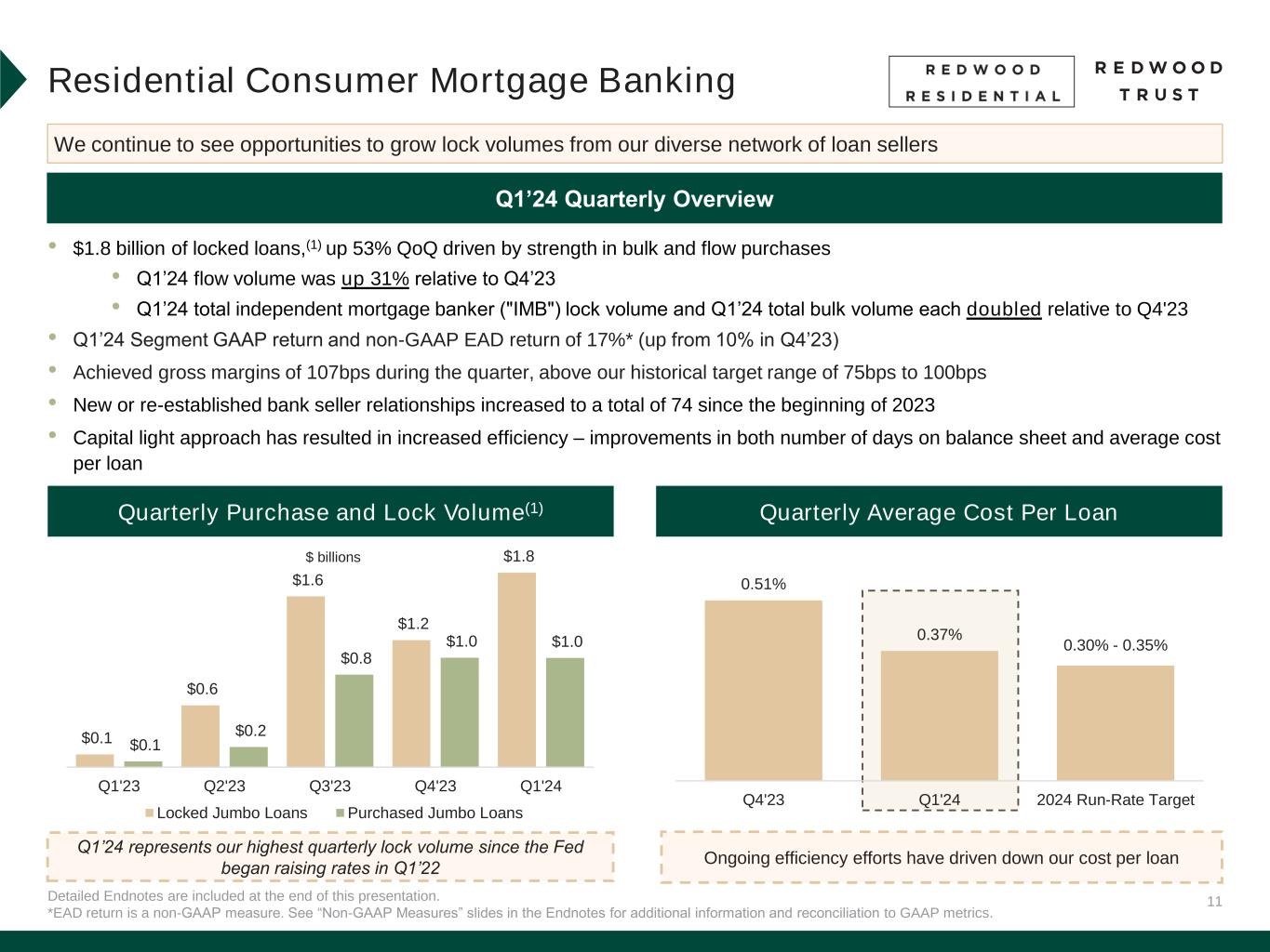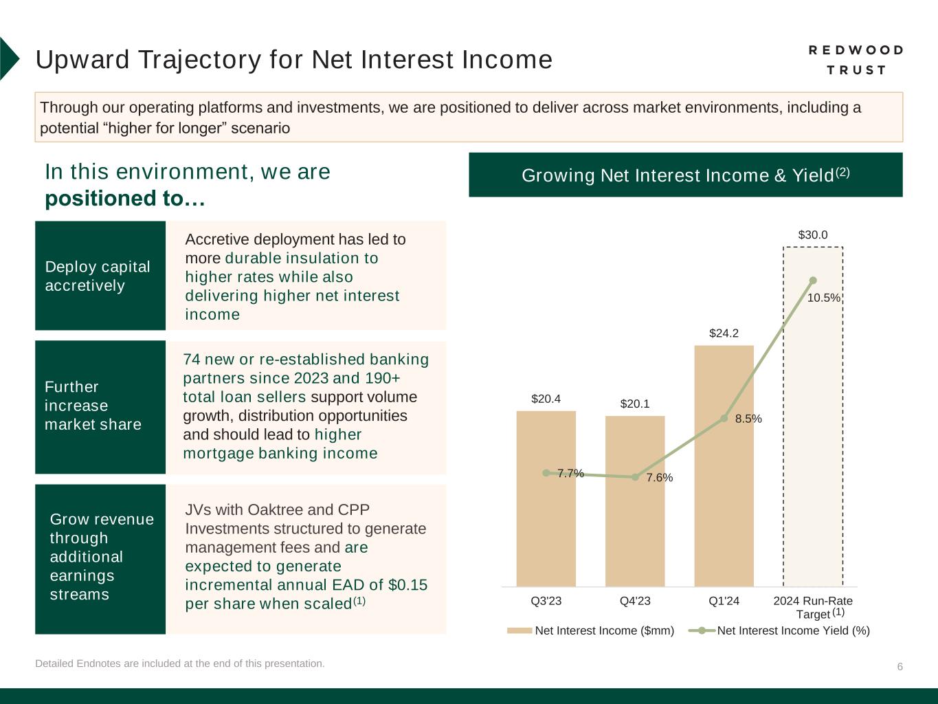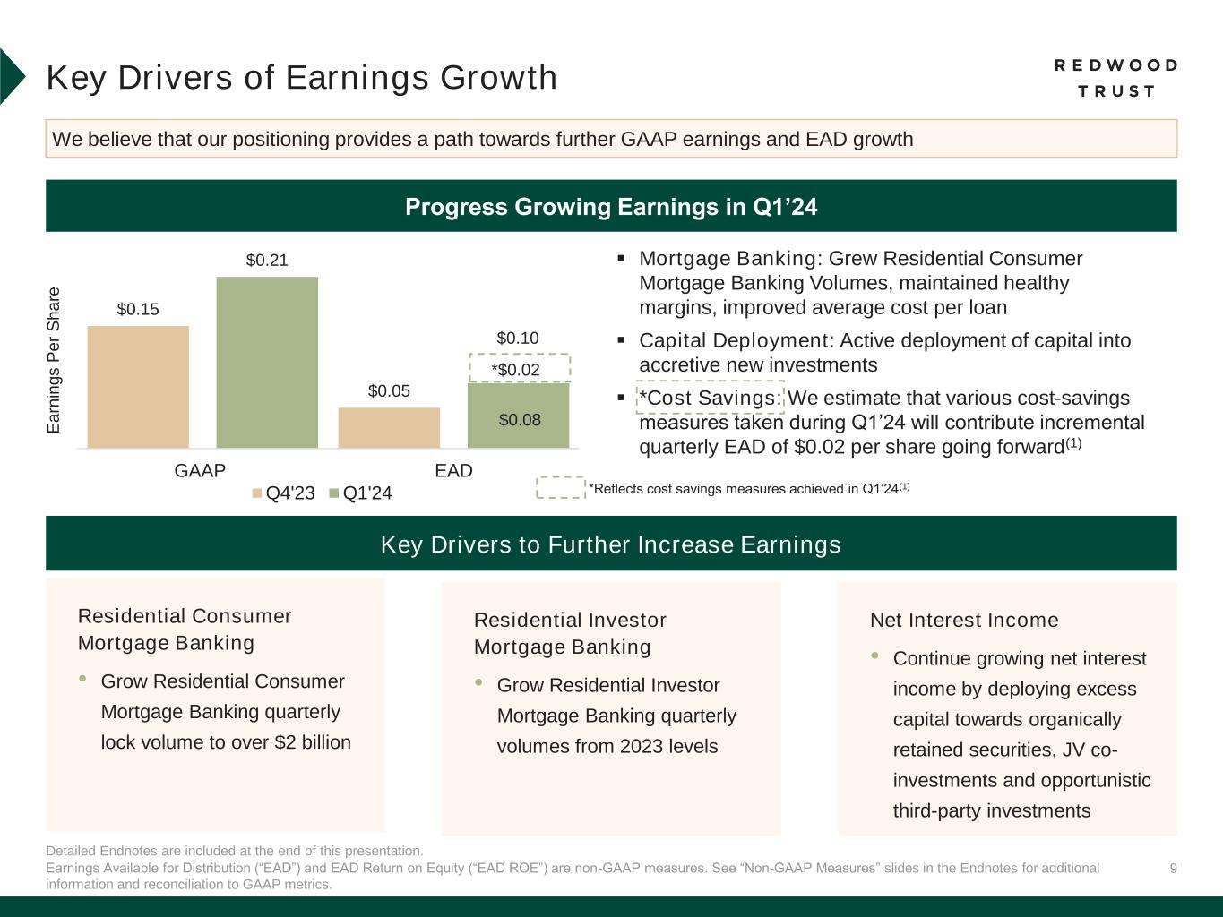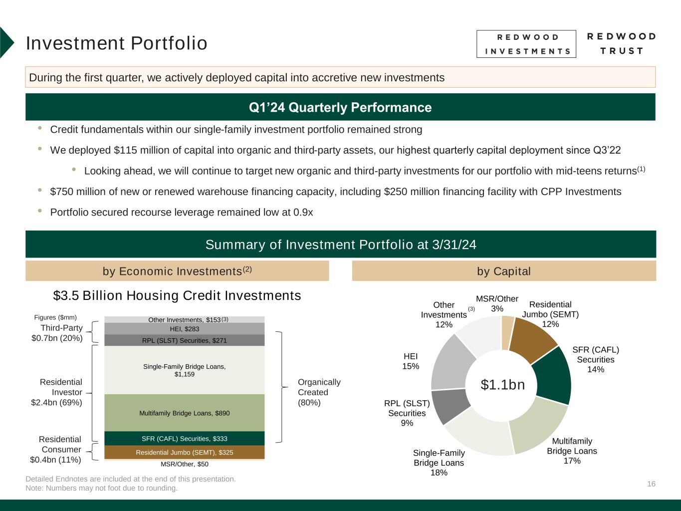 31 Slide 6 (Upward Trajectory for Net Interest Income)​ Source: Company financial data as of March 31, 2024 unless otherwise noted. 1. Represents management’s estimates and actual results may differ materially. 2. “Net Interest Income Yield” is calculated as GAAP net interest income divided by average common GAAP equity. 2024 Run-Rate Target includes the estimated benefit from incremental capital deployment across the remainder of 2024. Slide 7 (Overview of Strategic Partnership with CPP Investments)​ Source: Company financial data as of March 31, 2024 unless otherwise noted. 1. Target purchasing power assumes joint venture successfully establishes planned third-party warehouse financing facilities. Slide 8 (Robust Liquidity Supports Capital Deployment Opportunities​) Source: Company financial data as of March 31, 2024 unless otherwise noted. 1. Represents management’s estimates and actual results may differ materially. Slide 9 (Key Drivers of Earnings Growth)​ Source: Company financial data as of March 31, 2024 unless otherwise noted. 1. Cost savings are estimated based on expected quarterly reduction in go-forward compensation and related expenses from the recently completed organizational restructuring in Q1'24. Represents management’s estimates and actual results may differ materially. Slide 11 (Residential Consumer Mortgage Banking)​ Source: Company financial data as of March 31, 2024 unless otherwise noted. 1. Lock volume represents loans identified for purchase from loan sellers. Lock volume does not account for potential fallout from pipeline that typically occurs through the lending process. Slide 12 (Strategic Progress in Residential Consumer Mortgage Banking to Meet Market Opportunity)​ Source: Company financial data as of March 31, 2024 unless otherwise noted. 1. Source: JP Morgan Research. Represents market securitization data by quarter since Q2’22. 2. Includes Redwood Q2’24 activity through April 29, 2024. 3. Source: Residential Consumer Mortgage Banking opportunity for Jumbo Lock Volume based on MBA Mortgage Finance Forecast for full year 2024 (as of April 2024), adjusted for estimated 12% share to jumbo production. Slide 13 (Our Differentiated Residential Consumer Platform)​ Source: Company financial data as of March 31, 2024 unless otherwise noted. 1. Source: JP Morgan Research. Represents activity since 2010. Slide 14 (Residential Investor Mortgage Banking)​ Source: Company financial data as of March 31, 2024 unless otherwise noted. 1. Target purchasing power assumes joint venture successfully establishes planned third-party warehouse financing facilities. 2. Composition percentages are based on unpaid principal balance. Slide 16 (Investment Portfolio)​ Source: Company financial data as of March 31, 2024 unless otherwise noted. 1. Represents management’s estimates and actual results may differ materially. 2. Figures reflect our investments held in our Investment Portfolio on balance sheet and our economic interests in securities we own in securitizations we consolidate in accordance with GAAP (and excludes the assets within these consolidated securitizations that appear on our balance sheet) as of March 31, 2024. 3. $153 million of “Multifamily, CRT, and Other” includes $41 million net investment of multifamily securities, $20 million of third-party securities, and $93 million of other investments. Slide 17 (Potential Book Value Per Share Upside Driven by Underlying Asset Strength)​ Source: Company financial data as of March 31, 2024 unless otherwise noted. 1. Source: Bloomberg (HPI LTV (Amort) %), Home Price Indexed Amortized Loan to Value. 2. In the fourth quarter of 2023, our methodology for calculating delinquencies for RPL, Jumbo, CAFL, and Third-Party securities was updated to weight by notional balances of loans collateralizing each of our securities investments. All prior periods presented have been conformed to the updated methodology. 3. Represents potential book value per share upside on our securities portfolio due to the net discount to par value, net of portfolio hedges. There are several factors that may impact our ability to realize all, or a portion, of this amount which may be outside our control, including credit performance and prepayment speeds. Actual realized book value returns may differ materially. 4. Represents the market value of subordinate securities at March 31, 2024 divided by the outstanding principal balance at March 31, 2024 as a dollar price per $100 par value. Endnotes