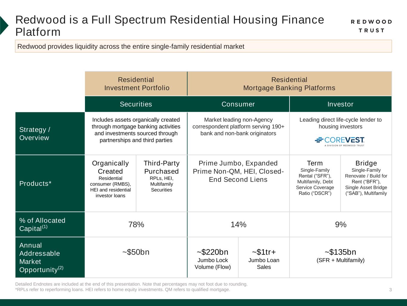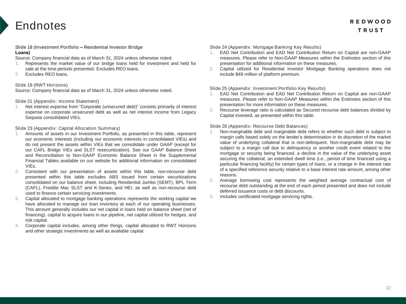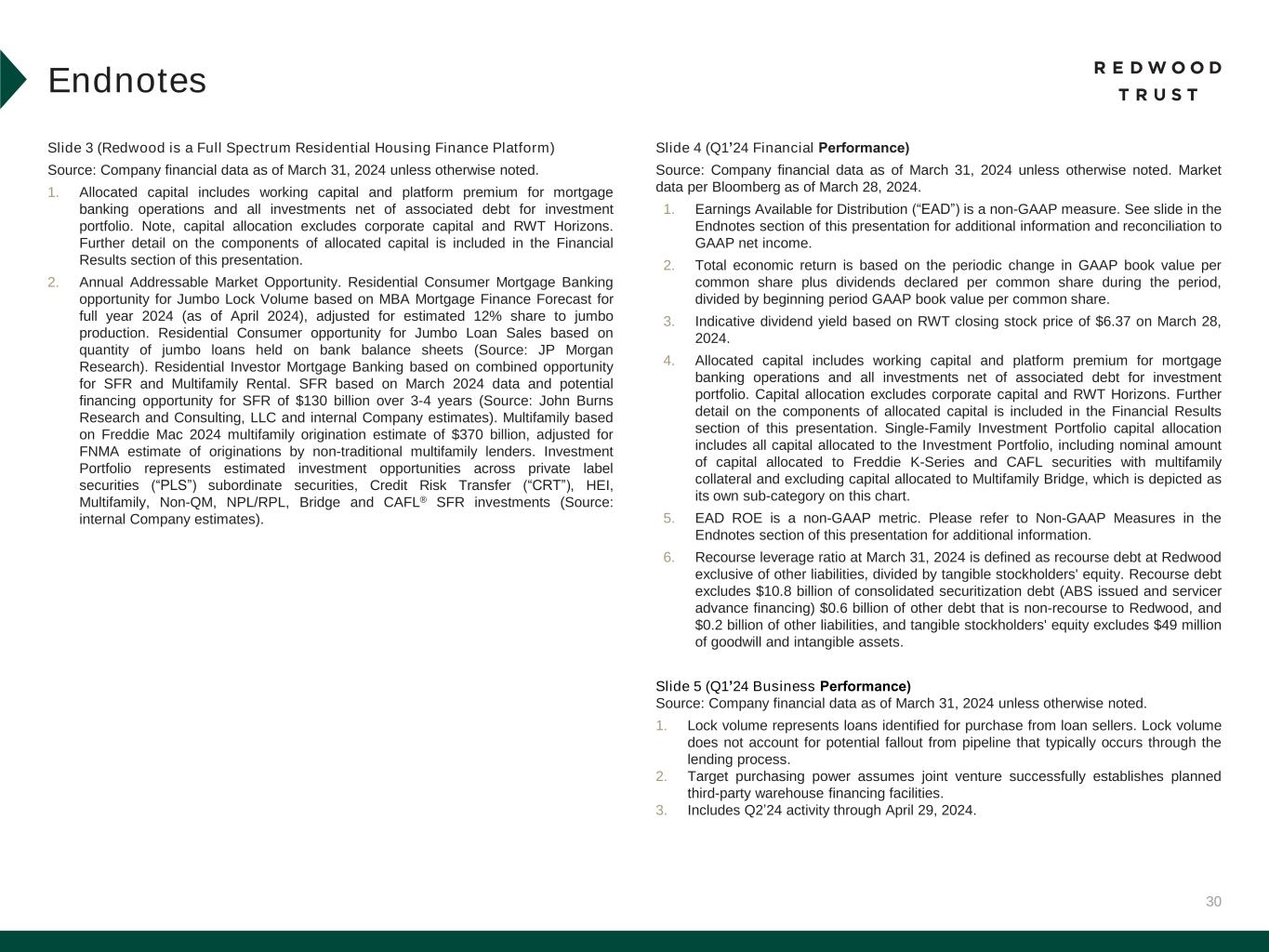 30 Slide 3 (Redwood is a Full Spectrum Residential Housing Finance Platform) Source: Company financial data as of March 31, 2024 unless otherwise noted. 1. Allocated capital includes working capital and platform premium for mortgage banking operations and all investments net of associated debt for investment portfolio. Note, capital allocation excludes corporate capital and RWT Horizons. Further detail on the components of allocated capital is included in the Financial Results section of this presentation. 2. Annual Addressable Market Opportunity. Residential Consumer Mortgage Banking opportunity for Jumbo Lock Volume based on MBA Mortgage Finance Forecast for full year 2024 (as of April 2024), adjusted for estimated 12% share to jumbo production. Residential Consumer opportunity for Jumbo Loan Sales based on quantity of jumbo loans held on bank balance sheets (Source: JP Morgan Research). Residential Investor Mortgage Banking based on combined opportunity for SFR and Multifamily Rental. SFR based on March 2024 data and potential financing opportunity for SFR of $130 billion over 3-4 years (Source: John Burns Research and Consulting, LLC and internal Company estimates). Multifamily based on Freddie Mac 2024 multifamily origination estimate of $370 billion, adjusted for FNMA estimate of originations by non-traditional multifamily lenders. Investment Portfolio represents estimated investment opportunities across private label securities (“PLS”) subordinate securities, Credit Risk Transfer (“CRT”), HEI, Multifamily, Non-QM, NPL/RPL, Bridge and CAFL® SFR investments (Source: internal Company estimates). Slide 4 (Q1’24 Financial Performance)​ Source: Company financial data as of March 31, 2024 unless otherwise noted. Market data per Bloomberg as of March 28, 2024. 1. Earnings Available for Distribution (“EAD”) is a non-GAAP measure. See slide in the Endnotes section of this presentation for additional information and reconciliation to GAAP net income. 2. Total economic return is based on the periodic change in GAAP book value per common share plus dividends declared per common share during the period, divided by beginning period GAAP book value per common share. 3. Indicative dividend yield based on RWT closing stock price of $6.37 on March 28, 2024. 4. Allocated capital includes working capital and platform premium for mortgage banking operations and all investments net of associated debt for investment portfolio. Capital allocation excludes corporate capital and RWT Horizons. Further detail on the components of allocated capital is included in the Financial Results section of this presentation. Single-Family Investment Portfolio capital allocation includes all capital allocated to the Investment Portfolio, including nominal amount of capital allocated to Freddie K-Series and CAFL securities with multifamily collateral and excluding capital allocated to Multifamily Bridge, which is depicted as its own sub-category on this chart. 5. EAD ROE is a non-GAAP metric. Please refer to Non-GAAP Measures in the Endnotes section of this presentation for additional information. 6. Recourse leverage ratio at March 31, 2024 is defined as recourse debt at Redwood exclusive of other liabilities, divided by tangible stockholders' equity. Recourse debt excludes $10.8 billion of consolidated securitization debt (ABS issued and servicer advance financing) $0.6 billion of other debt that is non-recourse to Redwood, and $0.2 billion of other liabilities, and tangible stockholders' equity excludes $49 million of goodwill and intangible assets. Slide 5 (Q1’24 Business Performance)​ Source: Company financial data as of March 31, 2024 unless otherwise noted. 1. Lock volume represents loans identified for purchase from loan sellers. Lock volume does not account for potential fallout from pipeline that typically occurs through the lending process. 2. Target purchasing power assumes joint venture successfully establishes planned third-party warehouse financing facilities. 3. Includes Q2’24 activity through April 29, 2024. Endnotes