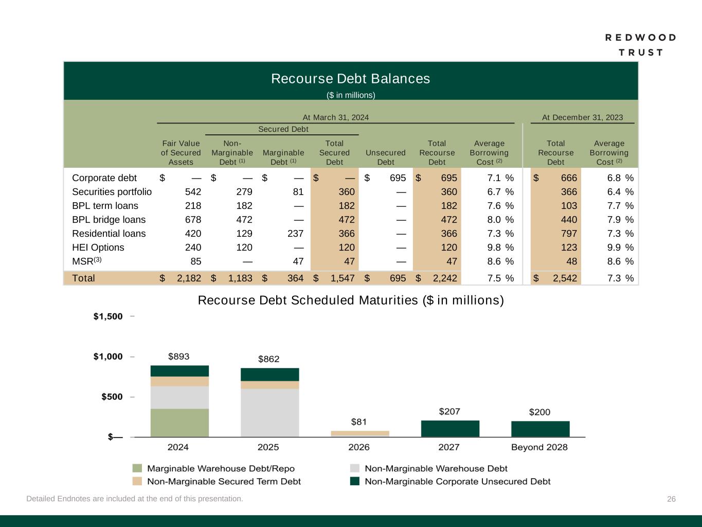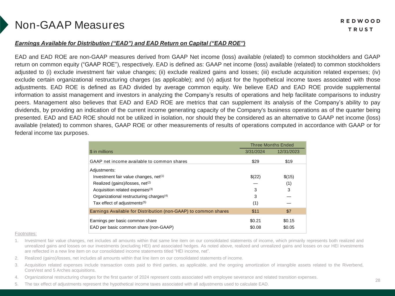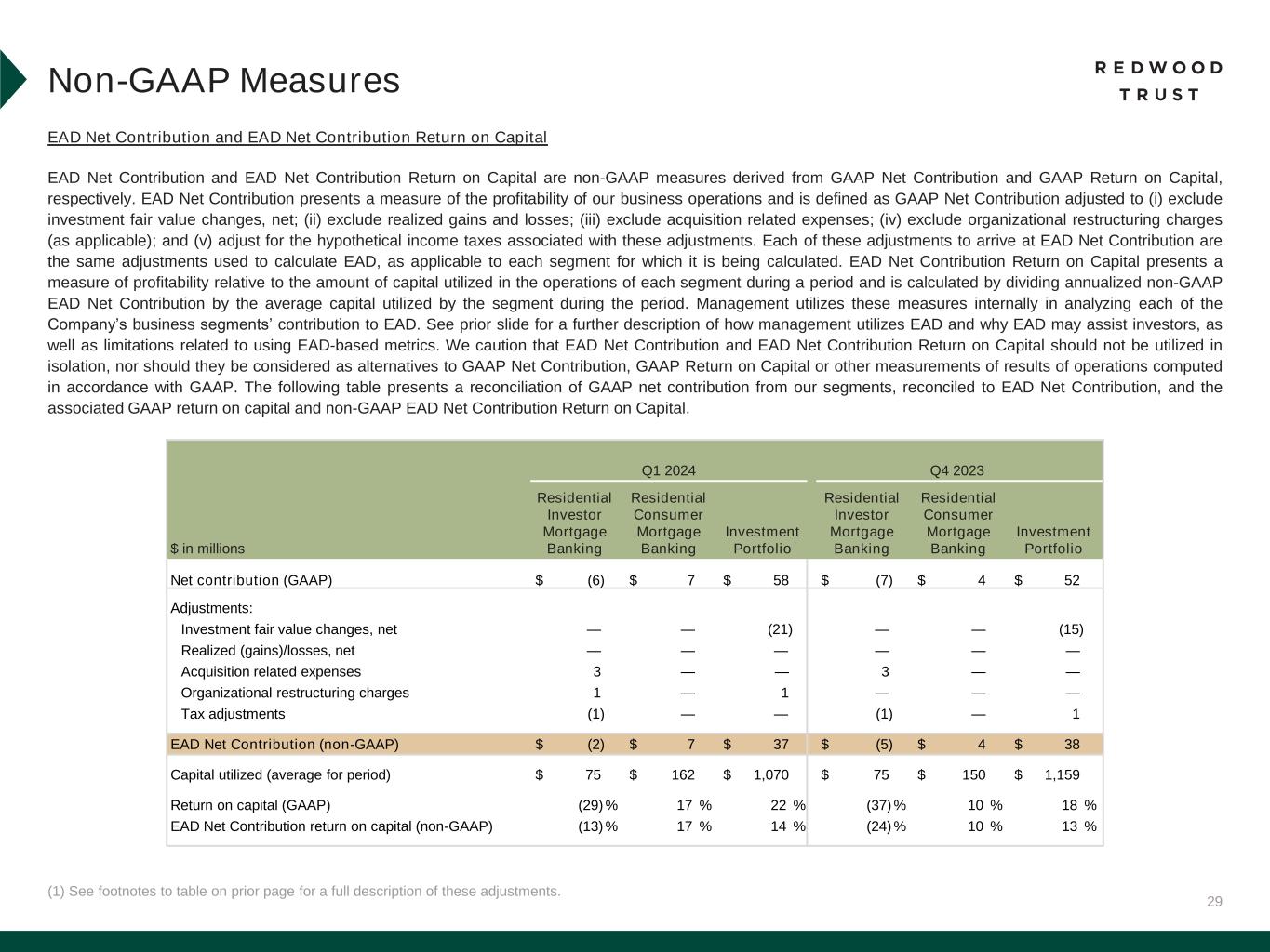 30 Slide 3 (Redwood is a Full Spectrum Residential Housing Finance Platform) Source: Company financial data as of March 31, 2024 unless otherwise noted. 1. Allocated capital includes working capital and platform premium for mortgage banking operations and all investments net of associated debt for investment portfolio. Note, capital allocation excludes corporate capital and RWT Horizons. Further detail on the components of allocated capital is included in the Financial Results section of this presentation. 2. Annual Addressable Market Opportunity. Residential Consumer Mortgage Banking opportunity for Jumbo Lock Volume based on MBA Mortgage Finance Forecast for full year 2024 (as of April 2024), adjusted for estimated 12% share to jumbo production. Residential Consumer opportunity for Jumbo Loan Sales based on quantity of jumbo loans held on bank balance sheets (Source: JP Morgan Research). Residential Investor Mortgage Banking based on combined opportunity for SFR and Multifamily Rental. SFR based on March 2024 data and potential financing opportunity for SFR of $130 billion over 3-4 years (Source: John Burns Research and Consulting, LLC and internal Company estimates). Multifamily based on Freddie Mac 2024 multifamily origination estimate of $370 billion, adjusted for FNMA estimate of originations by non-traditional multifamily lenders. Investment Portfolio represents estimated investment opportunities across private label securities (“PLS”) subordinate securities, Credit Risk Transfer (“CRT”), HEI, Multifamily, Non-QM, NPL/RPL, Bridge and CAFL® SFR investments (Source: internal Company estimates). Slide 4 (Q1’24 Financial Performance)​ Source: Company financial data as of March 31, 2024 unless otherwise noted. Market data per Bloomberg as of March 28, 2024. 1. Earnings Available for Distribution (“EAD”) is a non-GAAP measure. See slide in the Endnotes section of this presentation for additional information and reconciliation to GAAP net income. 2. Total economic return is based on the periodic change in GAAP book value per common share plus dividends declared per common share during the period, divided by beginning period GAAP book value per common share. 3. Indicative dividend yield based on RWT closing stock price of $6.37 on March 28, 2024. 4. Allocated capital includes working capital and platform premium for mortgage banking operations and all investments net of associated debt for investment portfolio. Capital allocation excludes corporate capital and RWT Horizons. Further detail on the components of allocated capital is included in the Financial Results section of this presentation. Single-Family Investment Portfolio capital allocation includes all capital allocated to the Investment Portfolio, including nominal amount of capital allocated to Freddie K-Series and CAFL securities with multifamily collateral and excluding capital allocated to Multifamily Bridge, which is depicted as its own sub-category on this chart. 5. EAD ROE is a non-GAAP metric. Please refer to Non-GAAP Measures in the Endnotes section of this presentation for additional information. 6. Recourse leverage ratio at March 31, 2024 is defined as recourse debt at Redwood exclusive of other liabilities, divided by tangible stockholders' equity. Recourse debt excludes $10.8 billion of consolidated securitization debt (ABS issued and servicer advance financing) $0.6 billion of other debt that is non-recourse to Redwood, and $0.2 billion of other liabilities, and tangible stockholders' equity excludes $49 million of goodwill and intangible assets. Slide 5 (Q1’24 Business Performance)​ Source: Company financial data as of March 31, 2024 unless otherwise noted. 1. Lock volume represents loans identified for purchase from loan sellers. Lock volume does not account for potential fallout from pipeline that typically occurs through the lending process. 2. Target purchasing power assumes joint venture successfully establishes planned third-party warehouse financing facilities. 3. Includes Q2’24 activity through April 29, 2024. Endnotes