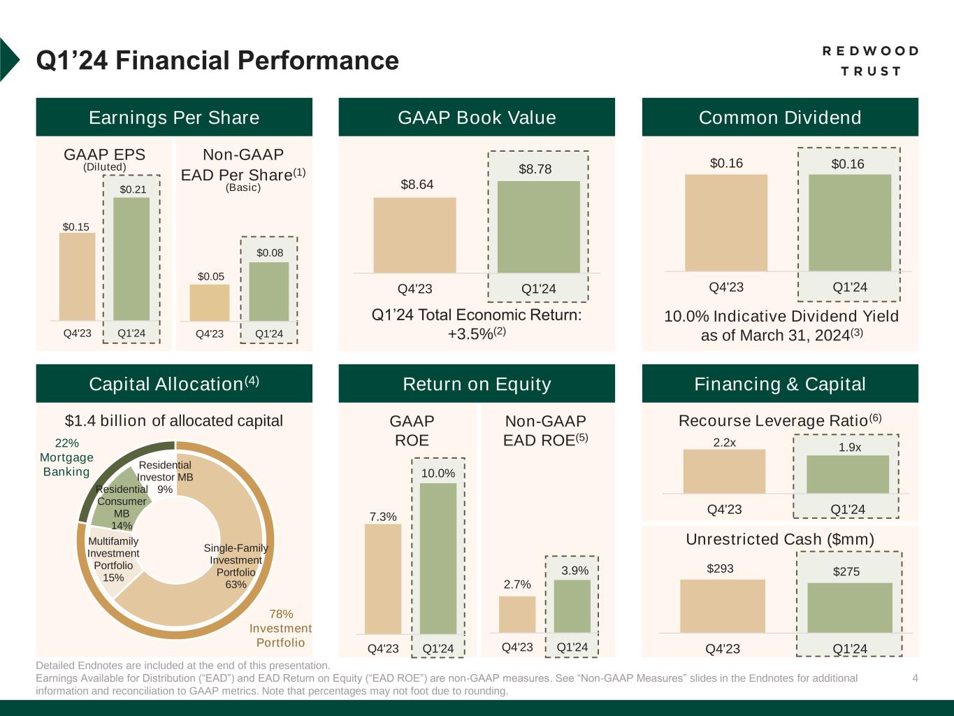 3 Detailed Endnotes are included at the end of this presentation. Note that percentages may not foot due to rounding. *RPLs refer to reperforming loans. HEI refers to home equity investments. QM refers to qualified mortgage. Redwood is a Full Spectrum Residential Housing Finance Platform Redwood provides liquidity across the entire single-family residential market Residential Investment Portfolio Residential Mortgage Banking Platforms Securities Consumer Investor Strategy / Overview Includes assets organically created through mortgage banking activities and investments sourced through partnerships and third parties Market leading non-Agency correspondent platform serving 190+ bank and non-bank originators Leading direct life-cycle lender to housing investors Products* Organically Created Residential consumer (RMBS), HEI and residential investor loans Third-Party Purchased RPLs, HEI, Multifamily Securities Prime Jumbo, Expanded Prime Non-QM, HEI, Closed- End Second Liens Term Single-Family Rental (“SFR”), Multifamily, Debt Service Coverage Ratio (“DSCR”) Bridge Single-Family Renovate / Build for Rent (“BFR”), Single Asset Bridge (“SAB”), Multifamily % of Allocated Capital(1) 78% 14% 9% Annual Addressable Market Opportunity(2) ~$50bn ~$220bn Jumbo Lock Volume (Flow) ~$1tr+ Jumbo Loan Sales ~$135bn (SFR + Multifamily)