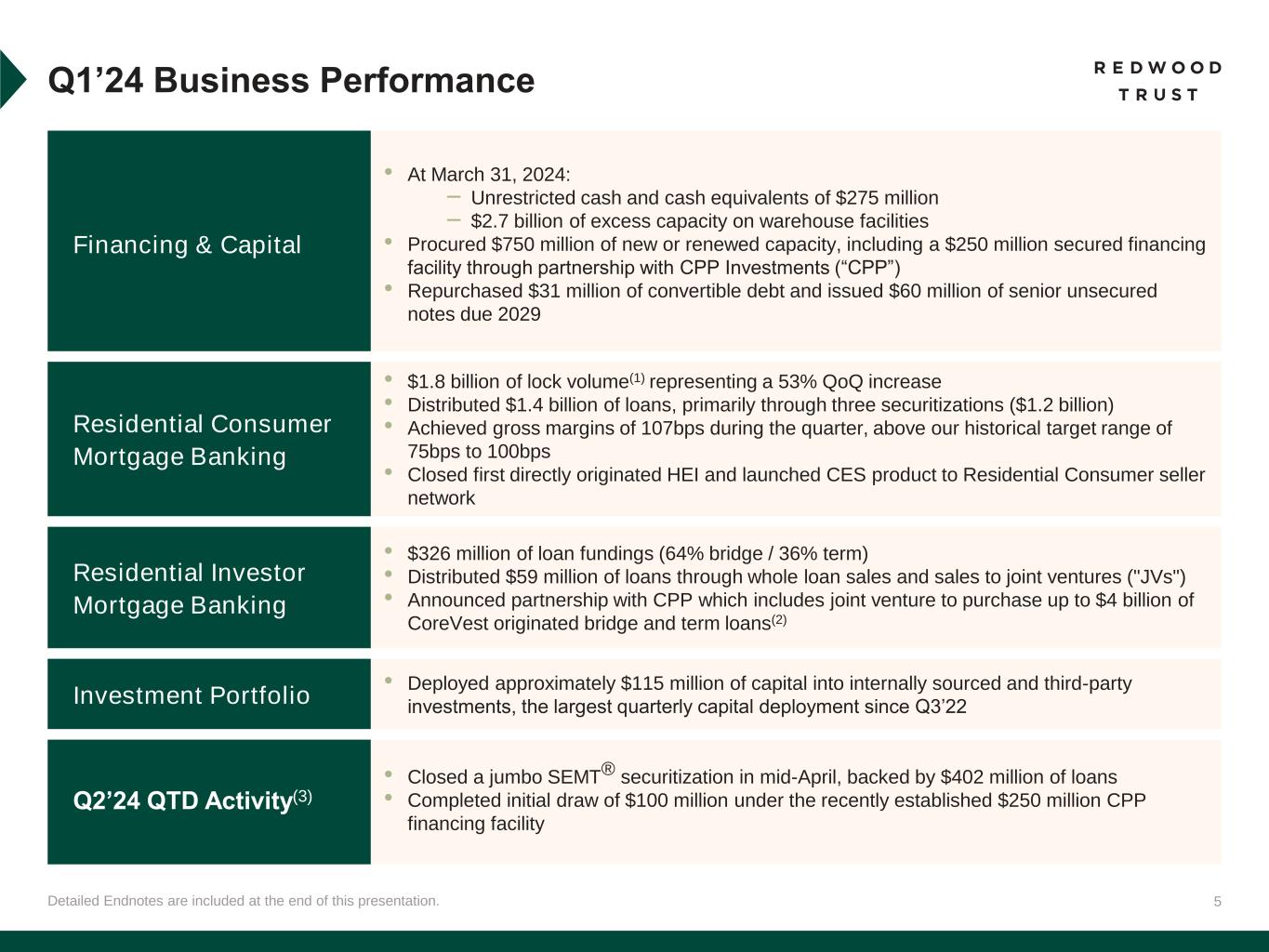 4 Detailed Endnotes are included at the end of this presentation. Earnings Available for Distribution (“EAD”) and EAD Return on Equity (“EAD ROE”) are non-GAAP measures. See “Non-GAAP Measures” slides in the Endnotes for additional information and reconciliation to GAAP metrics. Note that percentages may not foot due to rounding. Q1’24 Financial Performance Recourse Leverage Ratio(6) Q1’24 Total Economic Return: +3.5%(2) 10.0% Indicative Dividend Yield as of March 31, 2024(3) GAAP ROE Non-GAAP EAD ROE(5) GAAP EPS (Diluted) Non-GAAP EAD Per Share(1) (Basic) Earnings Per Share GAAP Book Value Common Dividend Capital Allocation(4) Return on Equity Financing & Capital 22% Mortgage Banking $8.64 $8.78 Q4'23 Q1'24 $0.16 $0.16 Q4'23 Q1'24 $0.15 $0.21 Q4'23 Q1'24 2.2x 1.9x Q4'23 Q1'24 $0.05 $0.08 Q4'23 Q1'24 $293 $275 Q4'23 Q1'24 7.3% 10.0% Q4'23 Q1'24 2.7% 3.9% Q4'23 Q1'24 Unrestricted Cash ($mm) $1.4 billion of allocated capital 78% Investment Portfolio Single-Family Investment Portfolio 63% Multifamily Investment Portfolio 15% Residential Consumer MB 14% Residential Investor MB 9%