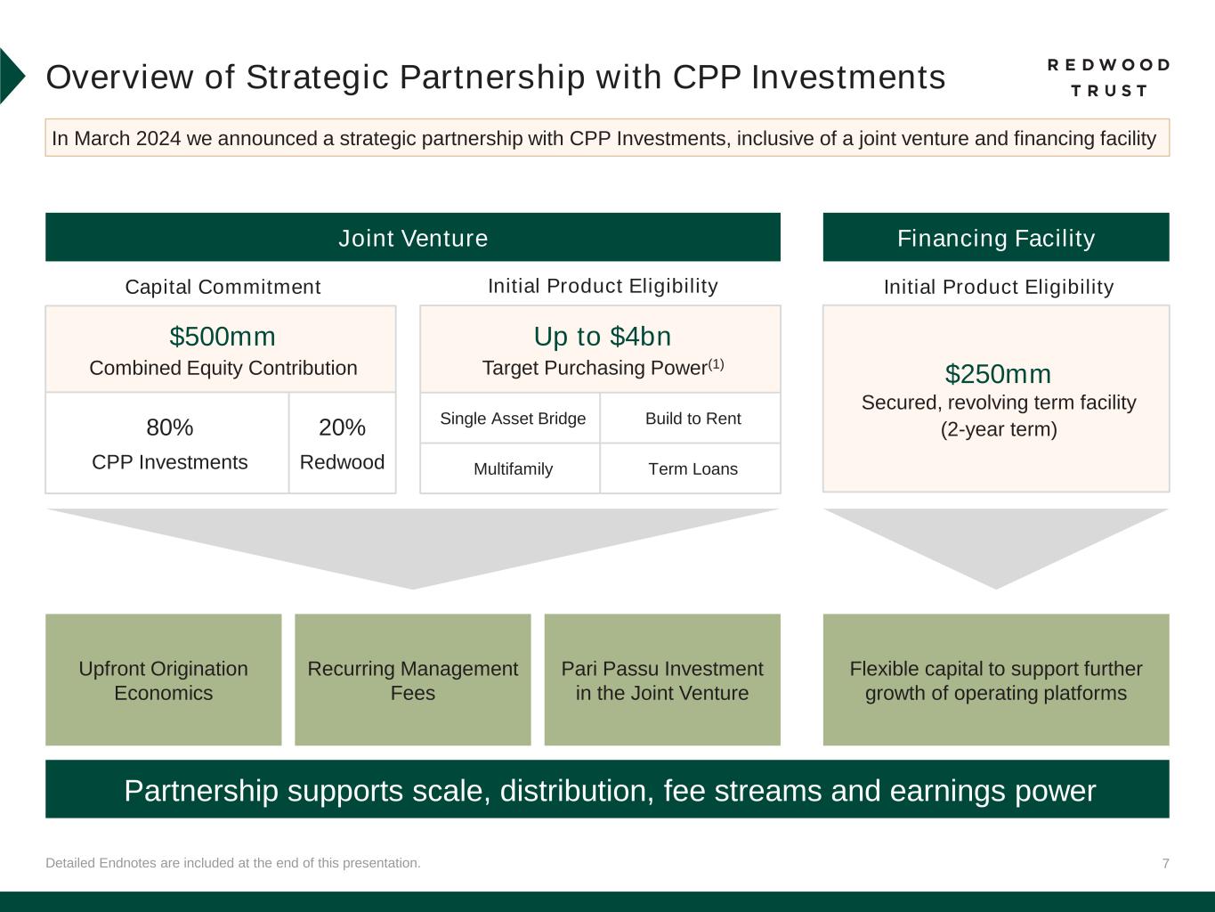 6Detailed Endnotes are included at the end of this presentation. Upward Trajectory for Net Interest Income Through our operating platforms and investments, we are positioned to deliver across market environments, including a potential “higher for longer” scenario In this environment, we are positioned to… (1) Grow revenue through additional earnings streams Deploy capital accretively Growing Net Interest Income & Yield(2) Further increase market share $20.4 $20.1 $24.2 $30.0 7.7% 7.6% 8.5% 10.5% 6.0% 7.0% 8.0% 9.0% 10.0% 11.0% $10 $15 $20 $25 $30 Q3'23 Q4'23 Q1'24 2024 Run-Rate Target Net Interest Income ($mm) Net Interest Income Yield (%) JVs with Oaktree and CPP Investments structured to generate management fees and are expected to generate incremental annual EAD of $0.15 per share when scaled(1) 74 new or re-established banking partners since 2023 and 190+ total loan sellers support volume growth, distribution opportunities and should lead to higher mortgage banking income Accretive deployment has led to more durable insulation to higher rates while also delivering higher net interest income