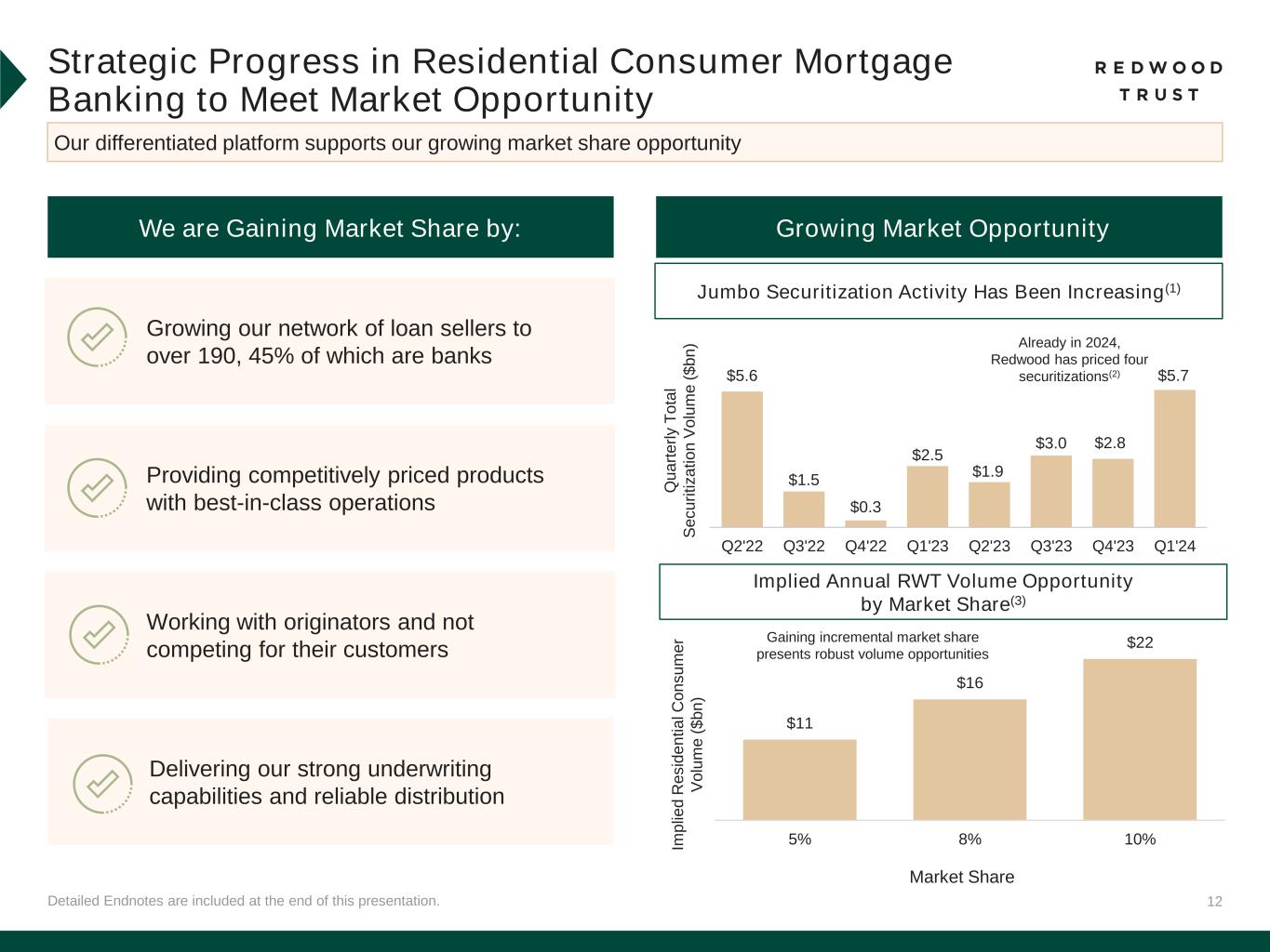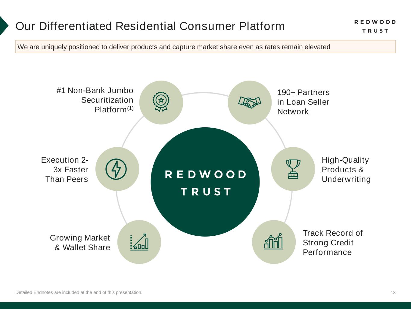 12Detailed Endnotes are included at the end of this presentation. Strategic Progress in Residential Consumer Mortgage Banking to Meet Market Opportunity We are Gaining Market Share by: Jumbo Securitization Activity Has Been Increasing(1) Our differentiated platform supports our growing market share opportunity Growing our network of loan sellers to over 190, 45% of which are banks Providing competitively priced products with best-in-class operations Working with originators and not competing for their customers Delivering our strong underwriting capabilities and reliable distribution Growing Market Opportunity Im p lie d R e s id e n ti a l C o n s u m e r V o lu m e ( $ b n ) Implied Annual RWT Volume Opportunity by Market Share(3) Already in 2024, Redwood has priced four securitizations(2) $11 $16 $22 5% 8% 10% Market Share Gaining incremental market share presents robust volume opportunities $5.6 $1.5 $0.3 $2.5 $1.9 $3.0 $2.8 $5.7 Q2'22 Q3'22 Q4'22 Q1'23 Q2'23 Q3'23 Q4'23 Q1'24 Q u a rt e rl y T o ta l S e c u ri ti z a ti o n V o lu m e ( $ b n )