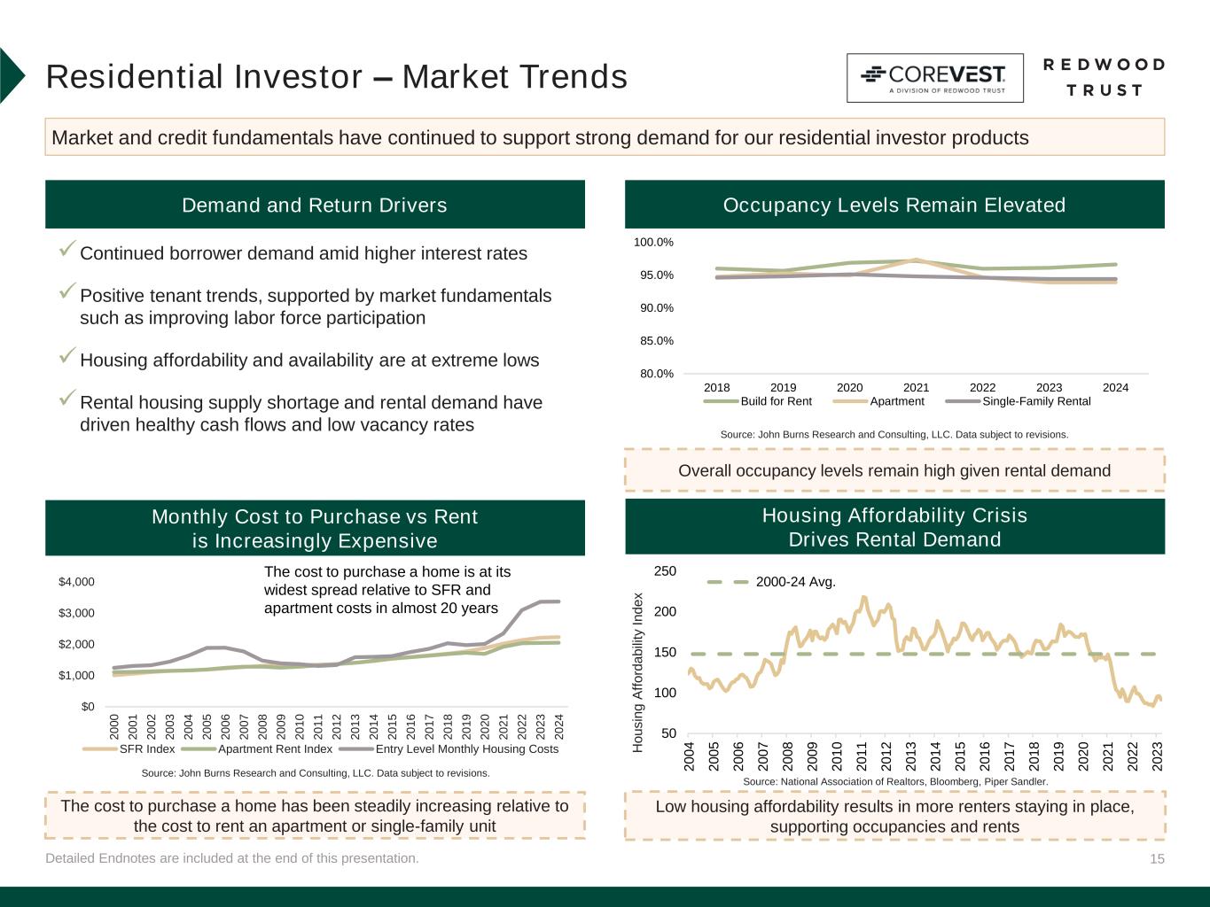14Detailed Endnotes are included at the end of this presentation. • CoreVest funded $326 million of loans in Q1’24 (64% bridge / 36% term) – Even with seasonal first quarter factors, overall volumes were effectively flat quarter over quarter with continued growth in demand for DSCR and SAB production • Segment profitability improved QoQ driven by improved securitization economics • Distributed $59 million of loans through whole loan sales and sales to joint ventures • Announced partnership with CPP Investments which includes joint venture to purchase up to $4 billion of CoreVest originated bridge and term loans(1) Residential Investor Mortgage Banking Composition of Q1’24 Quarterly Fundings(2)Q1’24 Quarterly Overview Quarterly Funded Volume ($mm) We remain focused on originating loans secured by assets with strong fundamentals and business plans with experienced sponsorship teams Term (36%) Bridge (64%) $174 $129 $106 $117 $117 $264 $278 $305 $226 $209 $438 $406 $411 $343 $326 Q1'23 Q2'23 Q3'23 Q4'23 Q1'24 Term Bridge Multifamily 8% Renovate / Build to Rent 40% SAB 16% Term 36% $326mm