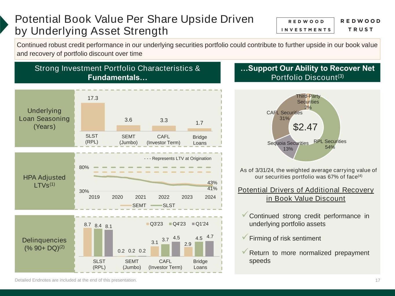 16 MSR/Other, $50 Residential Jumbo (SEMT), $325 SFR (CAFL) Securities, $333 Multifamily Bridge Loans, $890 Single-Family Bridge Loans, $1,159 RPL (SLST) Securities, $271 HEI, $283 Other Investments, $153 Detailed Endnotes are included at the end of this presentation. Note: Numbers may not foot due to rounding. Investment Portfolio During the first quarter, we actively deployed capital into accretive new investments Q1’24 Quarterly Performance $3.5 Billion Housing Credit Investments Organically Created (80%) $1.1bn Residential Consumer $0.4bn (11%) Residential Investor $2.4bn (69%) Third-Party $0.7bn (20%) Figures ($mm) Summary of Investment Portfolio at 3/31/24 by Economic Investments(2) by Capital • Credit fundamentals within our single-family investment portfolio remained strong • We deployed $115 million of capital into organic and third-party assets, our highest quarterly capital deployment since Q3’22 • Looking ahead, we will continue to target new organic and third-party investments for our portfolio with mid-teens returns(1) • $750 million of new or renewed warehouse financing capacity, including $250 million financing facility with CPP Investments • Portfolio secured recourse leverage remained low at 0.9x (3) MSR/Other 3% Residential Jumbo (SEMT) 12% SFR (CAFL) Securities 14% Multifamily Bridge Loans 17% Single-Family Bridge Loans 18% RPL (SLST) Securities 9% HEI 15% Other Investments 12% (3)