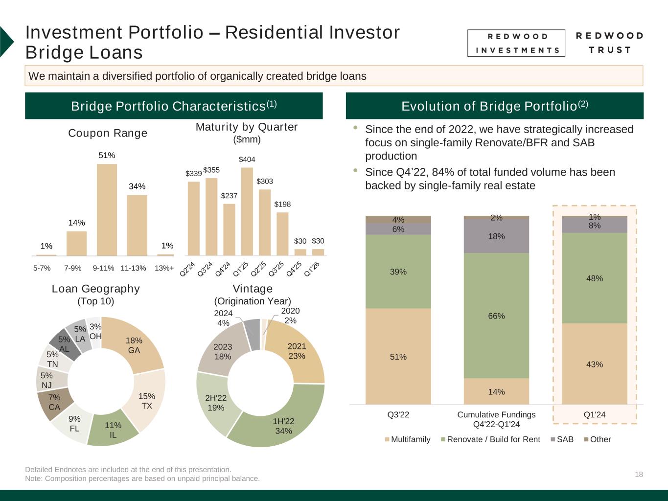 18 1% 14% 51% 34% 1% Detailed Endnotes are included at the end of this presentation. Note: Composition percentages are based on unpaid principal balance. Investment Portfolio – Residential Investor Bridge Loans Bridge Portfolio Characteristics(1) Coupon Range Loan Geography (Top 10) Vintage (Origination Year) Evolution of Bridge Portfolio(2) • Since the end of 2022, we have strategically increased focus on single-family Renovate/BFR and SAB production • Since Q4’22, 84% of total funded volume has been backed by single-family real estate We maintain a diversified portfolio of organically created bridge loans 5-7% 7-9% 9-11% 11-13% 13%+ 2020 2% 2021 23% 1H'22 34% 2H'22 19% 2023 18% 2024 4% $339 $355 $237 $404 $303 $198 $30 $30 Maturity by Quarter ($mm) 18% GA 15% TX 11% IL 9% FL 7% CA 5% NJ 5% TN 5% AL 5% LA 3% OH 51% 14% 43% 39% 66% 48% 6% 18% 8% 4% 2% 1% Q3'22 Cumulative Fundings Q4'22-Q1'24 Q1'24 Multifamily Renovate / Build for Rent SAB Other