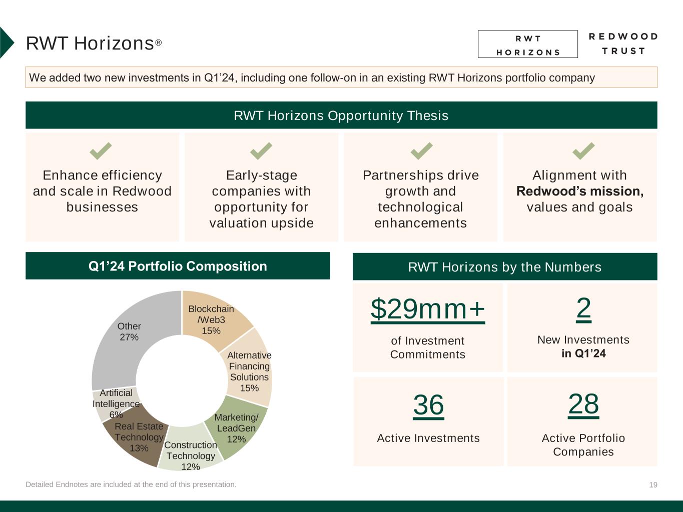 32 Slide 18 (Investment Portfolio – Residential Investor Bridge Loans)​ Source: Company financial data as of March 31, 2024 unless otherwise noted. 1. Represents the market value of our bridge loans held for investment and held for sale at the time periods presented. Excludes REO loans. 2. Excludes REO loans. Slide 19 (RWT Horizons) Source: Company financial data as of March 31, 2024 unless otherwise noted. Slide 21 (Appendix: Income Statement) 1. Net interest expense from “Corporate (unsecured debt)” consists primarily of interest expense on corporate unsecured debt as well as net interest income from Legacy Sequoia consolidated VIEs. Slide 23 (Appendix: Capital Allocation Summary) 1. Amounts of assets in our Investment Portfolio, as presented in this table, represent our economic interests (including our economic interests in consolidated VIEs) and do not present the assets within VIEs that we consolidate under GAAP (except for our CAFL Bridge VIEs and SLST resecuritization). See our GAAP Balance Sheet and Reconciliation to Non-GAAP Economic Balance Sheet in the Supplemental Financial Tables available on our website for additional information on consolidated VIEs. 2. Consistent with our presentation of assets within this table, non-recourse debt presented within this table excludes ABS issued from certain securitizations consolidated on our balance sheet, including Residential Jumbo (SEMT), BPL Term (CAFL), Freddie Mac SLST and K-Series, and HEI, as well as non-recourse debt used to finance certain servicing investments. 3. Capital allocated to mortgage banking operations represents the working capital we have allocated to manage our loan inventory at each of our operating businesses. This amount generally includes our net capital in loans held on balance sheet (net of financing), capital to acquire loans in our pipeline, net capital utilized for hedges, and risk capital. 4. Corporate capital includes, among other things, capital allocated to RWT Horizons and other strategic investments as well as available capital. Endnotes Slide 24 (Appendix: Mortgage Banking Key Results) 1. EAD Net Contribution and EAD Net Contribution Return on Capital are non-GAAP measures. Please refer to Non-GAAP Measures within the Endnotes section of this presentation for additional information on these measures. 2. Capital utilized for Residential Investor Mortgage Banking operations does not include $49 million of platform premium. Slide 25 (Appendix: Investment Portfolio Key Results) 1. EAD Net Contribution and EAD Net Contribution Return on Capital are non-GAAP measures. Please refer to Non-GAAP Measures within the Endnotes section of this presentation for more information on these measures. 2. Recourse leverage ratio is calculated as Secured recourse debt balances divided by Capital invested, as presented within this table. Slide 26 (Appendix: Recourse Debt Balances) 1. Non-marginable debt and marginable debt refers to whether such debt is subject to margin calls based solely on the lender’s determination in its discretion of the market value of underlying collateral that is non-delinquent. Non-marginable debt may be subject to a margin call due to delinquency or another credit event related to the mortgage or security being financed, a decline in the value of the underlying asset securing the collateral, an extended dwell time (i.e., period of time financed using a particular financing facility) for certain types of loans, or a change in the interest rate of a specified reference security relative to a base interest rate amount, among other reasons. 2. Average borrowing cost represents the weighted average contractual cost of recourse debt outstanding at the end of each period presented and does not include deferred issuance costs or debt discounts. 3. Includes certificated mortgage servicing rights.