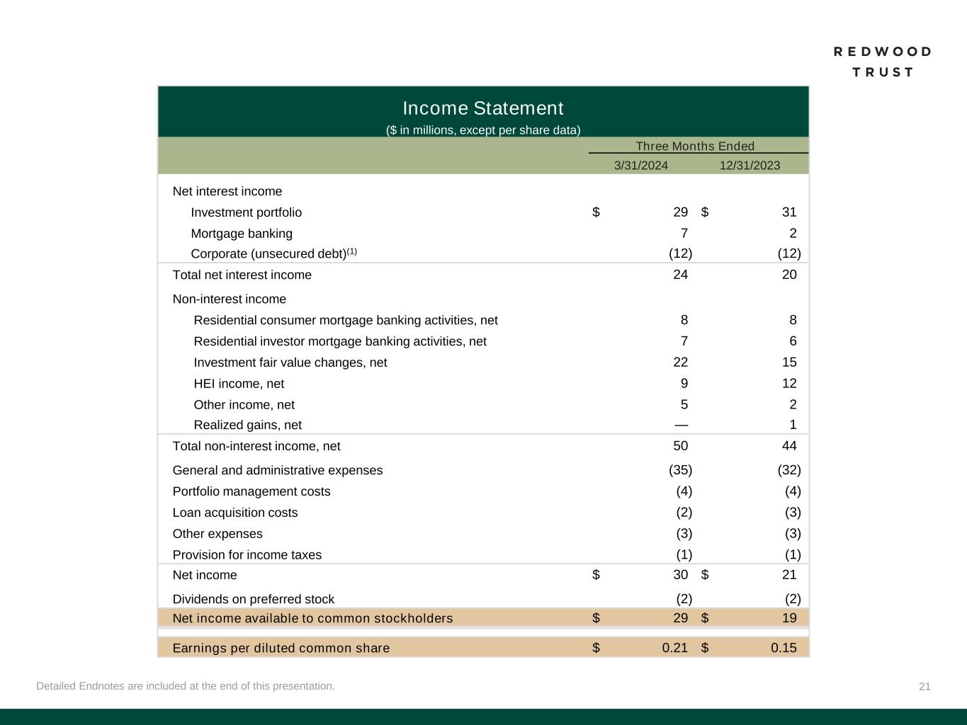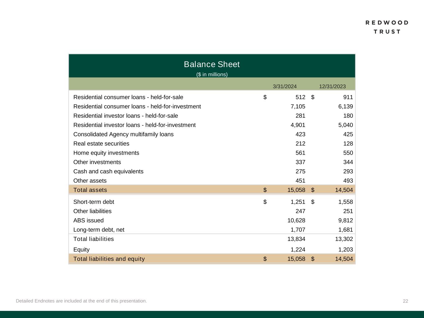 21Detailed Endnotes are included at the end of this presentation. Income Statement ($ in millions, except per share data) Three Months Ended 3/31/2024 12/31/2023 Net interest income Investment portfolio $ 29 $ 31 Mortgage banking 7 2 Corporate (unsecured debt)(1) (12) (12) Total net interest income 24 20 Non-interest income Residential consumer mortgage banking activities, net 8 8 Residential investor mortgage banking activities, net 7 6 Investment fair value changes, net 22 15 HEI income, net 9 12 Other income, net 5 2 Realized gains, net — 1 Total non-interest income, net 50 44 General and administrative expenses (35) (32) Portfolio management costs (4) (4) Loan acquisition costs (2) (3) Other expenses (3) (3) Provision for income taxes (1) (1) Net income $ 30 $ 21 Dividends on preferred stock (2) (2) Net income available to common stockholders $ 29 $ 19 Earnings per diluted common share $ 0.21 $ 0.15