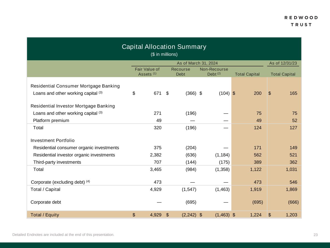 22Detailed Endnotes are included at the end of this presentation. Balance Sheet ($ in millions) 3/31/2024 12/31/2023 Residential consumer loans - held-for-sale $ 512 $ 911 Residential consumer loans - held-for-investment 7,105 6,139 Residential investor loans - held-for-sale 281 180 Residential investor loans - held-for-investment 4,901 5,040 Consolidated Agency multifamily loans 423 425 Real estate securities 212 128 Home equity investments 561 550 Other investments 337 344 Cash and cash equivalents 275 293 Other assets 451 493 Total assets $ 15,058 $ 14,504 Short-term debt $ 1,251 $ 1,558 Other liabilities 247 251 ABS issued 10,628 9,812 Long-term debt, net 1,707 1,681 Total liabilities 13,834 13,302 Equity 1,224 1,203 Total liabilities and equity $ 15,058 $ 14,504