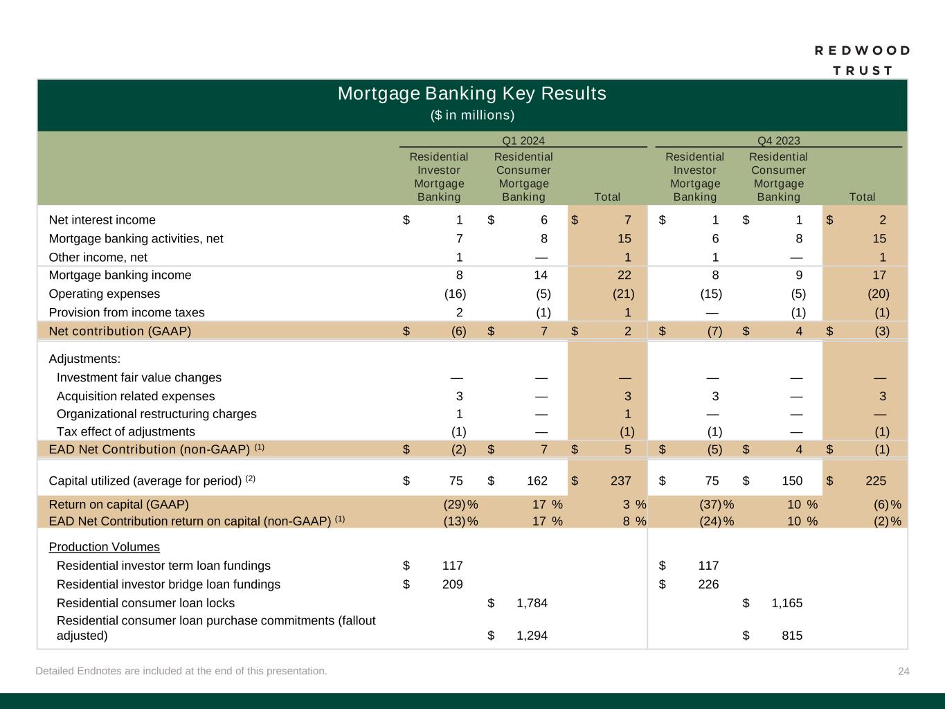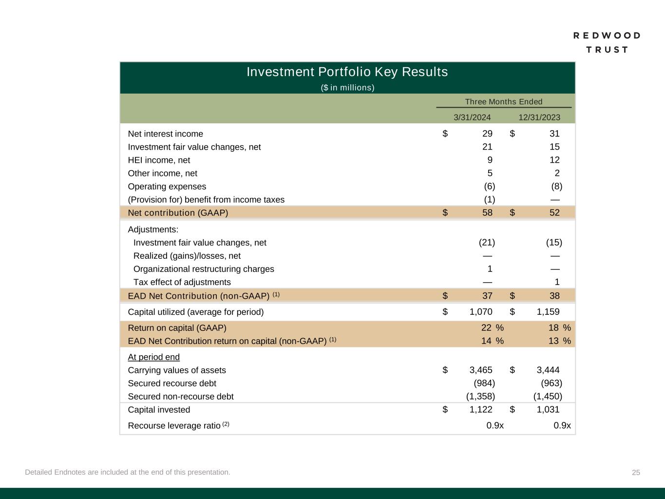 24Detailed Endnotes are included at the end of this presentation. Mortgage Banking Key Results ($ in millions) Q1 2024 Q4 2023 Residential Investor Mortgage Banking Residential Consumer Mortgage Banking Total Residential Investor Mortgage Banking Residential Consumer Mortgage Banking Total Net interest income $ 1 $ 6 $ 7 $ 1 $ 1 $ 2 Mortgage banking activities, net 7 8 15 6 8 15 Other income, net 1 — 1 1 — 1 Mortgage banking income 8 14 22 8 9 17 Operating expenses (16) (5) (21) (15) (5) (20) Provision from income taxes 2 (1) 1 — (1) (1) Net contribution (GAAP) $ (6) $ 7 $ 2 $ (7) $ 4 $ (3) Adjustments: Investment fair value changes — — — — — — Acquisition related expenses 3 — 3 3 — 3 Organizational restructuring charges 1 — 1 — — — Tax effect of adjustments (1) — (1) (1) — (1) EAD Net Contribution (non-GAAP) (1) $ (2) $ 7 $ 5 $ (5) $ 4 $ (1) Capital utilized (average for period) (2) $ 75 $ 162 $ 237 $ 75 $ 150 $ 225 Return on capital (GAAP) (29)% 17 % 3 % (37)% 10 % (6)% EAD Net Contribution return on capital (non-GAAP) (1) (13)% 17 % 8 % (24)% 10 % (2)% Production Volumes Residential investor term loan fundings $ 117 $ 117 Residential investor bridge loan fundings $ 209 $ 226 Residential consumer loan locks $ 1,784 $ 1,165 Residential consumer loan purchase commitments (fallout adjusted) $ 1,294 $ 815