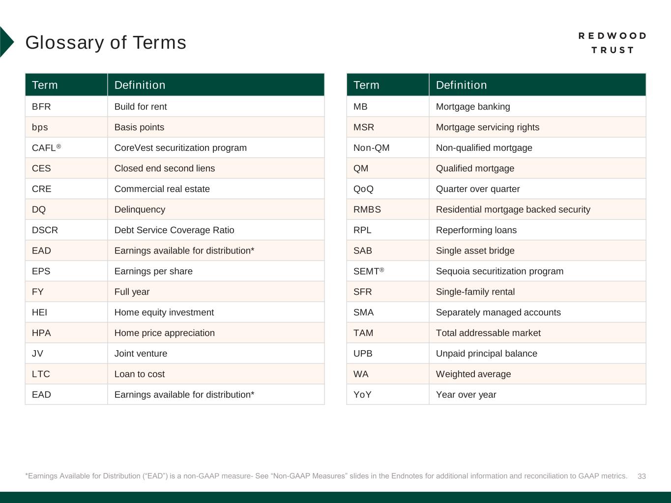 33*Earnings Available for Distribution (“EAD”) is a non-GAAP measure- See “Non-GAAP Measures” slides in the Endnotes for additional information and reconciliation to GAAP metrics. Glossary of Terms Term Definition BFR Build for rent bps Basis points CAFL® CoreVest securitization program CES Closed end second liens CRE Commercial real estate DQ Delinquency DSCR Debt Service Coverage Ratio EAD Earnings available for distribution* EPS Earnings per share FY Full year HEI Home equity investment HPA Home price appreciation JV Joint venture LTC Loan to cost EAD Earnings available for distribution* Term Definition MB Mortgage banking MSR Mortgage servicing rights Non-QM Non-qualified mortgage QM Qualified mortgage QoQ Quarter over quarter RMBS Residential mortgage backed security RPL Reperforming loans SAB Single asset bridge SEMT® Sequoia securitization program SFR Single-family rental SMA Separately managed accounts TAM Total addressable market UPB Unpaid principal balance WA Weighted average YoY Year over year