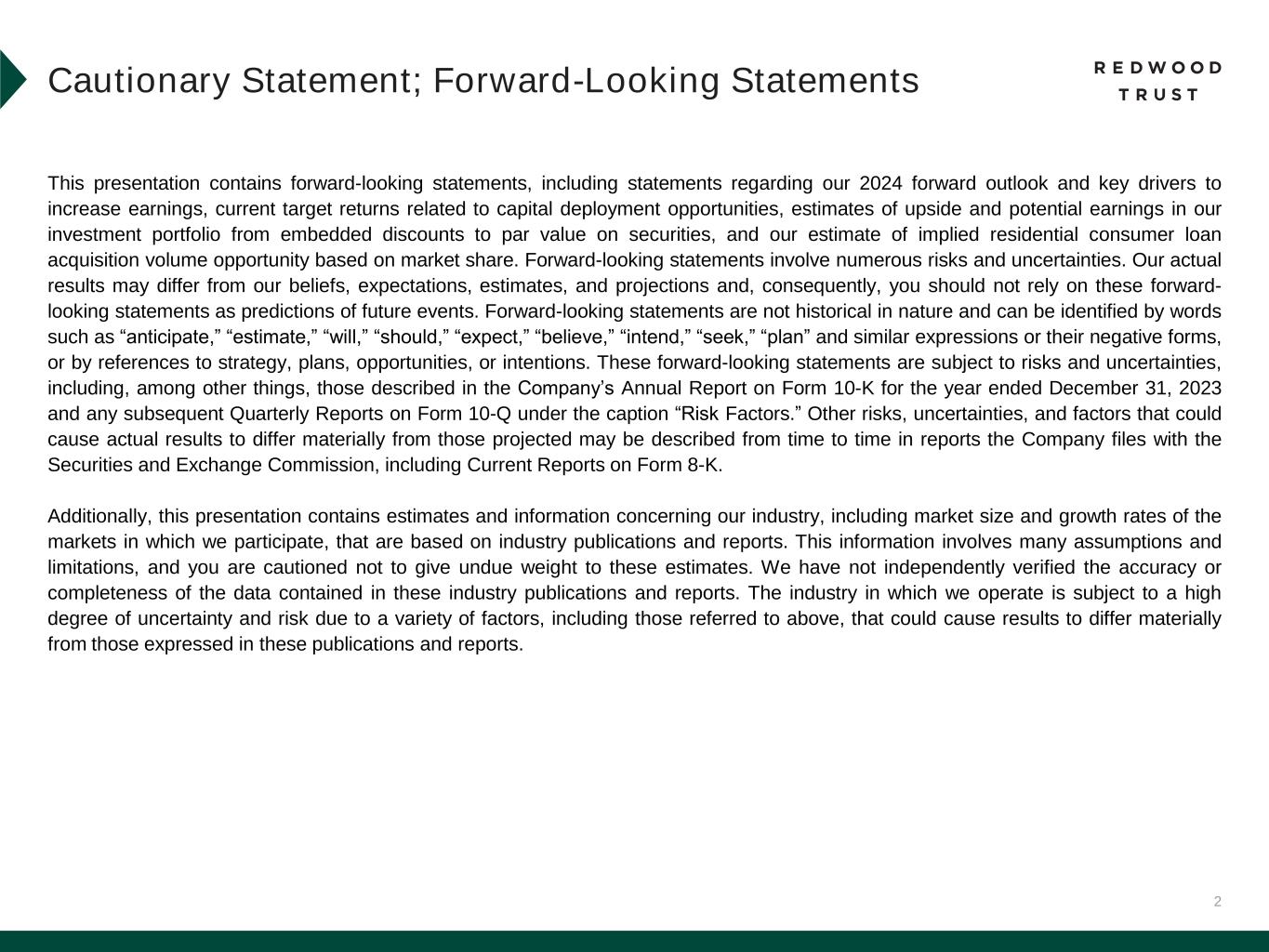 2 This presentation contains forward-looking statements, including statements regarding our 2024 forward outlook and key drivers to increase earnings, current target returns related to capital deployment opportunities, estimates of upside and potential earnings in our investment portfolio from embedded discounts to par value on securities, and our estimate of implied residential consumer loan acquisition volume opportunity based on market share. Forward-looking statements involve numerous risks and uncertainties. Our actual results may differ from our beliefs, expectations, estimates, and projections and, consequently, you should not rely on these forward- looking statements as predictions of future events. Forward-looking statements are not historical in nature and can be identified by words such as “anticipate,” “estimate,” “will,” “should,” “expect,” “believe,” “intend,” “seek,” “plan” and similar expressions or their negative forms, or by references to strategy, plans, opportunities, or intentions. These forward-looking statements are subject to risks and uncertainties, including, among other things, those described in the Company’s Annual Report on Form 10-K for the year ended December 31, 2023 and any subsequent Quarterly Reports on Form 10-Q under the caption “Risk Factors.” Other risks, uncertainties, and factors that could cause actual results to differ materially from those projected may be described from time to time in reports the Company files with the Securities and Exchange Commission, including Current Reports on Form 8-K. Additionally, this presentation contains estimates and information concerning our industry, including market size and growth rates of the markets in which we participate, that are based on industry publications and reports. This information involves many assumptions and limitations, and you are cautioned not to give undue weight to these estimates. We have not independently verified the accuracy or completeness of the data contained in these industry publications and reports. The industry in which we operate is subject to a high degree of uncertainty and risk due to a variety of factors, including those referred to above, that could cause results to differ materially from those expressed in these publications and reports. Cautionary Statement; Forward-Looking Statements