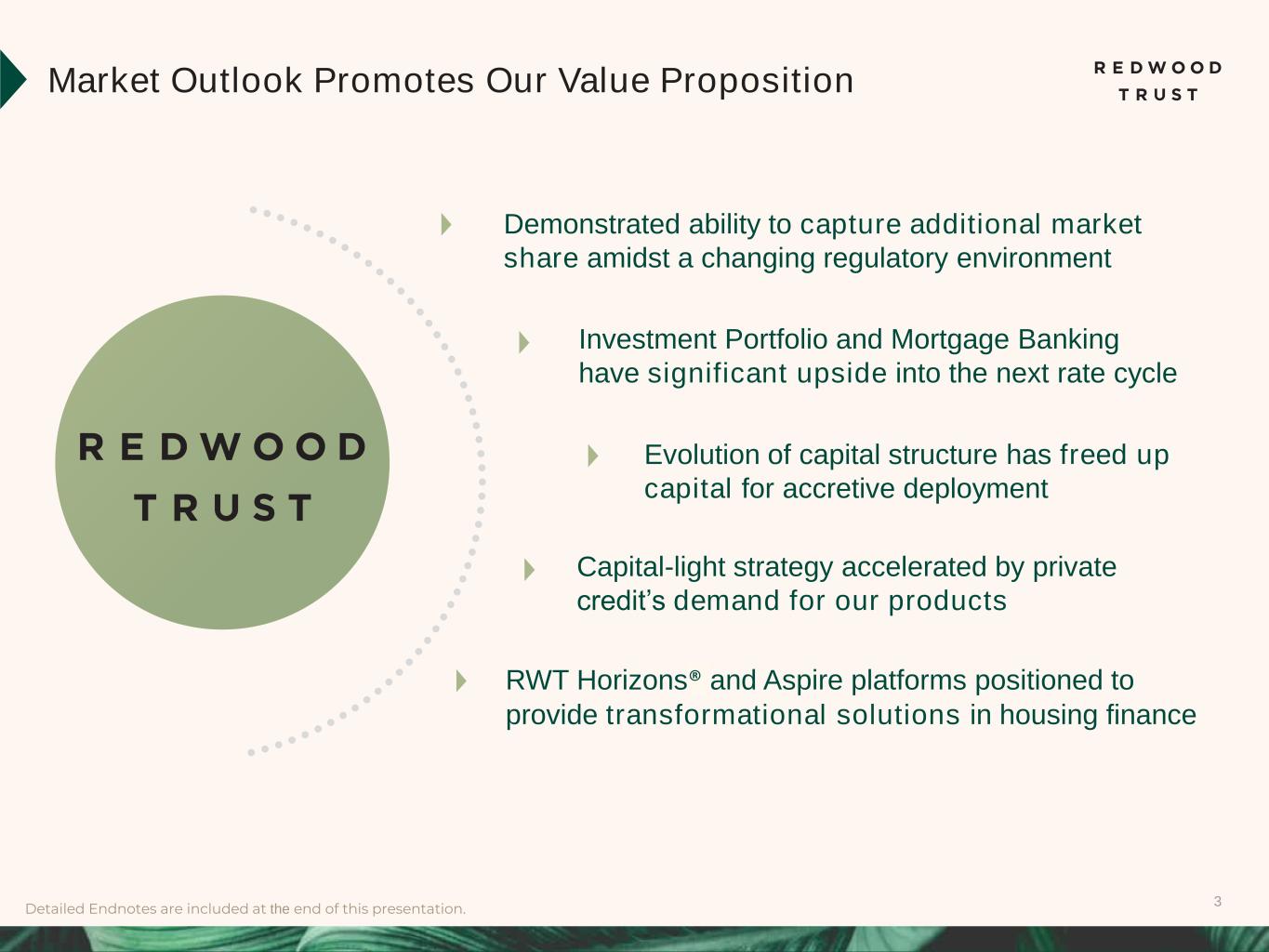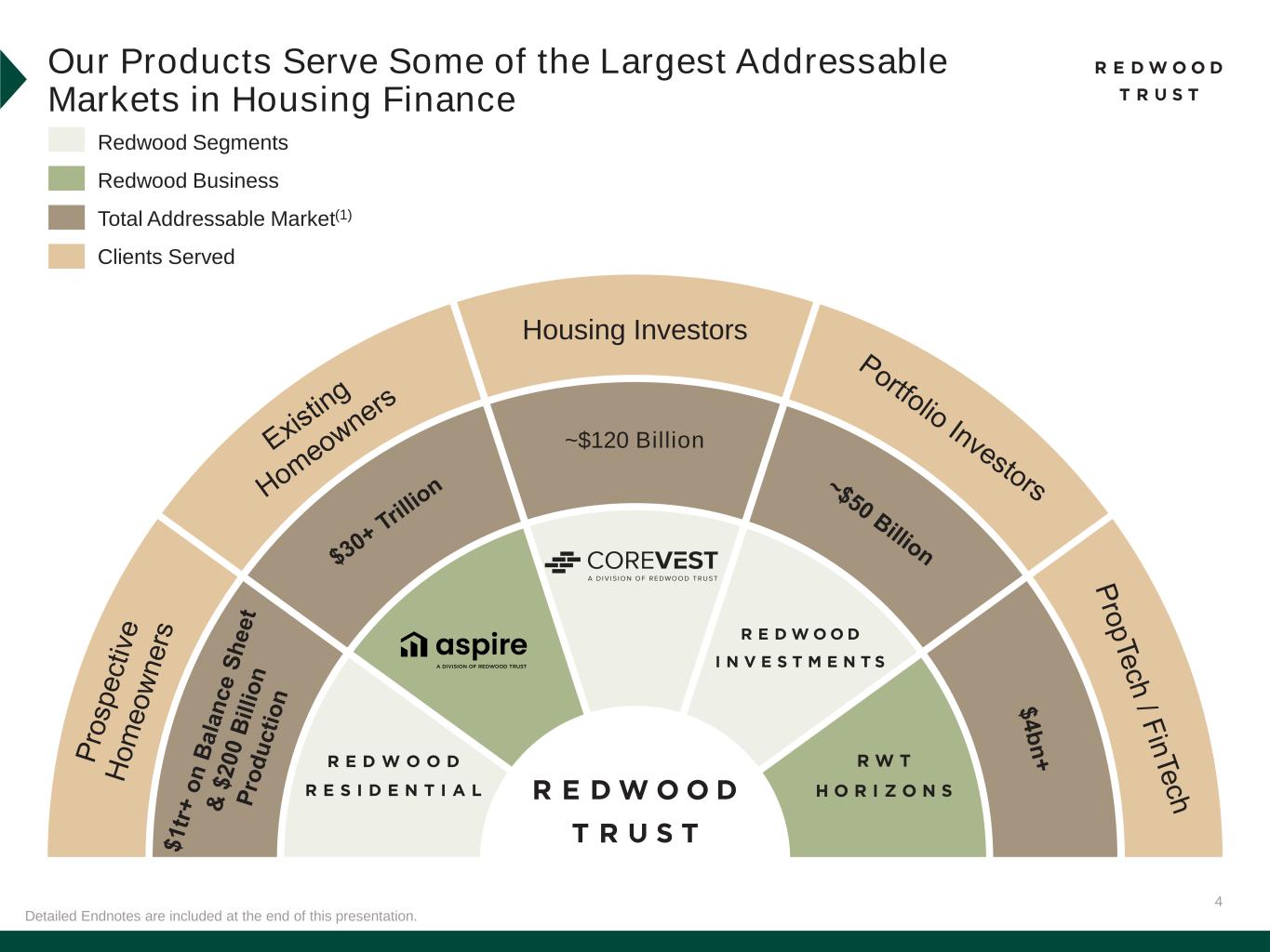 3Detailed Endnotes are included at the end of this presentation. Market Outlook Promotes Our Value Proposition RWT Horizons® and Aspire platforms positioned to provide transformational solutions in housing finance Capital-light strategy accelerated by private credit’s demand for our products Evolution of capital structure has freed up capital for accretive deployment Investment Portfolio and Mortgage Banking have significant upside into the next rate cycle Demonstrated ability to capture additional market share amidst a changing regulatory environment