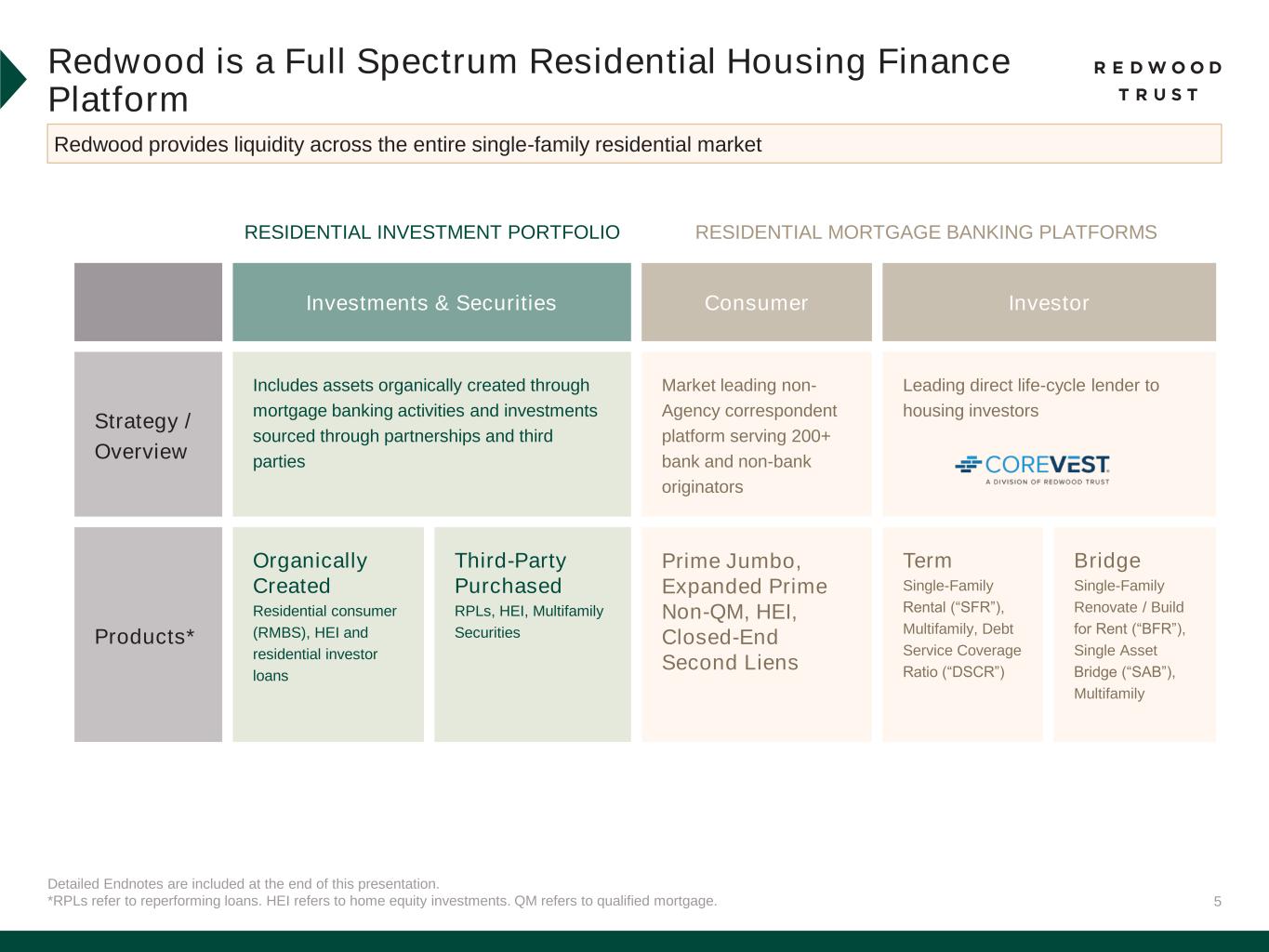 4 Detailed Endnotes are included at the end of this presentation. Our Products Serve Some of the Largest Addressable Markets in Housing Finance ~$120 Billion Housing Investors Redwood Segments Total Addressable Market(1) Clients Served Redwood Business