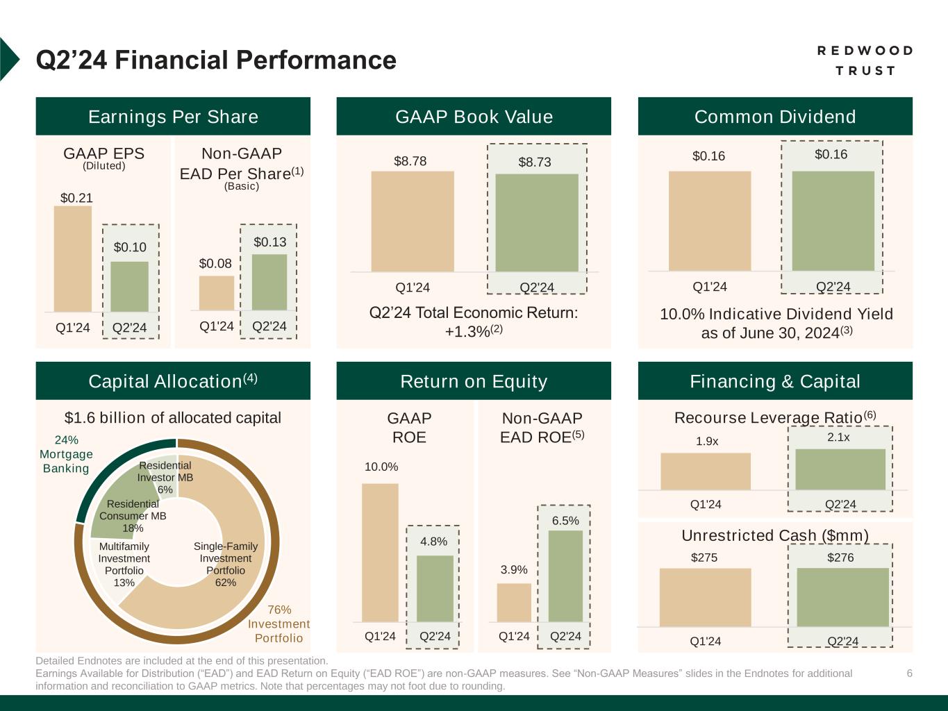 5 Detailed Endnotes are included at the end of this presentation. *RPLs refer to reperforming loans. HEI refers to home equity investments. QM refers to qualified mortgage. Redwood is a Full Spectrum Residential Housing Finance Platform Redwood provides liquidity across the entire single-family residential market Investments & Securities Consumer Investor Strategy / Overview Includes assets organically created through mortgage banking activities and investments sourced through partnerships and third parties Market leading non- Agency correspondent platform serving 200+ bank and non-bank originators Leading direct life-cycle lender to housing investors Products* Organically Created Residential consumer (RMBS), HEI and residential investor loans Third-Party Purchased RPLs, HEI, Multifamily Securities Prime Jumbo, Expanded Prime Non-QM, HEI, Closed-End Second Liens Term Single-Family Rental (“SFR”), Multifamily, Debt Service Coverage Ratio (“DSCR”) Bridge Single-Family Renovate / Build for Rent (“BFR”), Single Asset Bridge (“SAB”), Multifamily RESIDENTIAL INVESTMENT PORTFOLIO RESIDENTIAL MORTGAGE BANKING PLATFORMS